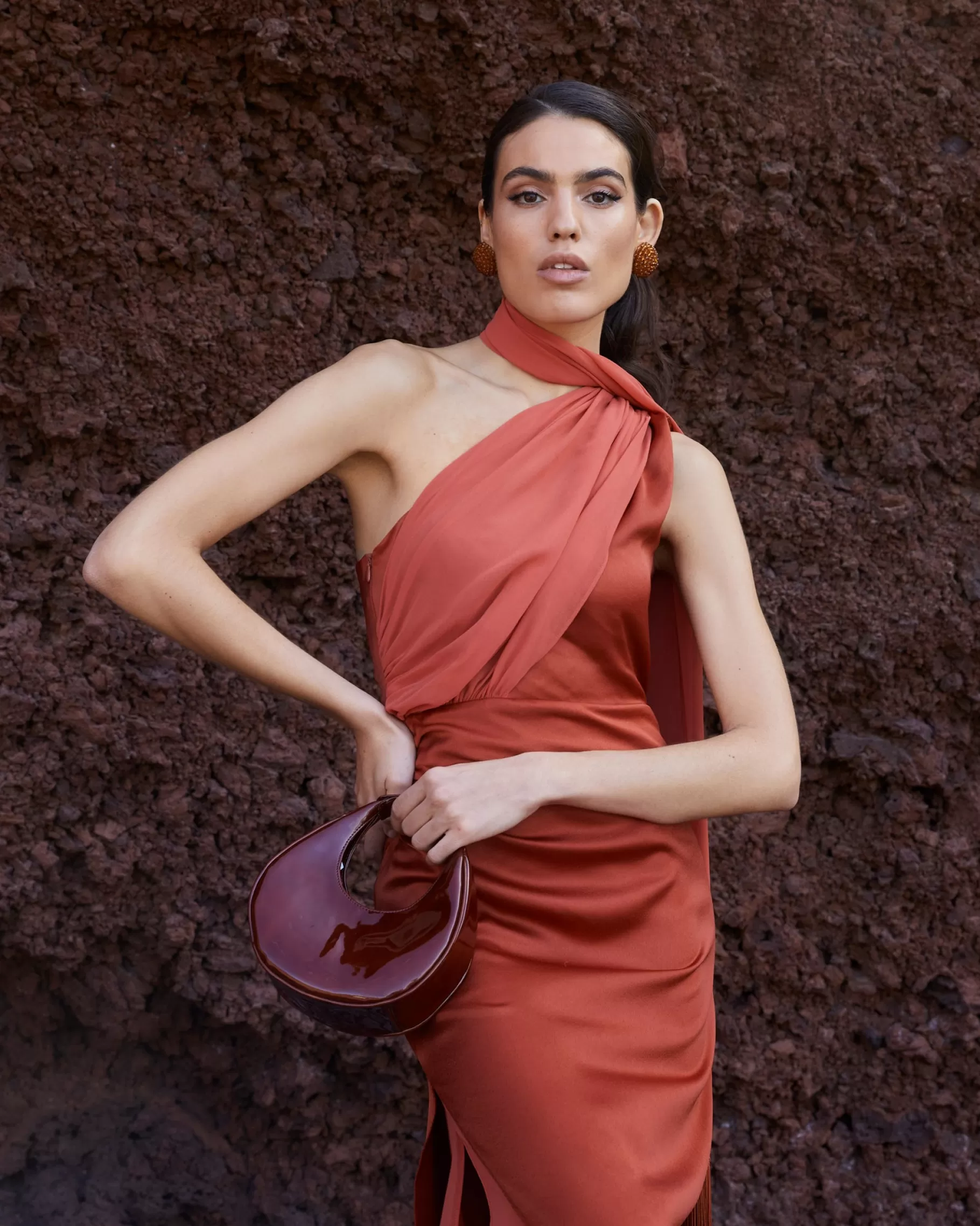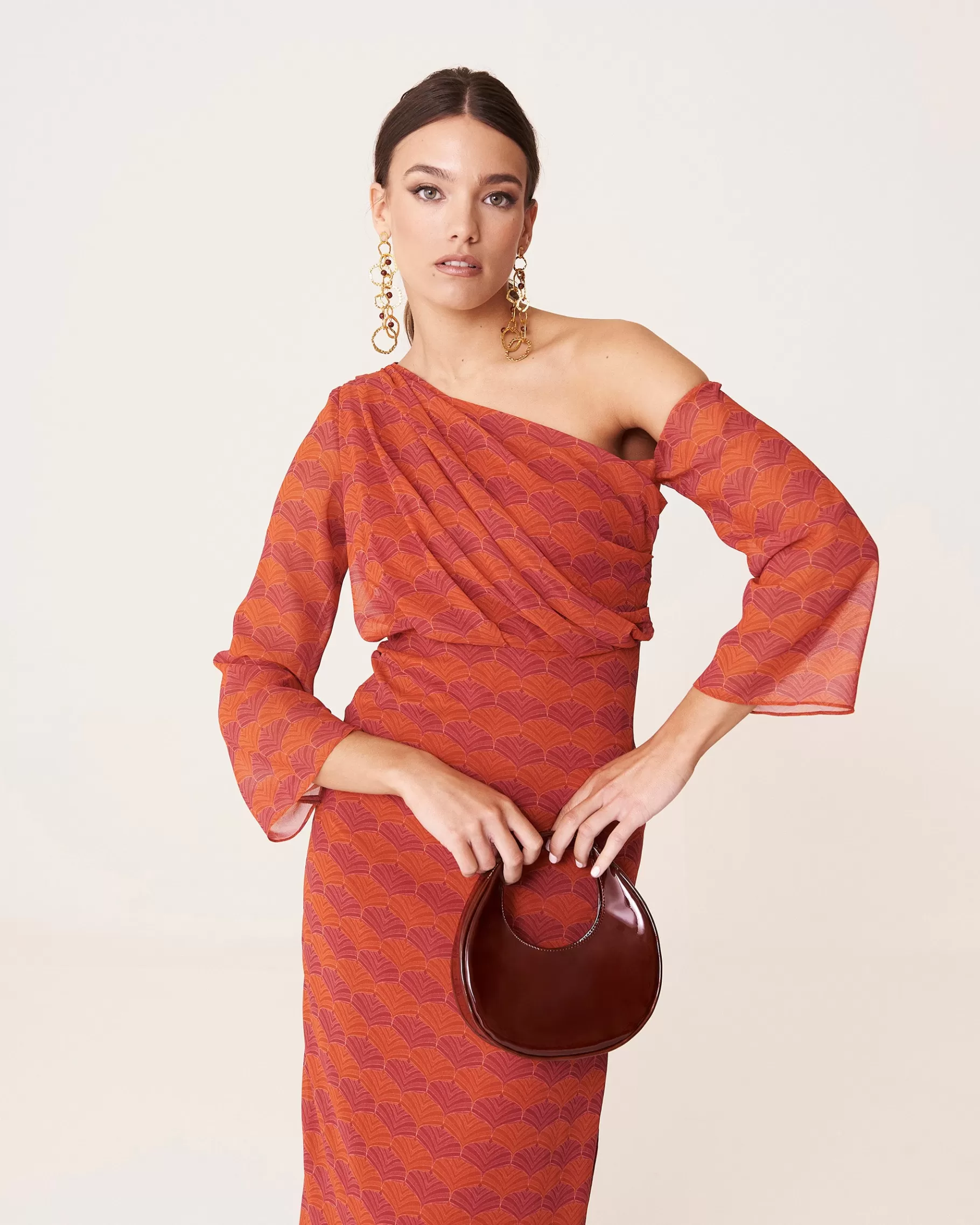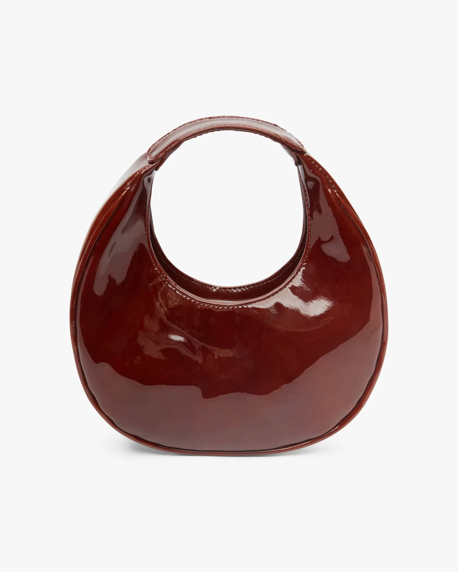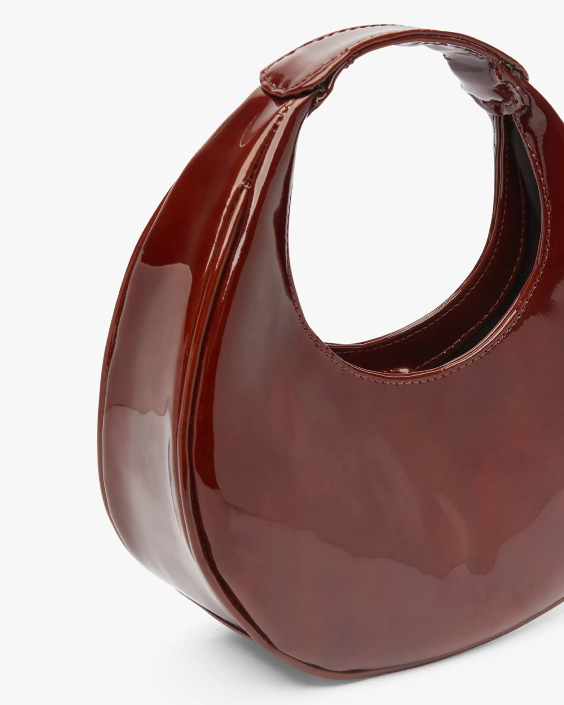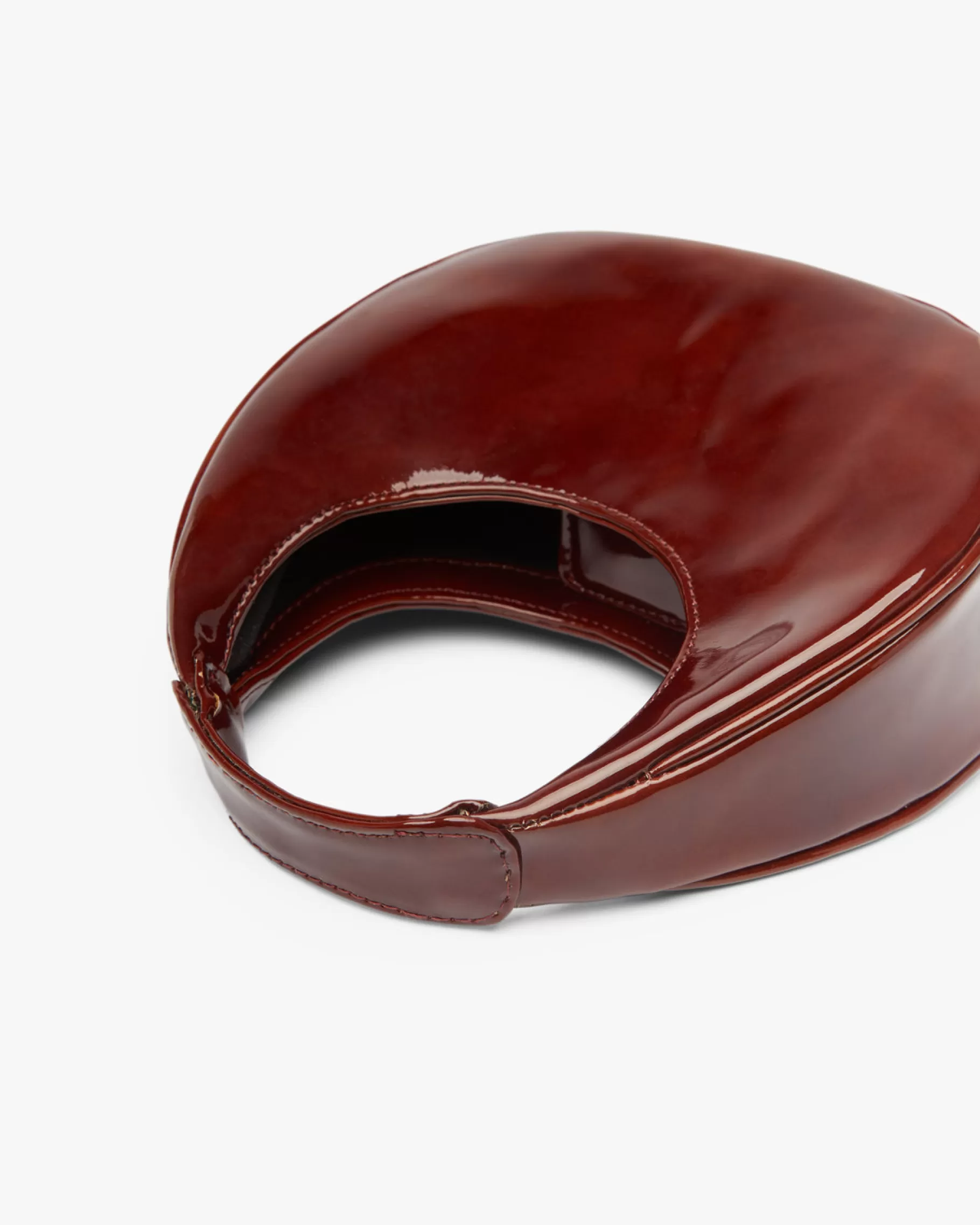 Bolso con forma de luna, asa de mano y cierre magnético.