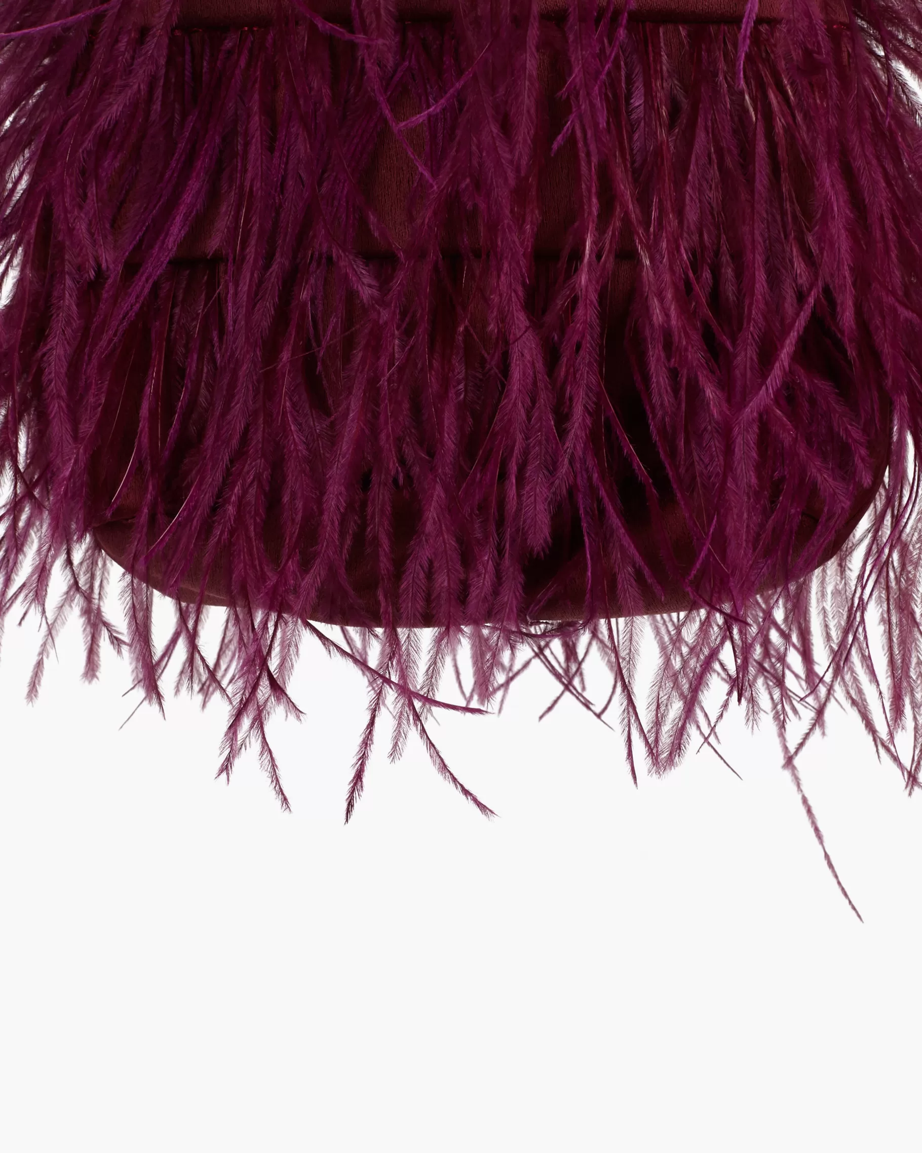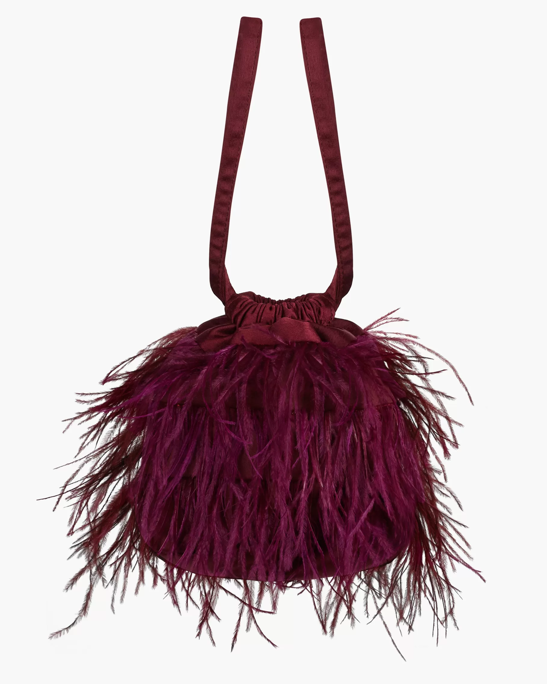 Bolso bombonera con cierre de cordones largos que se convierten en asas y detalle de plumas al tono.