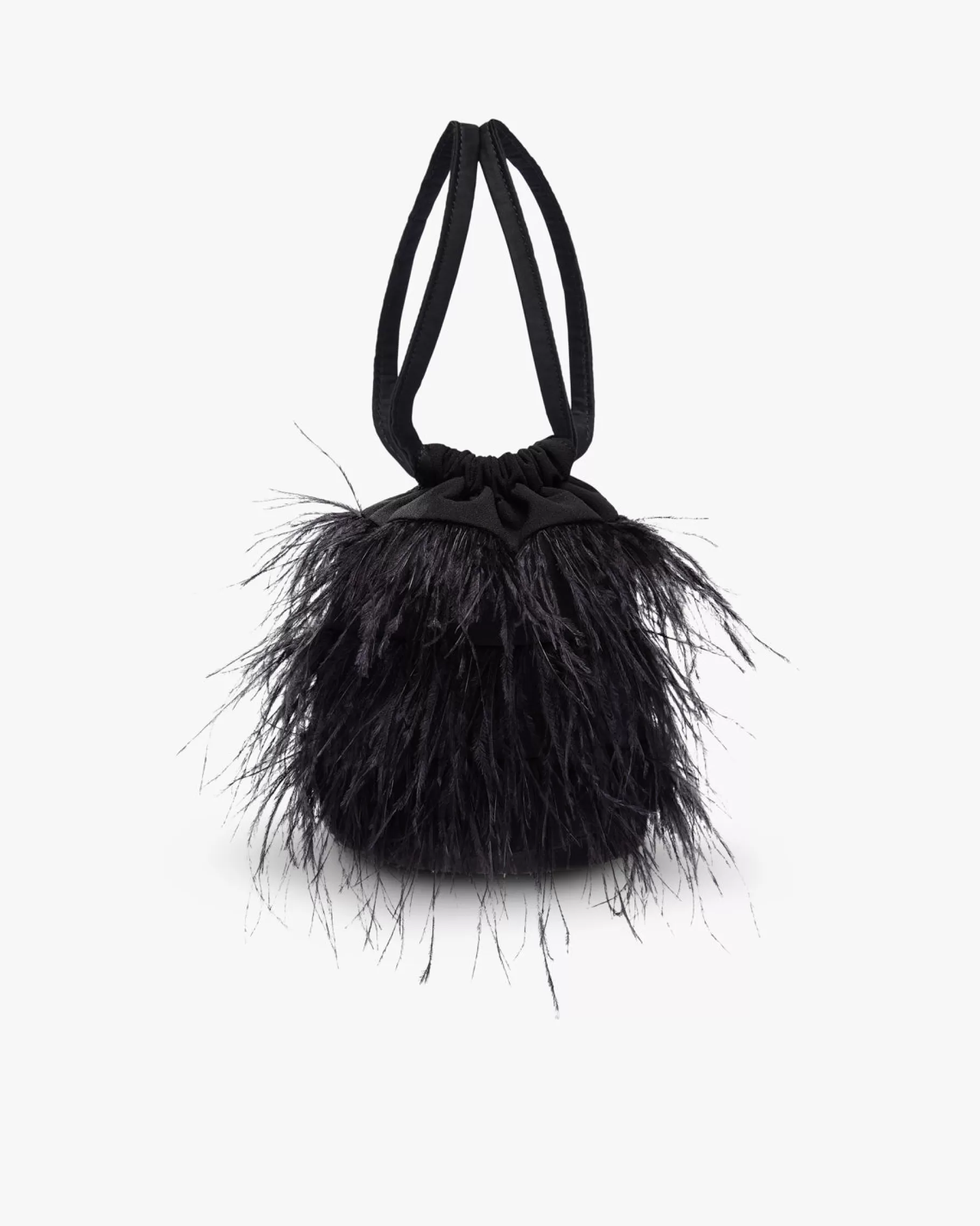 Bolso bombonera con cierre de cordones largos que se convierten en asas y detalle de plumas al tono.