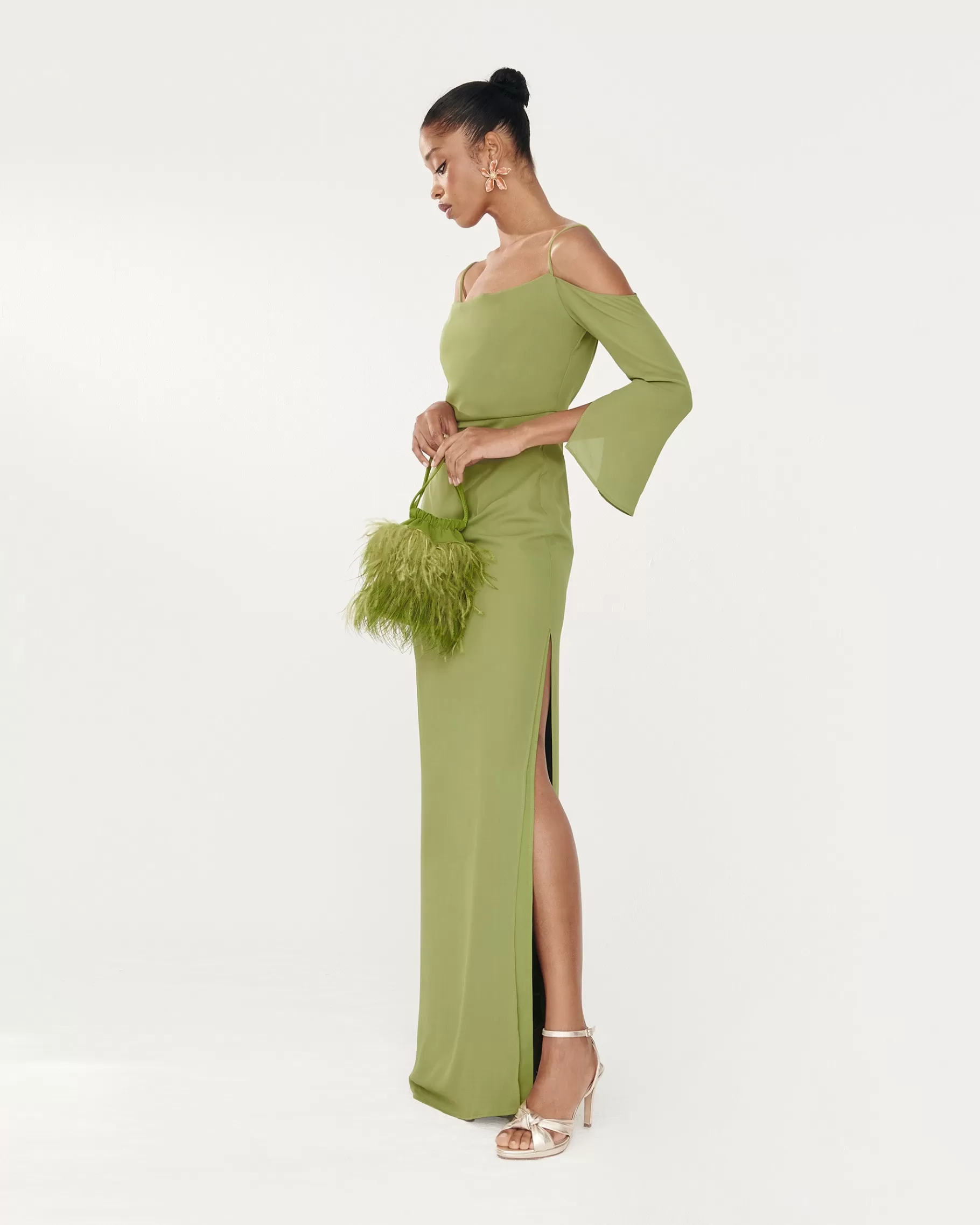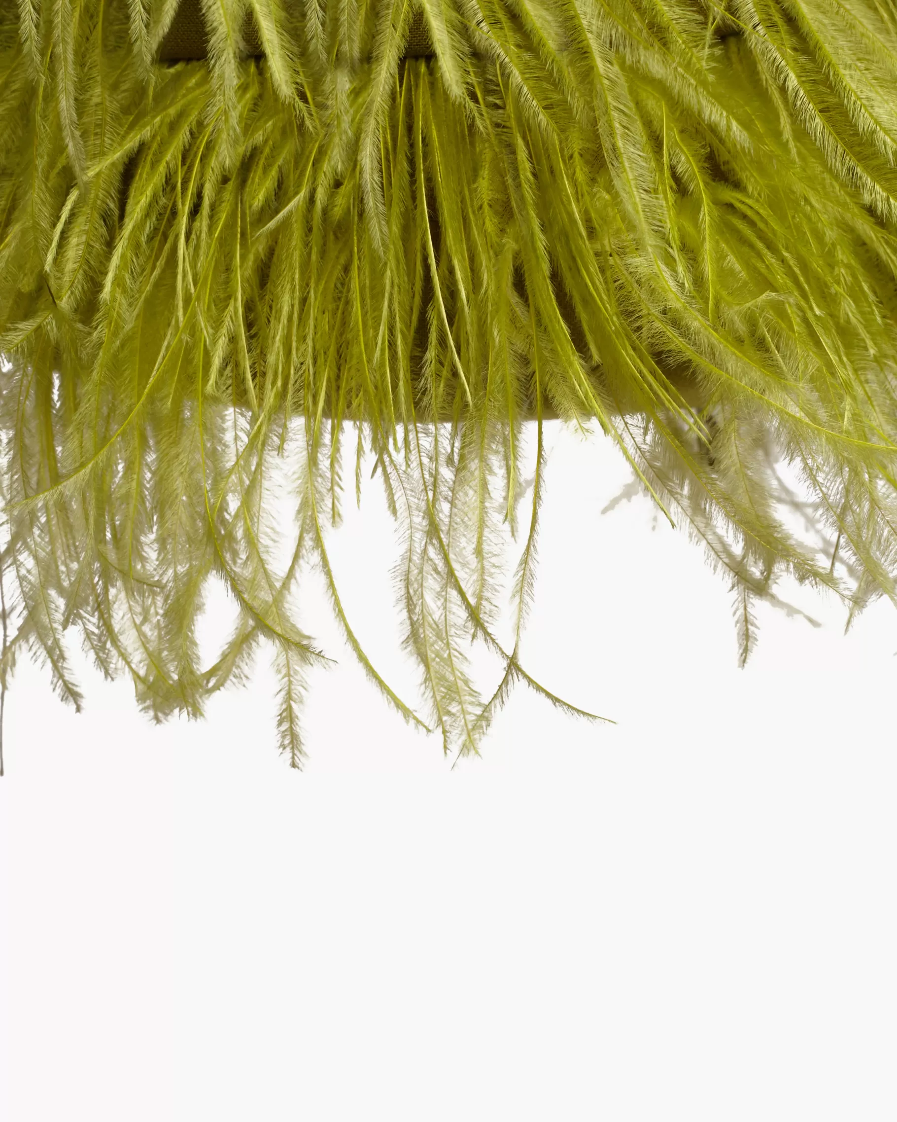 Bolso bombonera con cierre de cordones largos que se convierten en asas y detalle de plumas al tono.