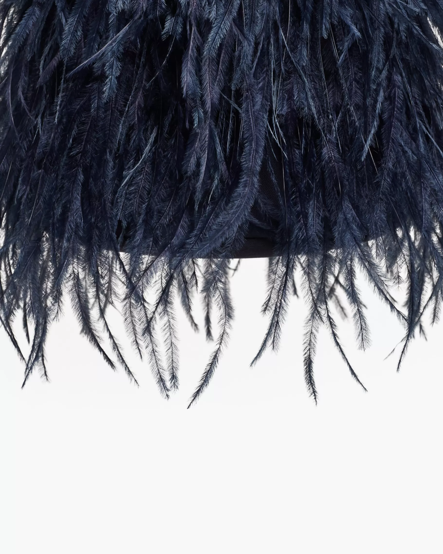 Bolso bombonera con cierre de cordones largos que se convierten en asas y detalle de plumas al tono.