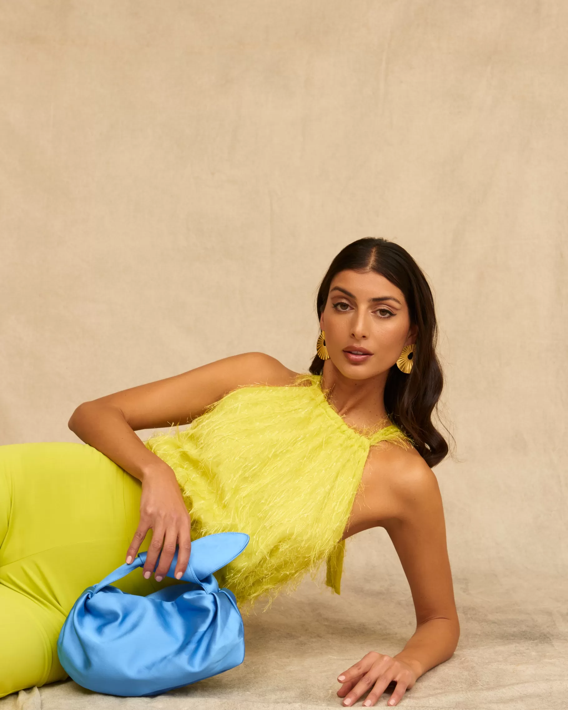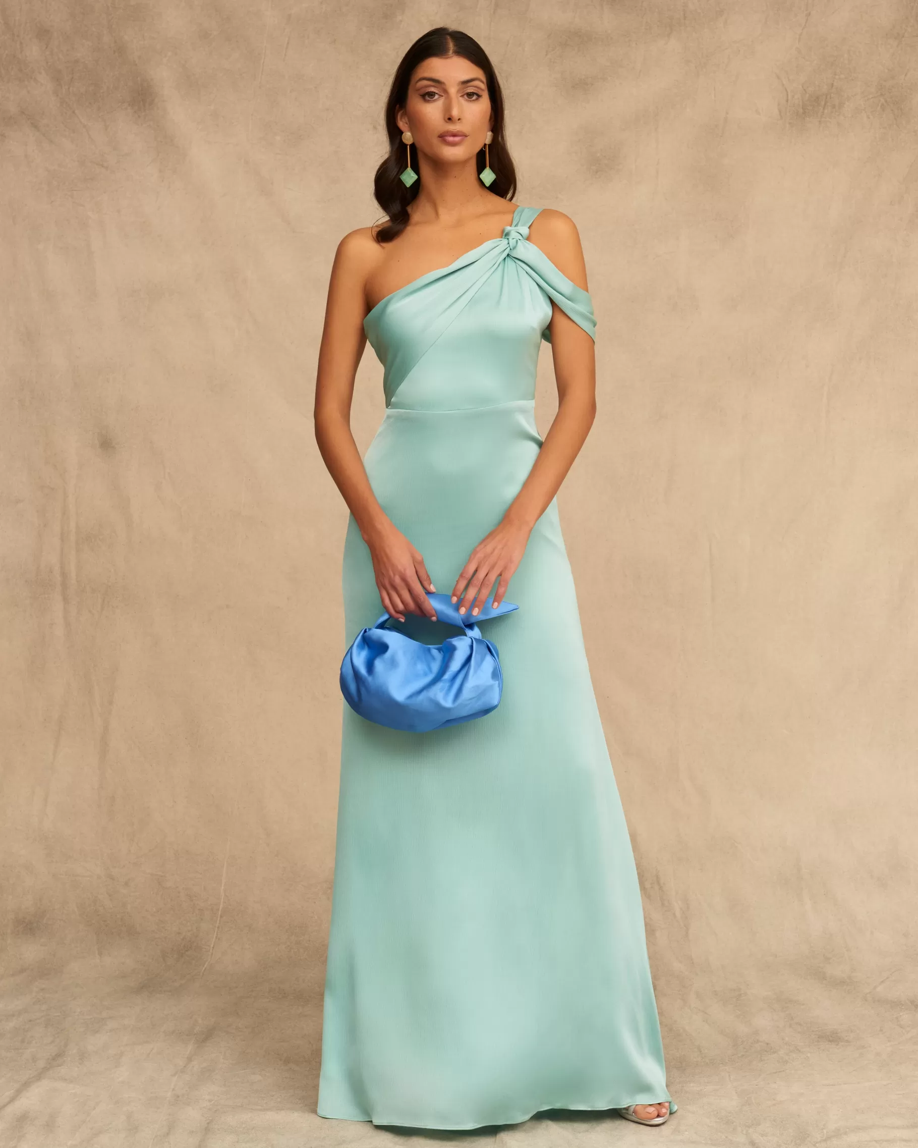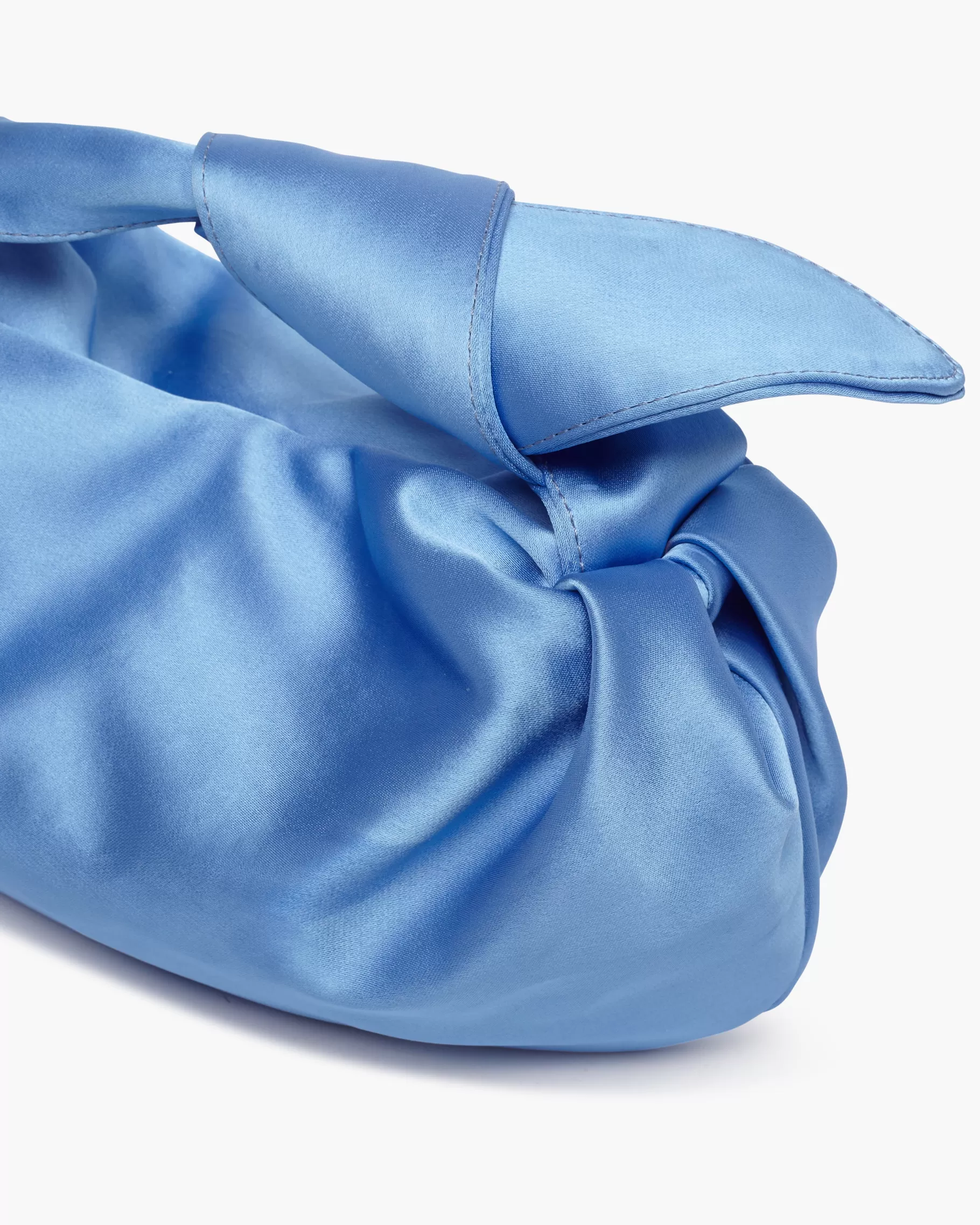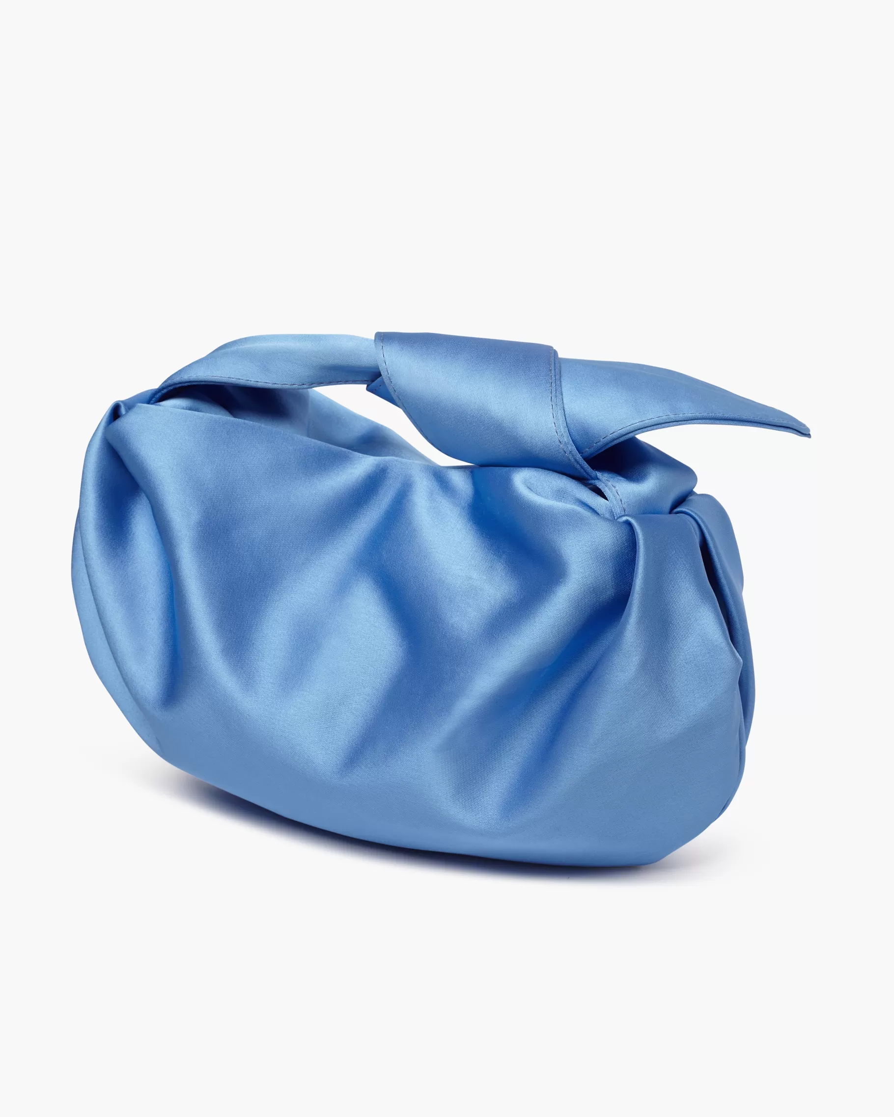 Bolso de mano con detalle de nudo en el asa y cierre mediante botón.
