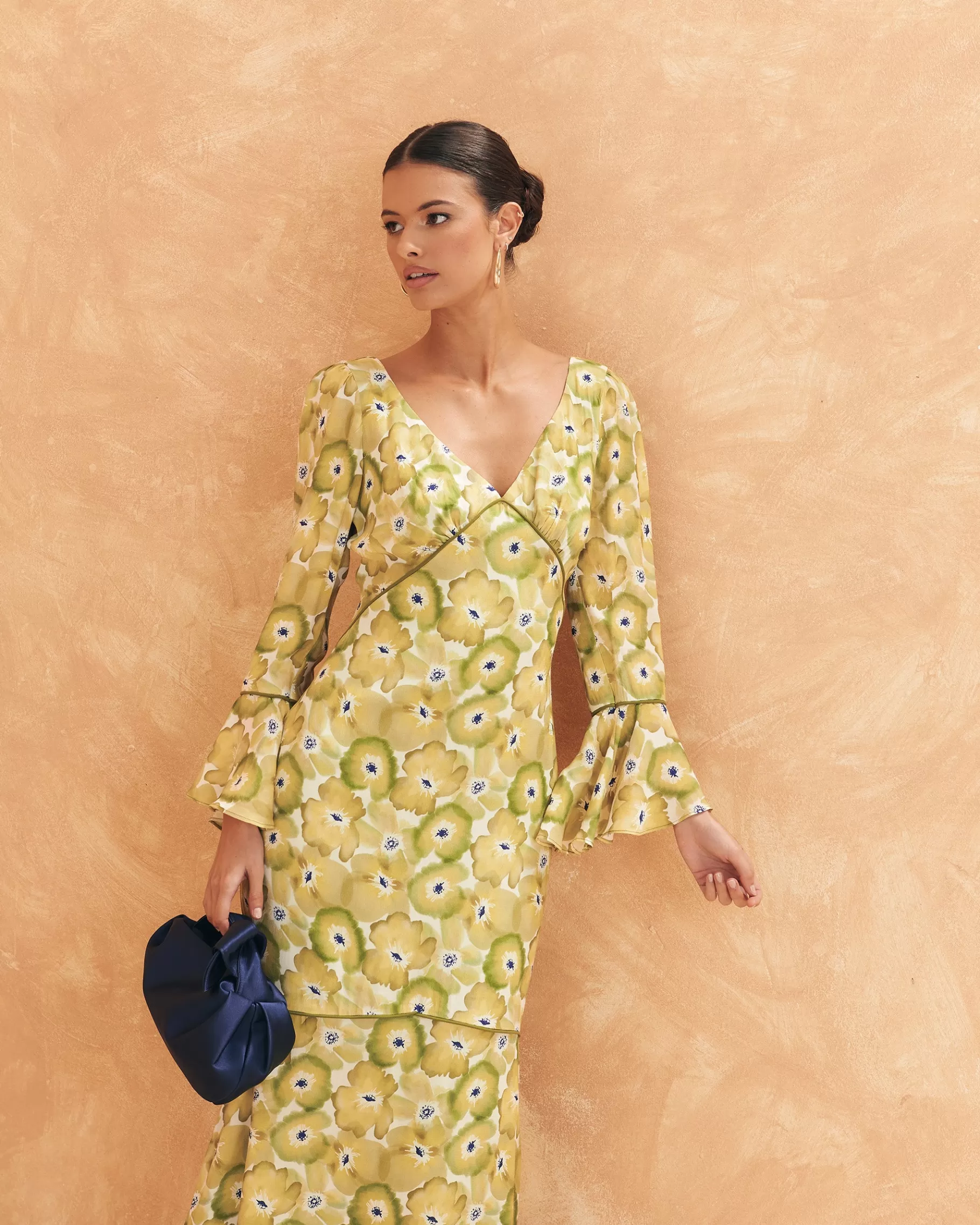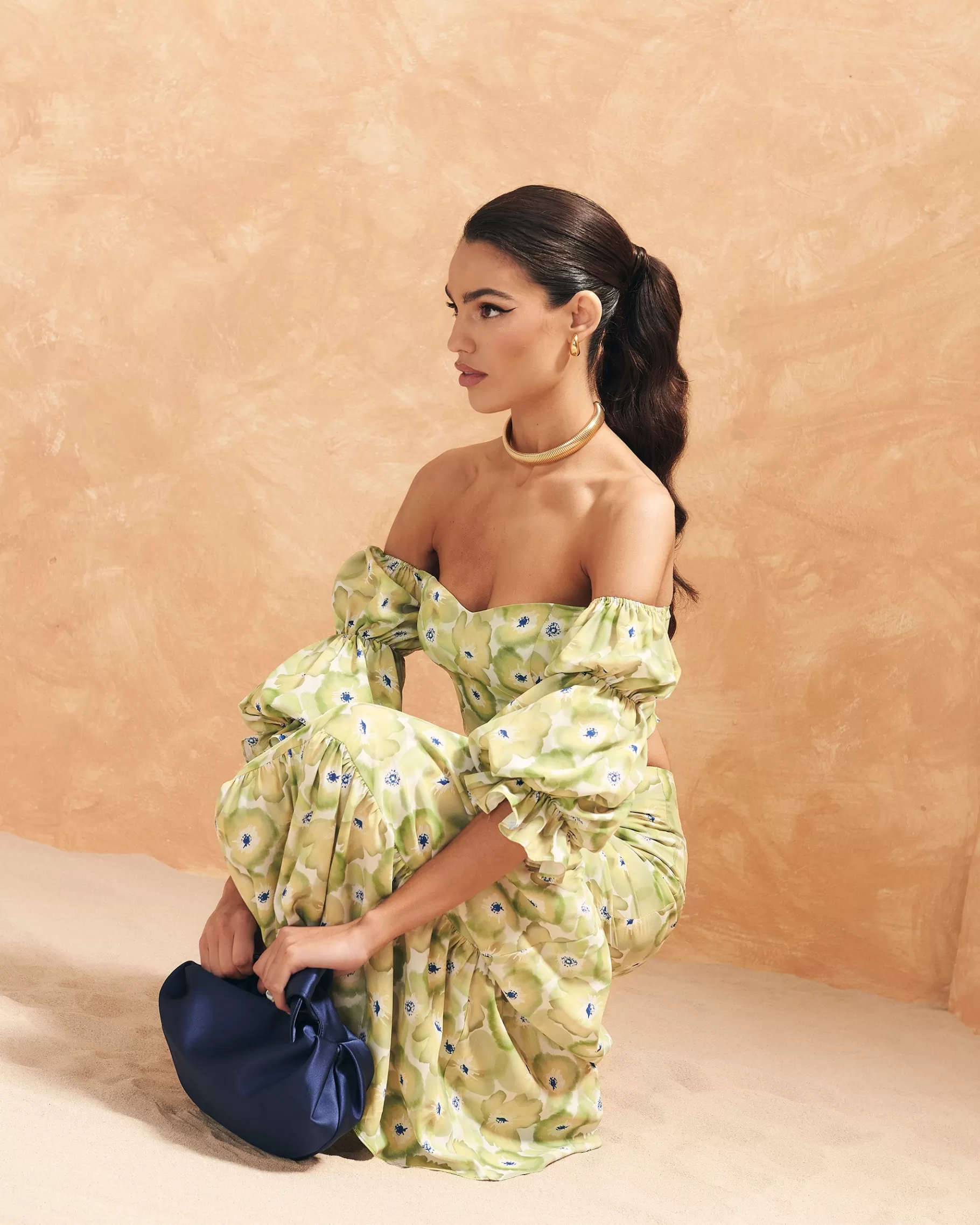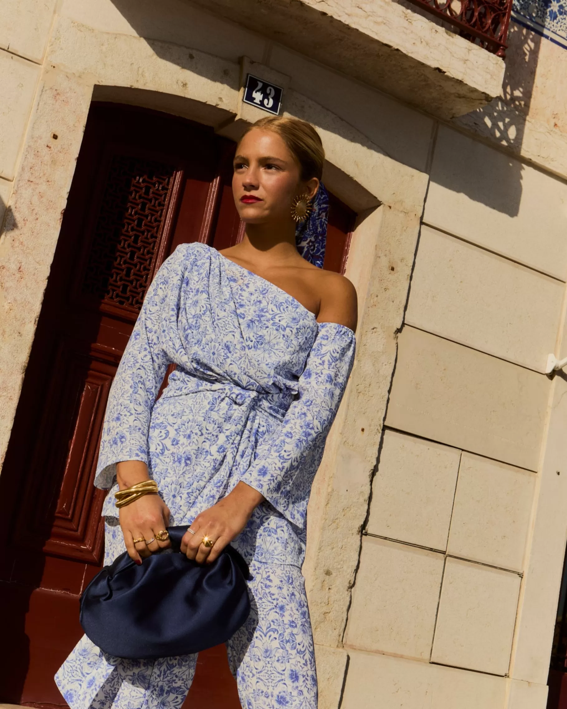 Bolso de mano con detalle de nudo en el asa y cierre mediante botón.