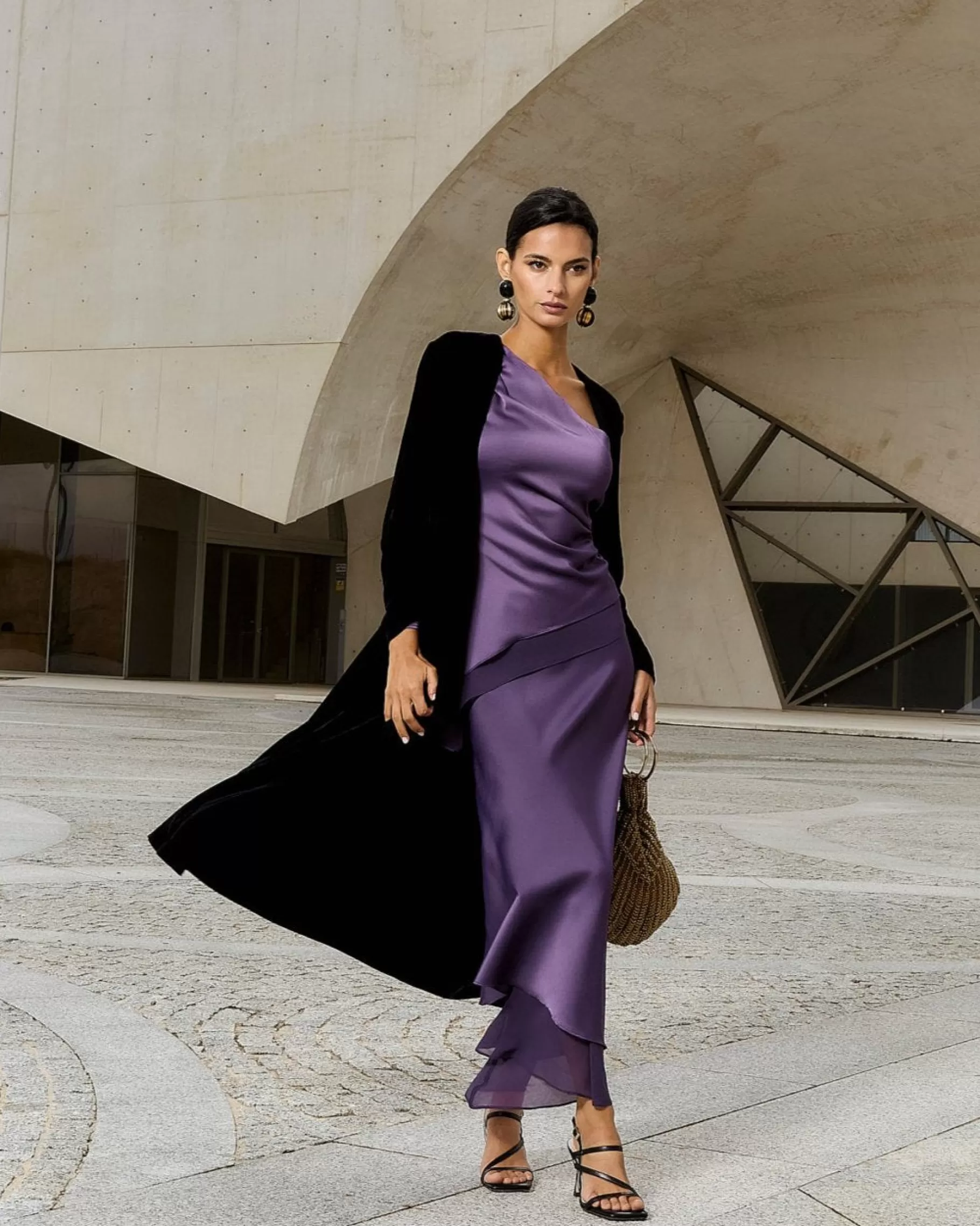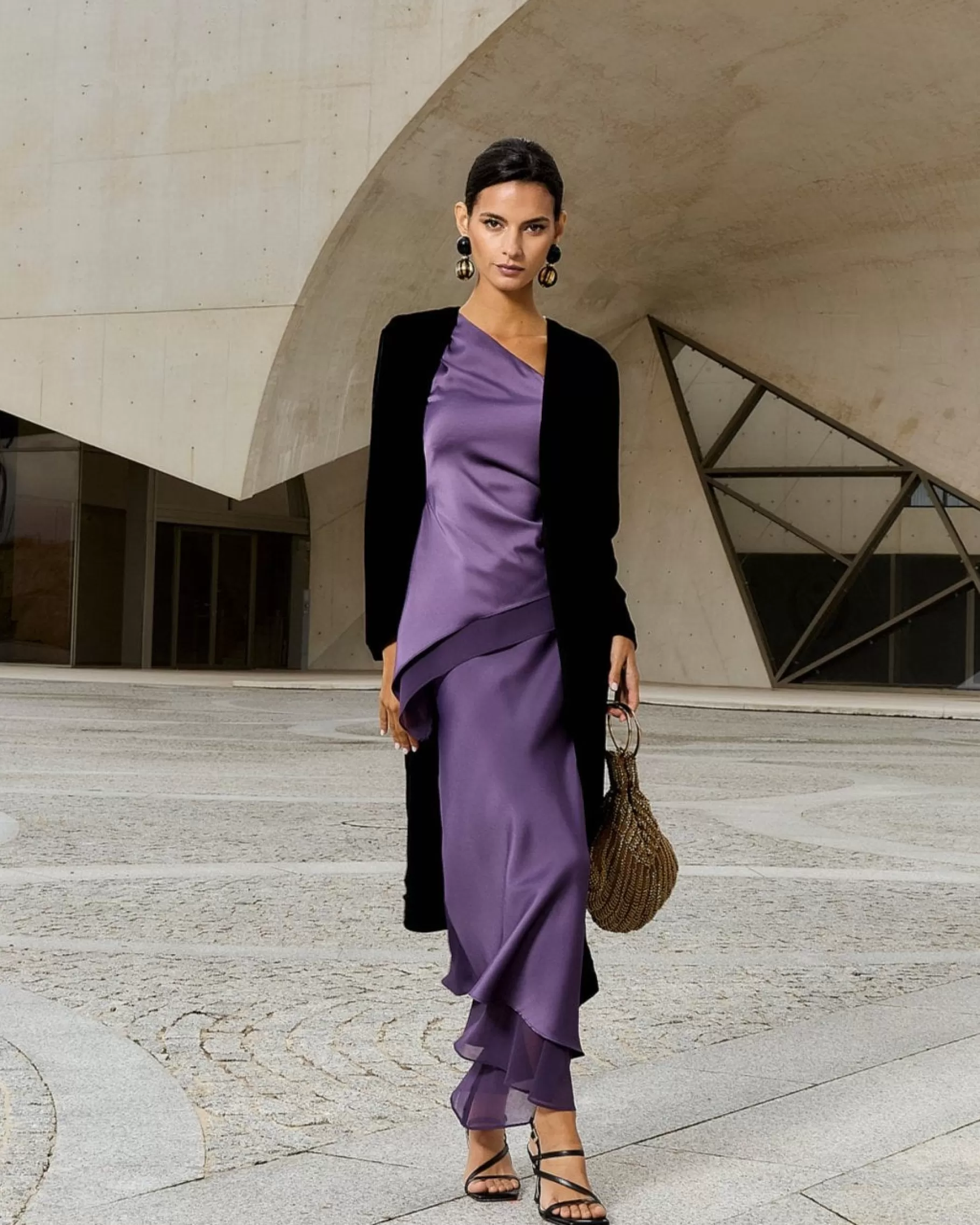 Falda midi asimétrica con detalle de gasa a tono en el bajo.
