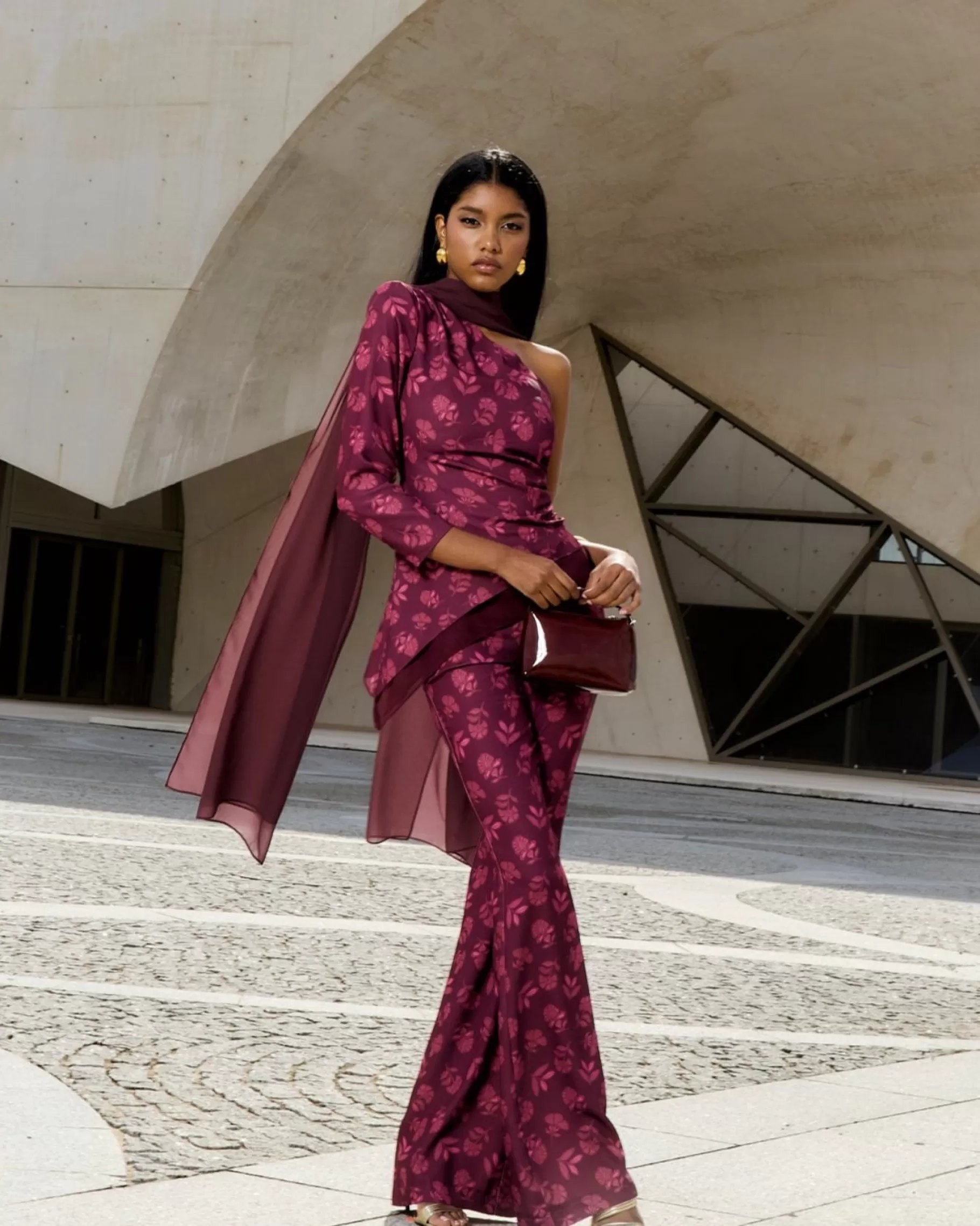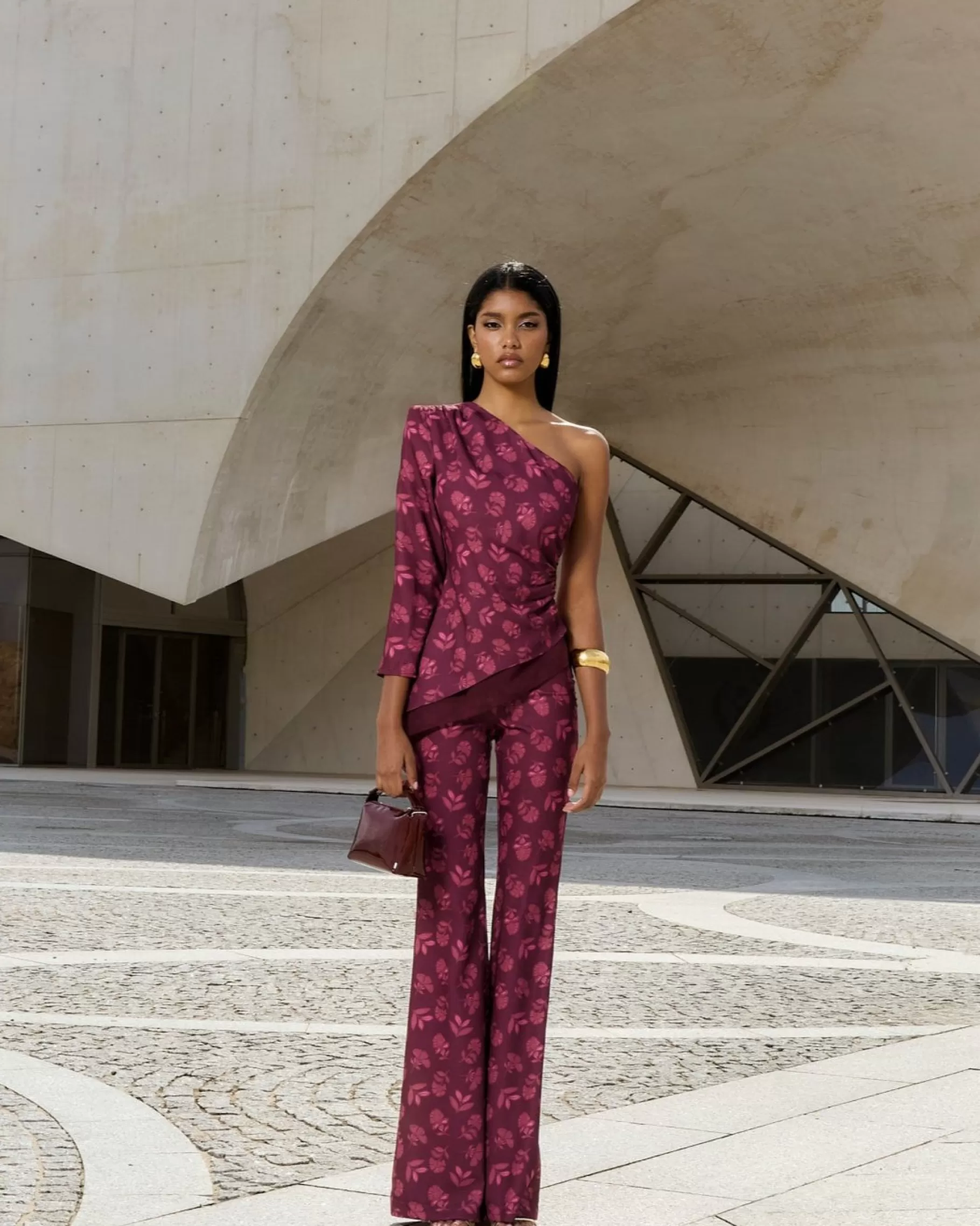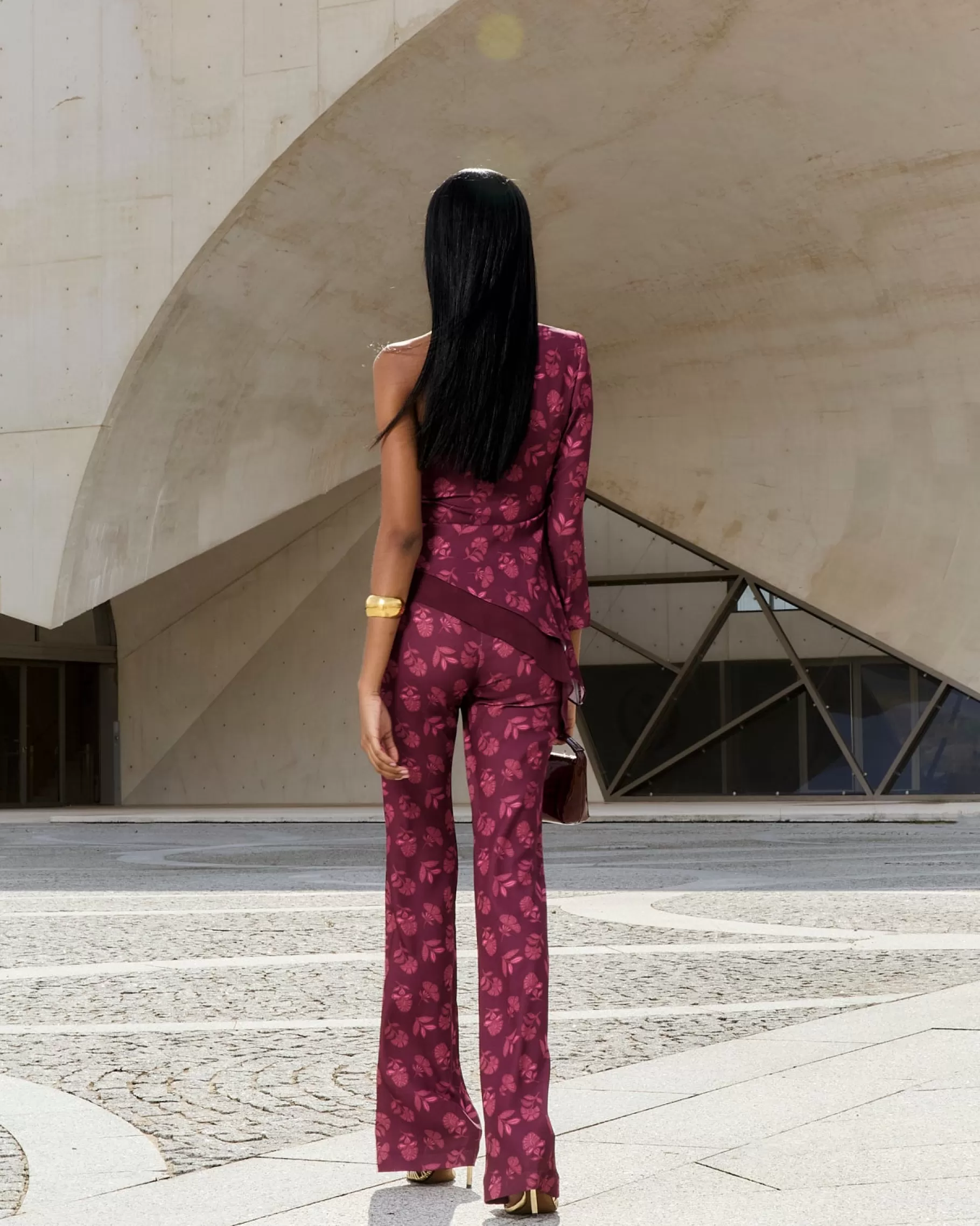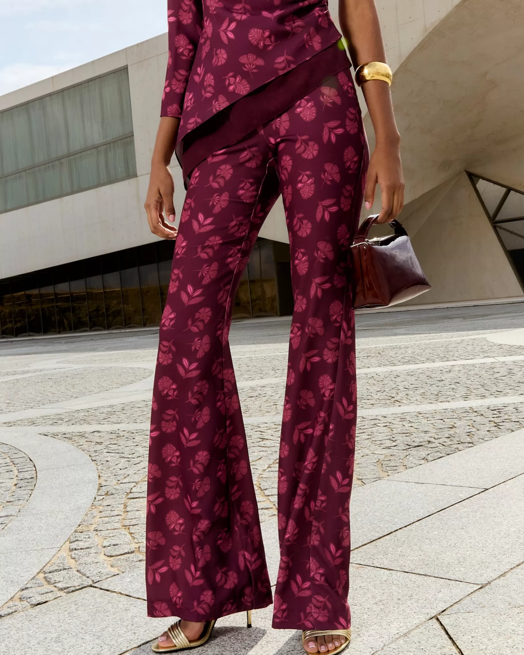 Pantalón acampanado de talle alto con cinturilla de goma en la parte trasera y cremallera lateral.