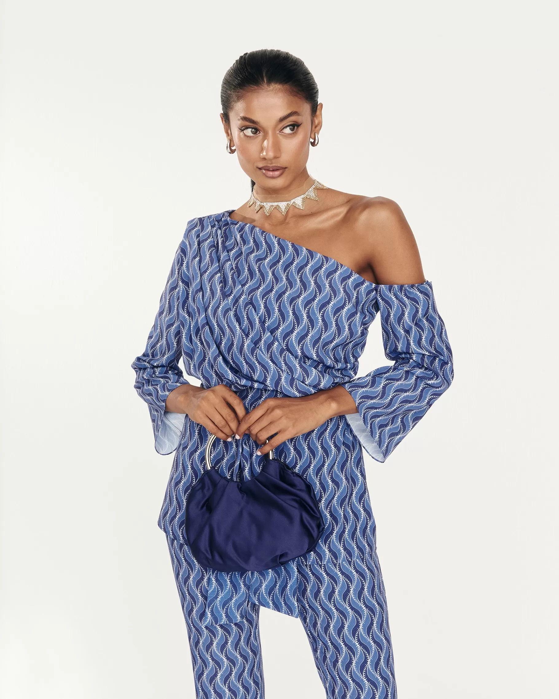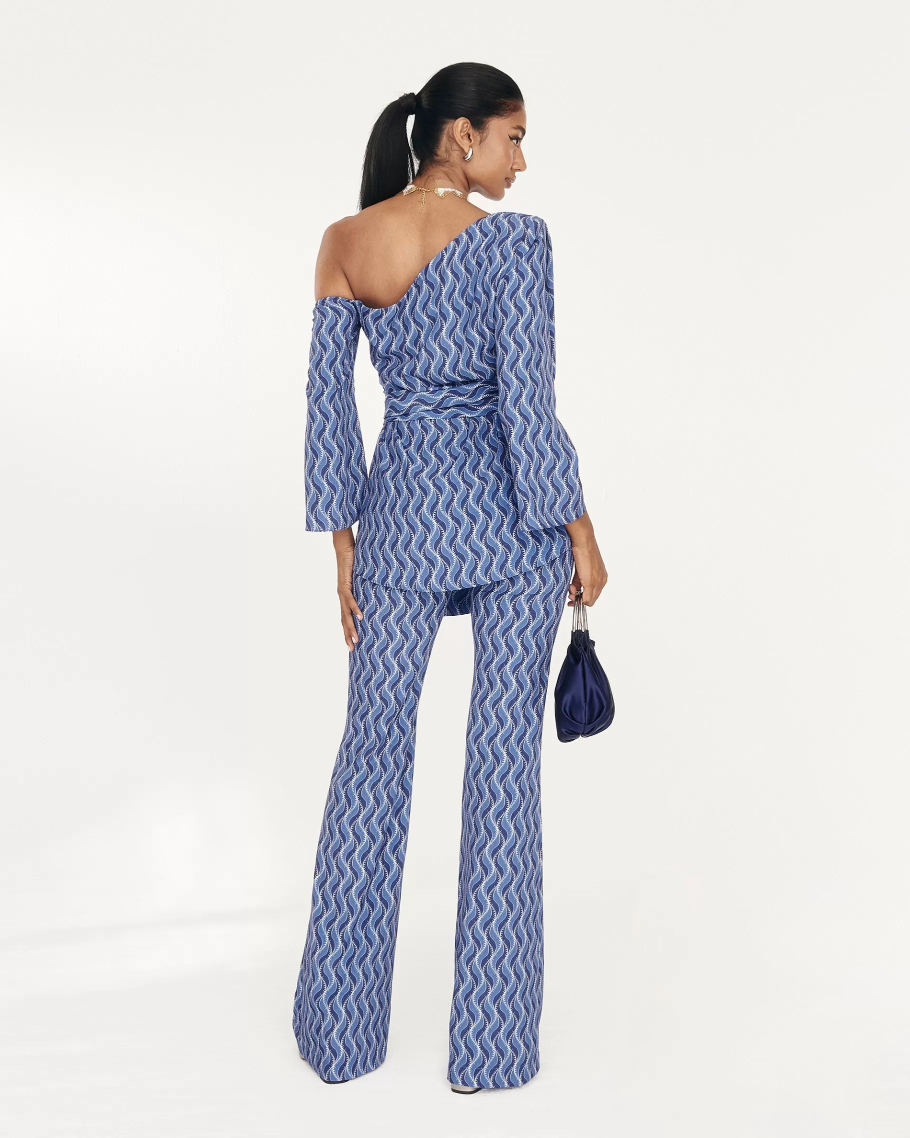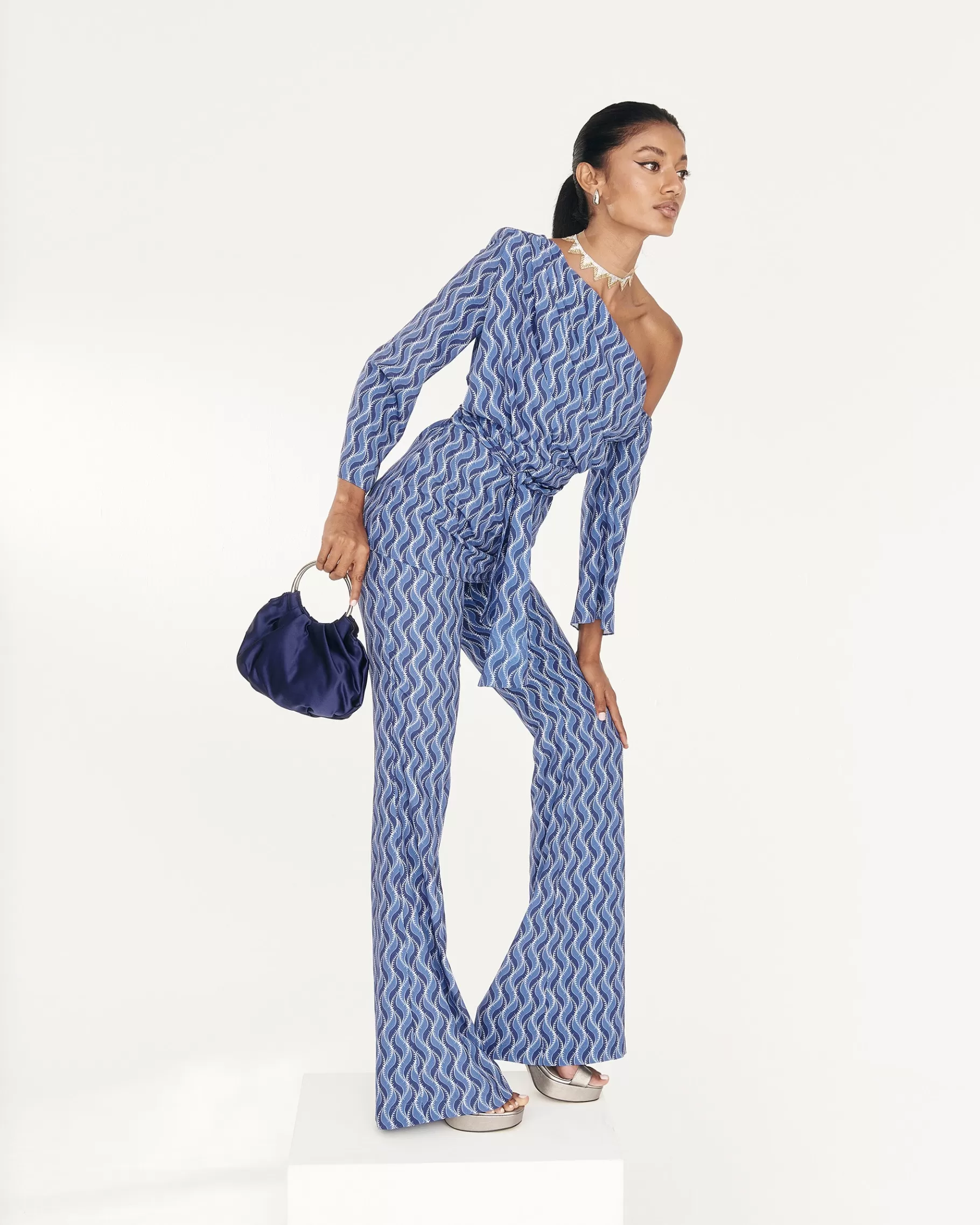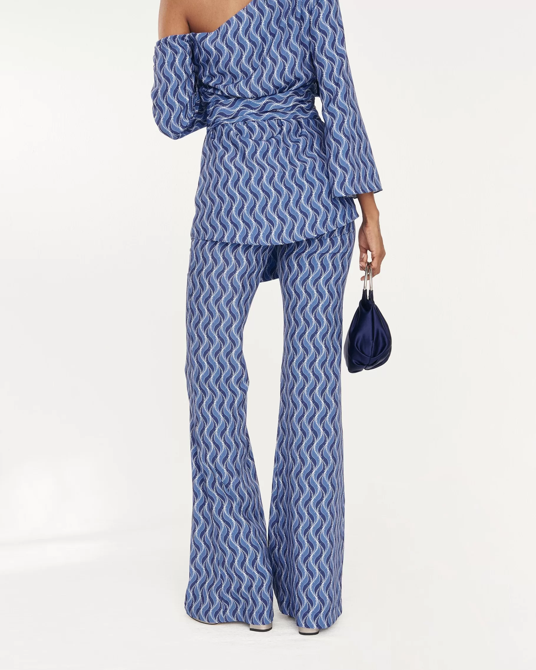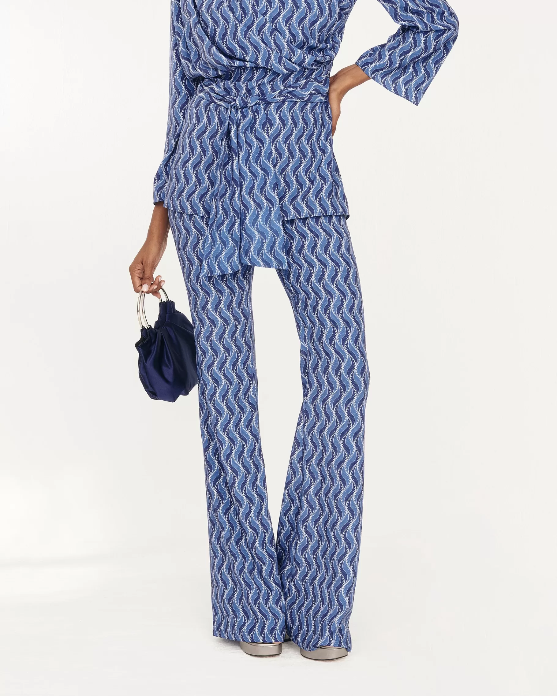 Pantalón acampanado de talle alto con cinturilla de goma en la parte trasera y cremallera lateral.
