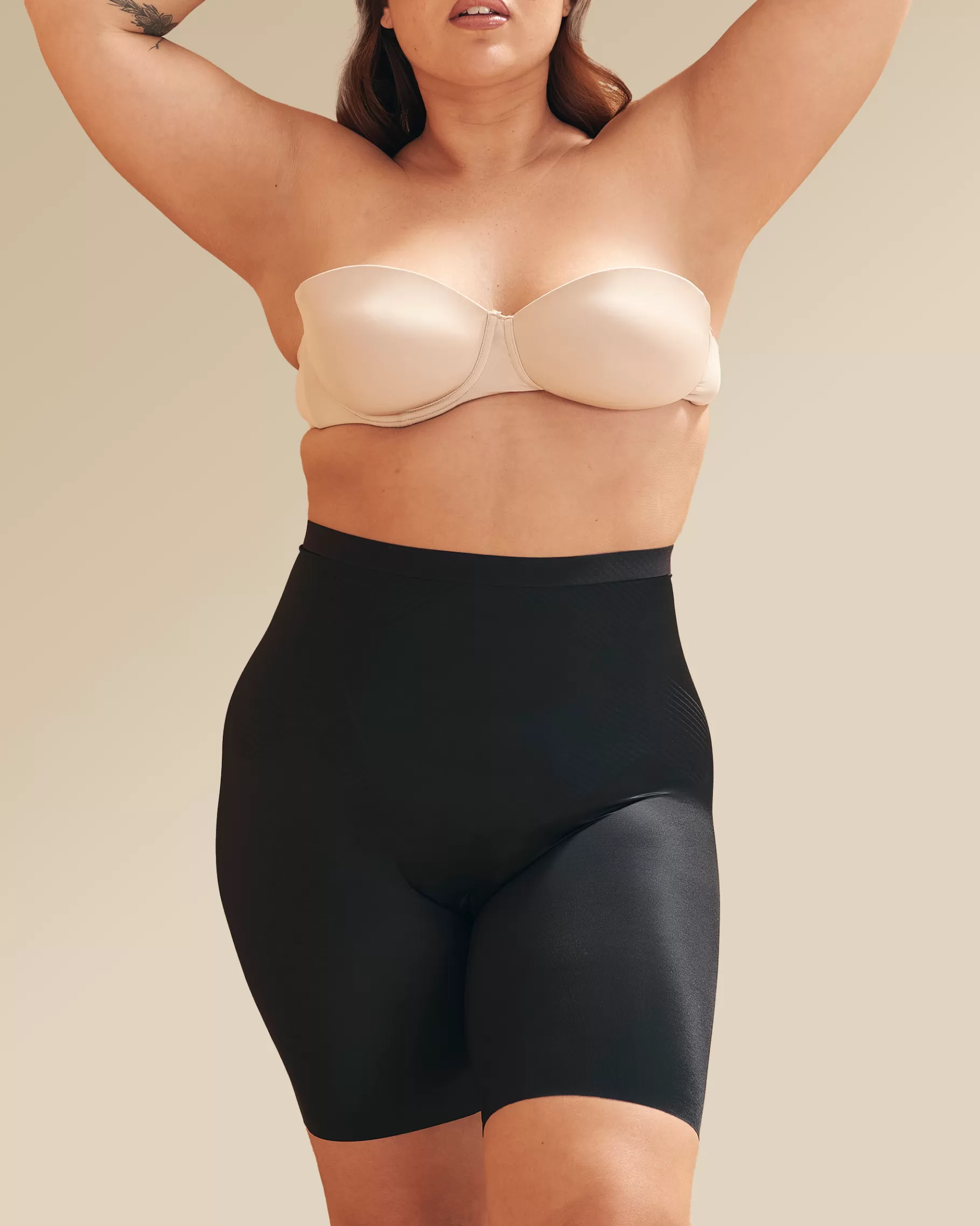 Short de mujer moldeador con efecto reductor. Tejido de microfibra sin costuras para que no se marque nada bajo la ropa. Paneles de compresión en el abdomen, la cintura, los muslos y los glúteos.