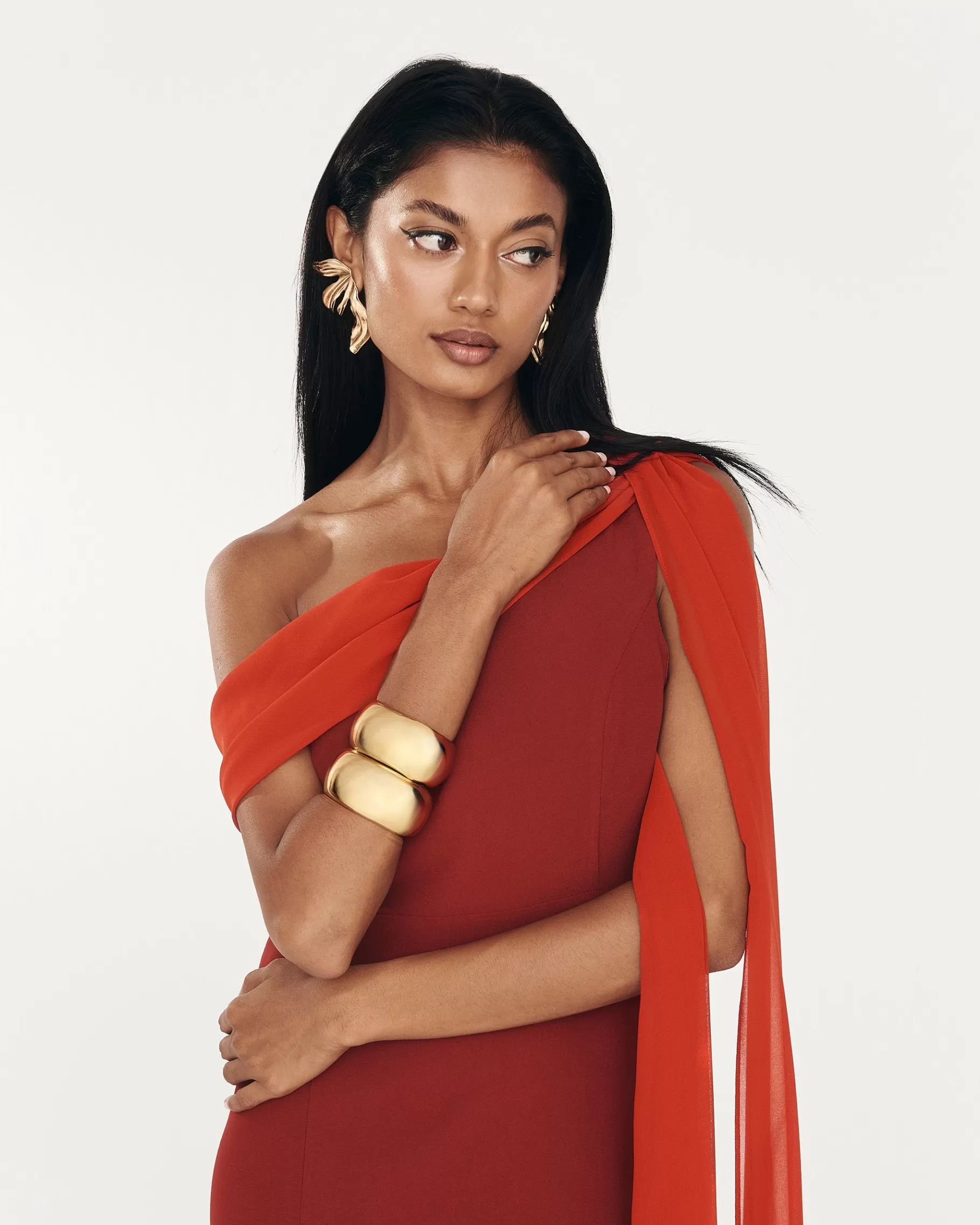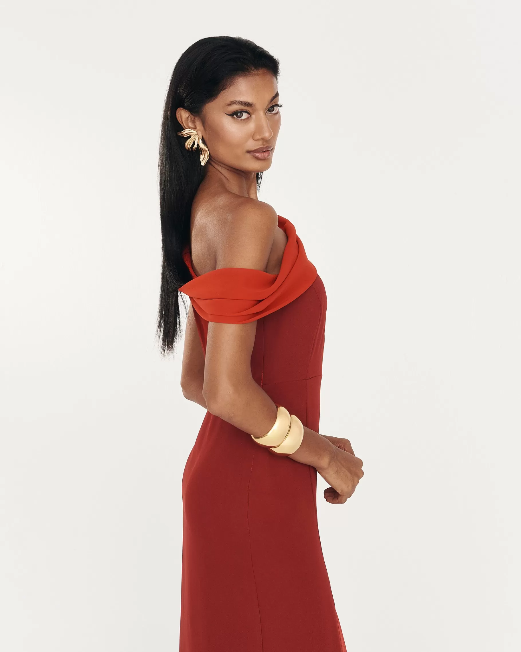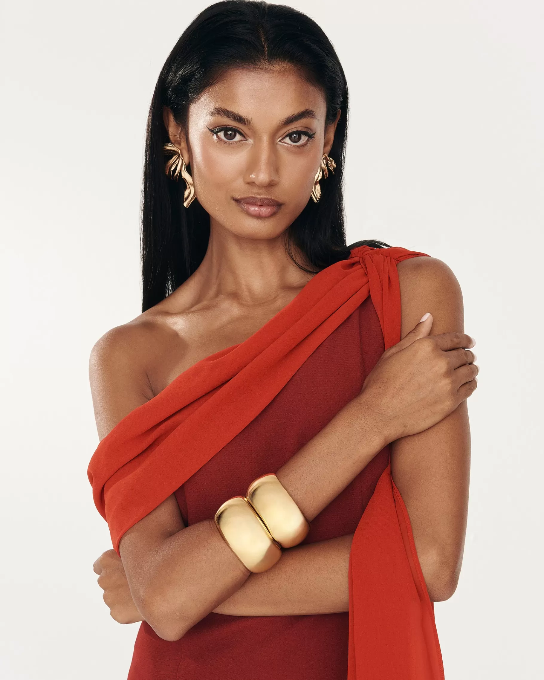 Pulsera ancha rígida tipo esclava con apertura en dorado.
