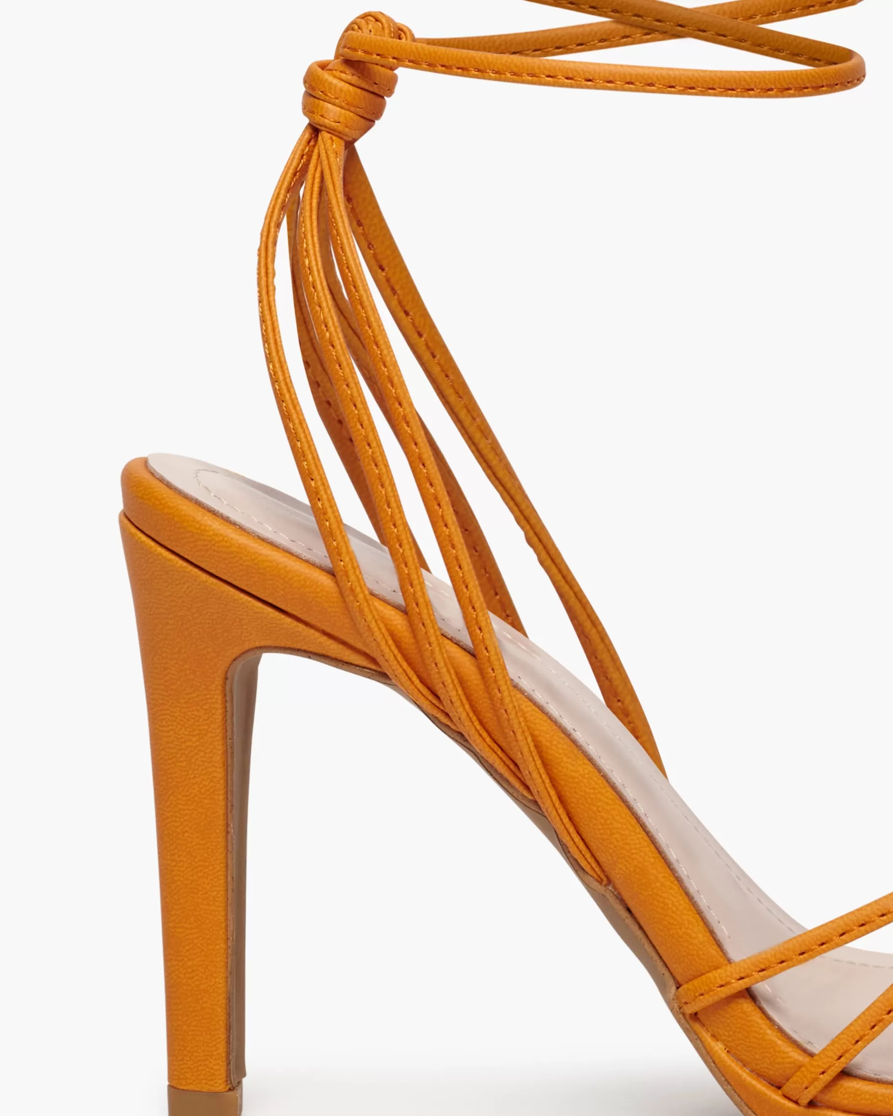 Sandalias de tacón fino y punta redonda con detalle de tiras en la parte delantera. Cierre mediante tiras atadas al to…