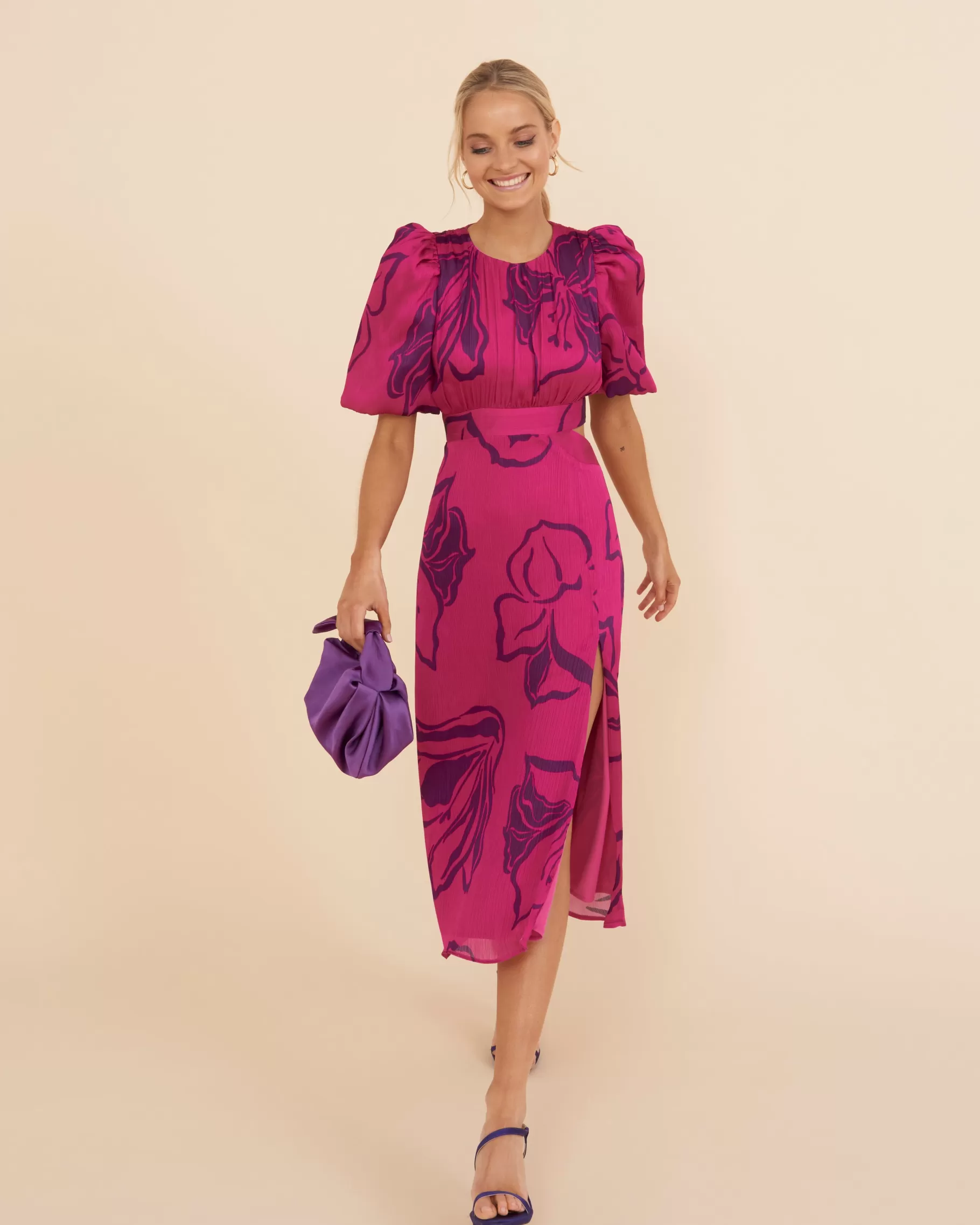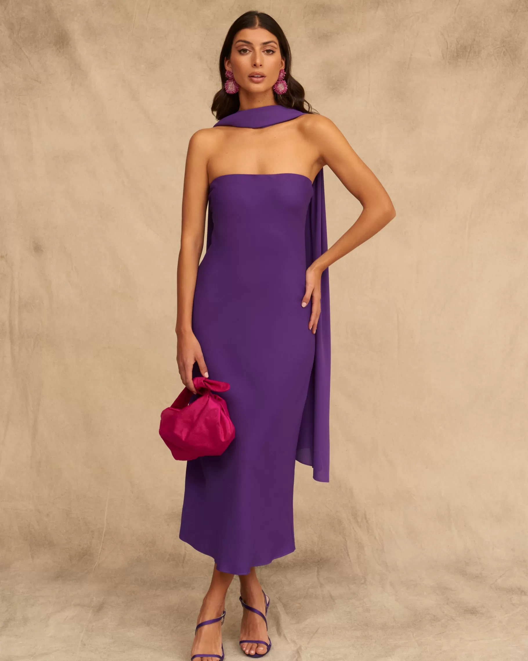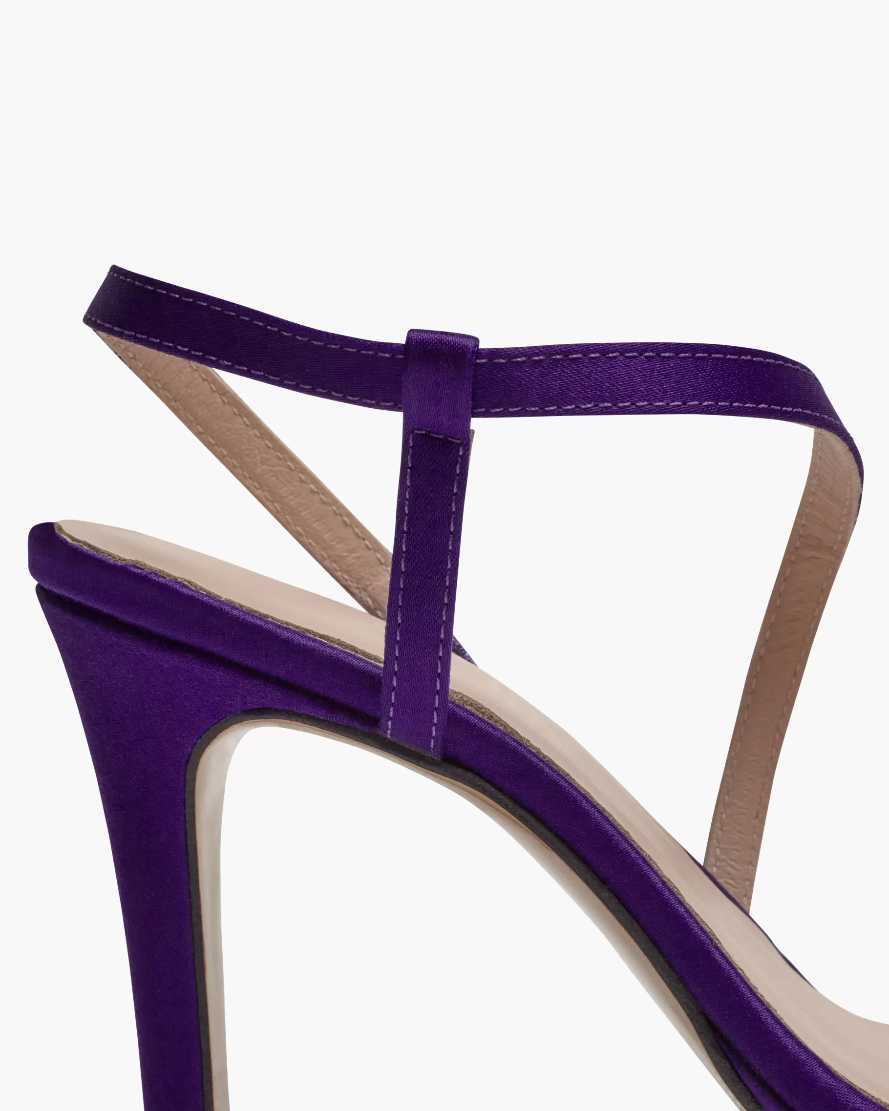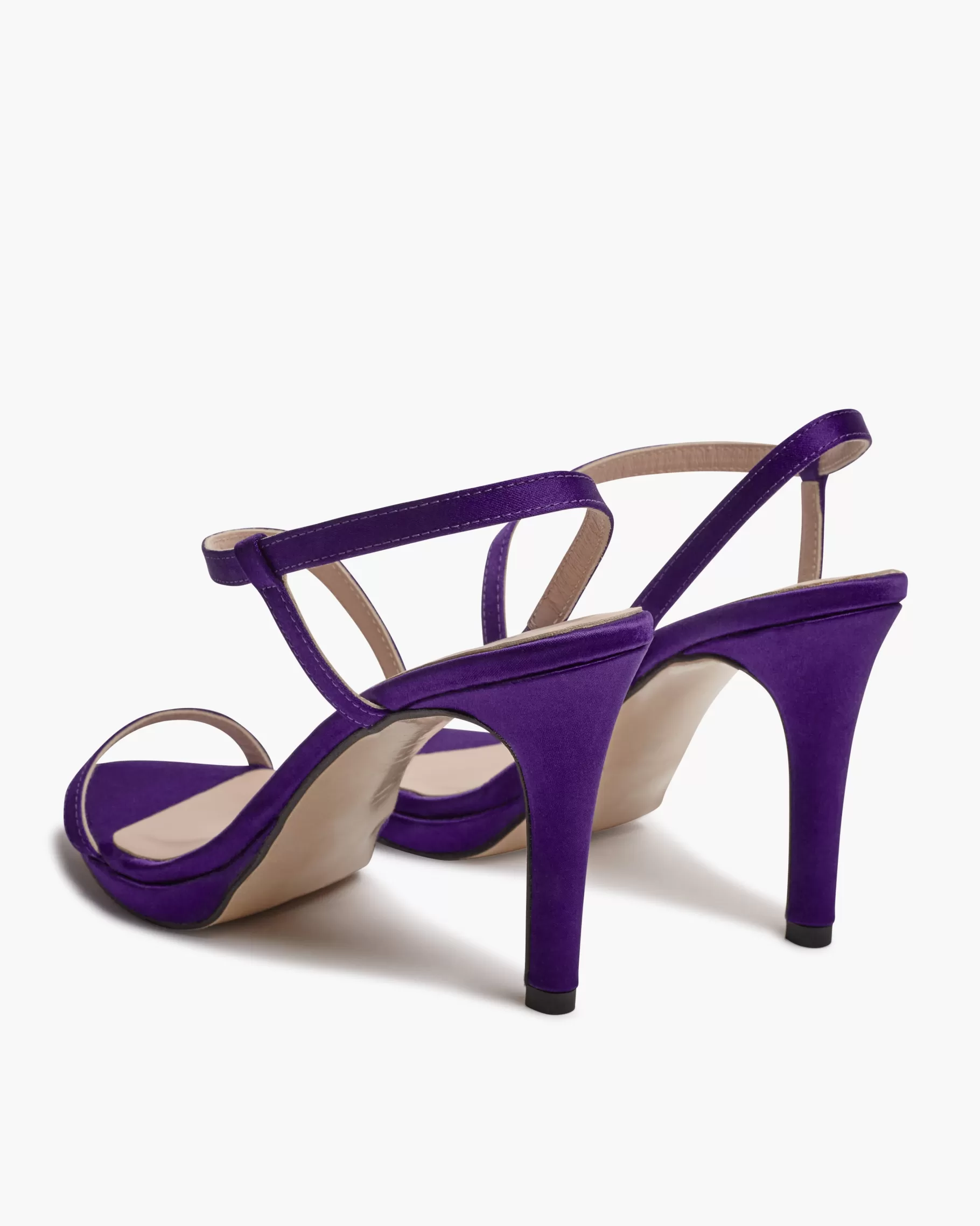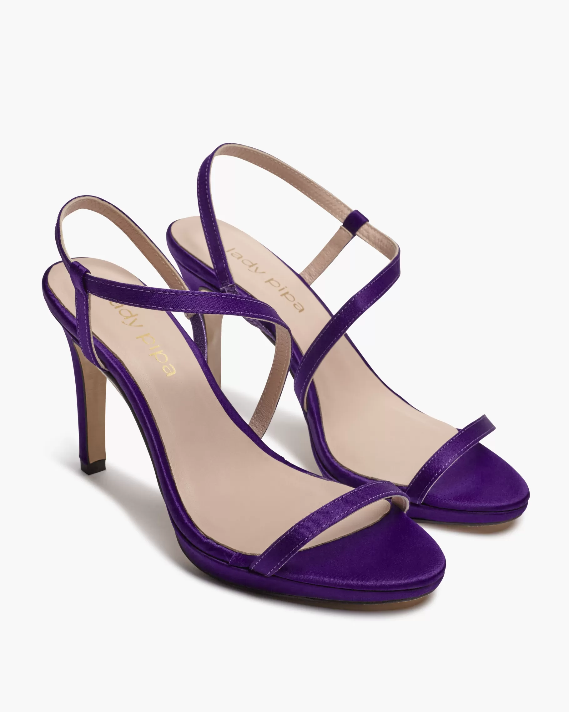 Sandalia de tacón alto y punta redonda con tiras finas en morado. Tira elástica en el tobillo. Tiene la planta muy acolchada para mayor confort.