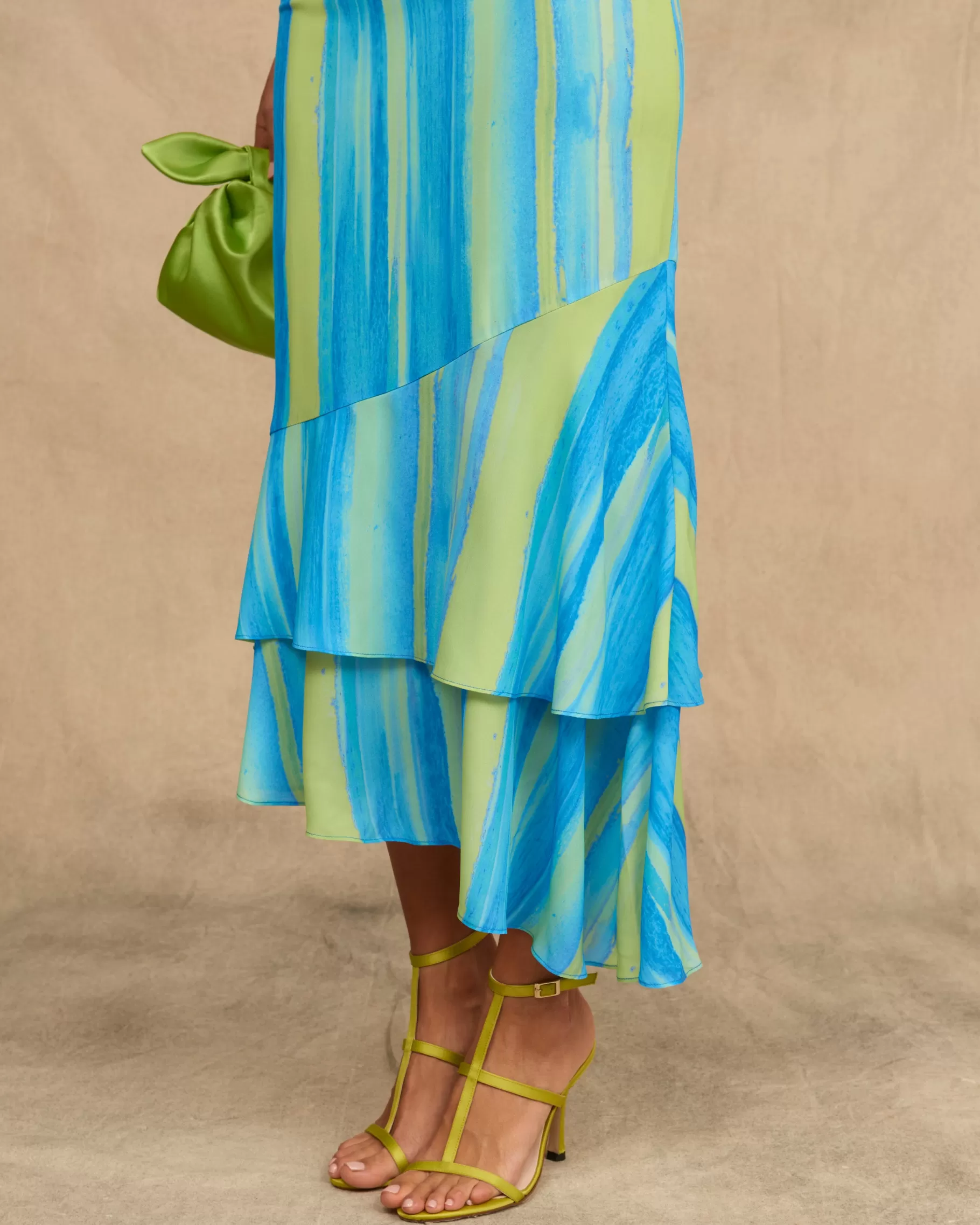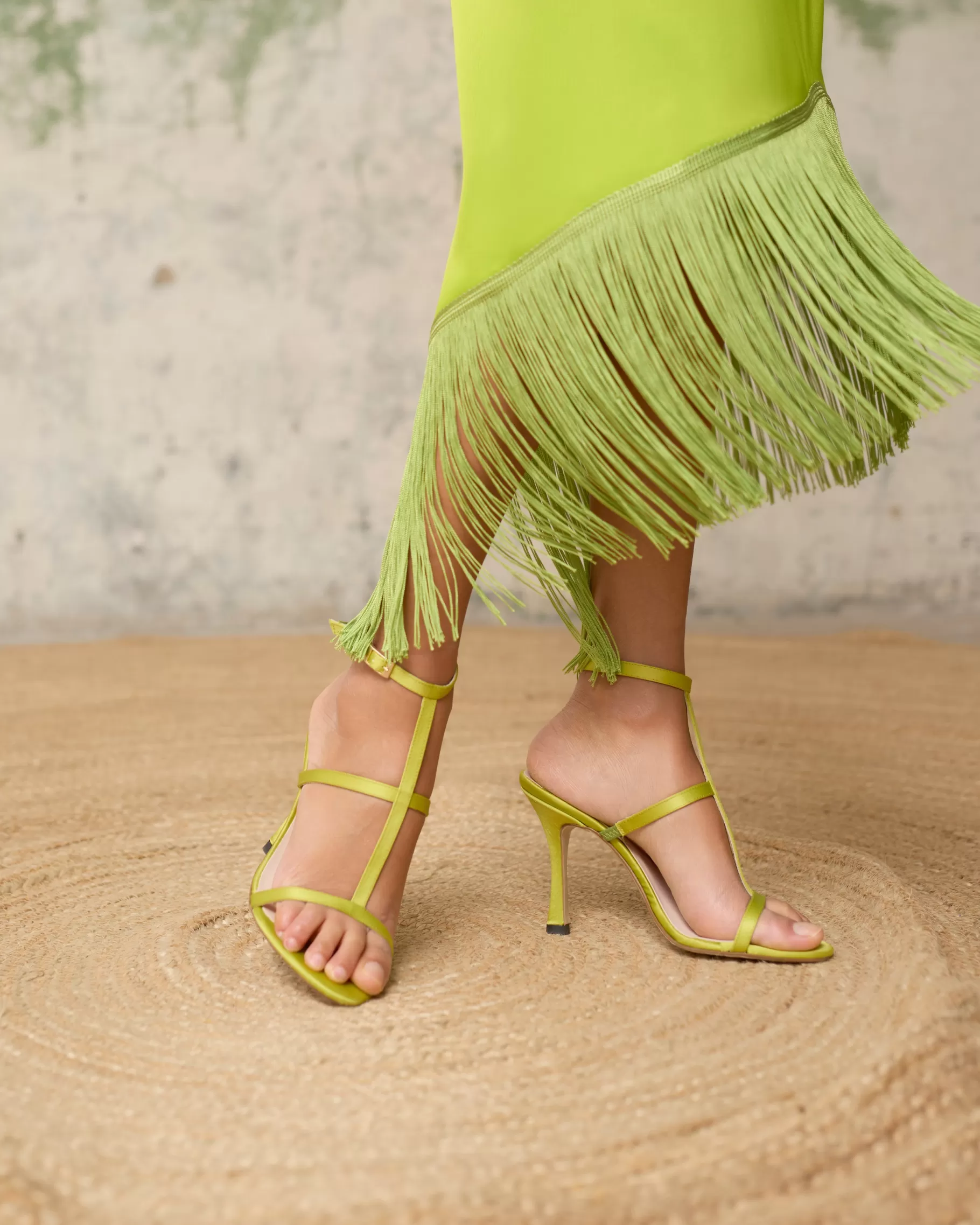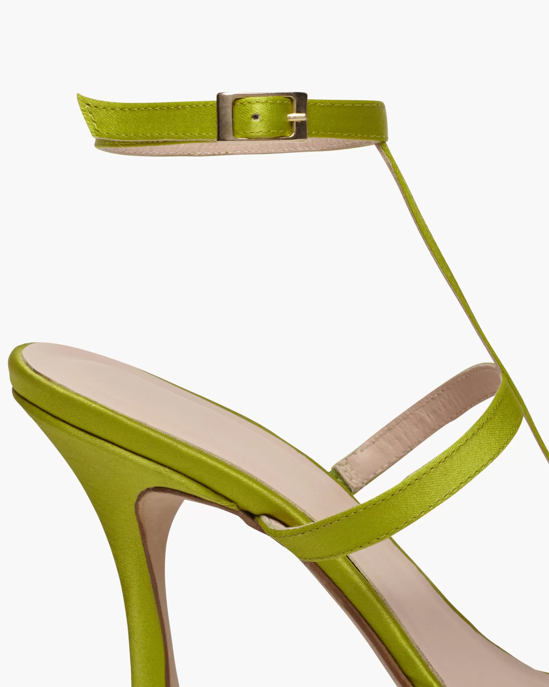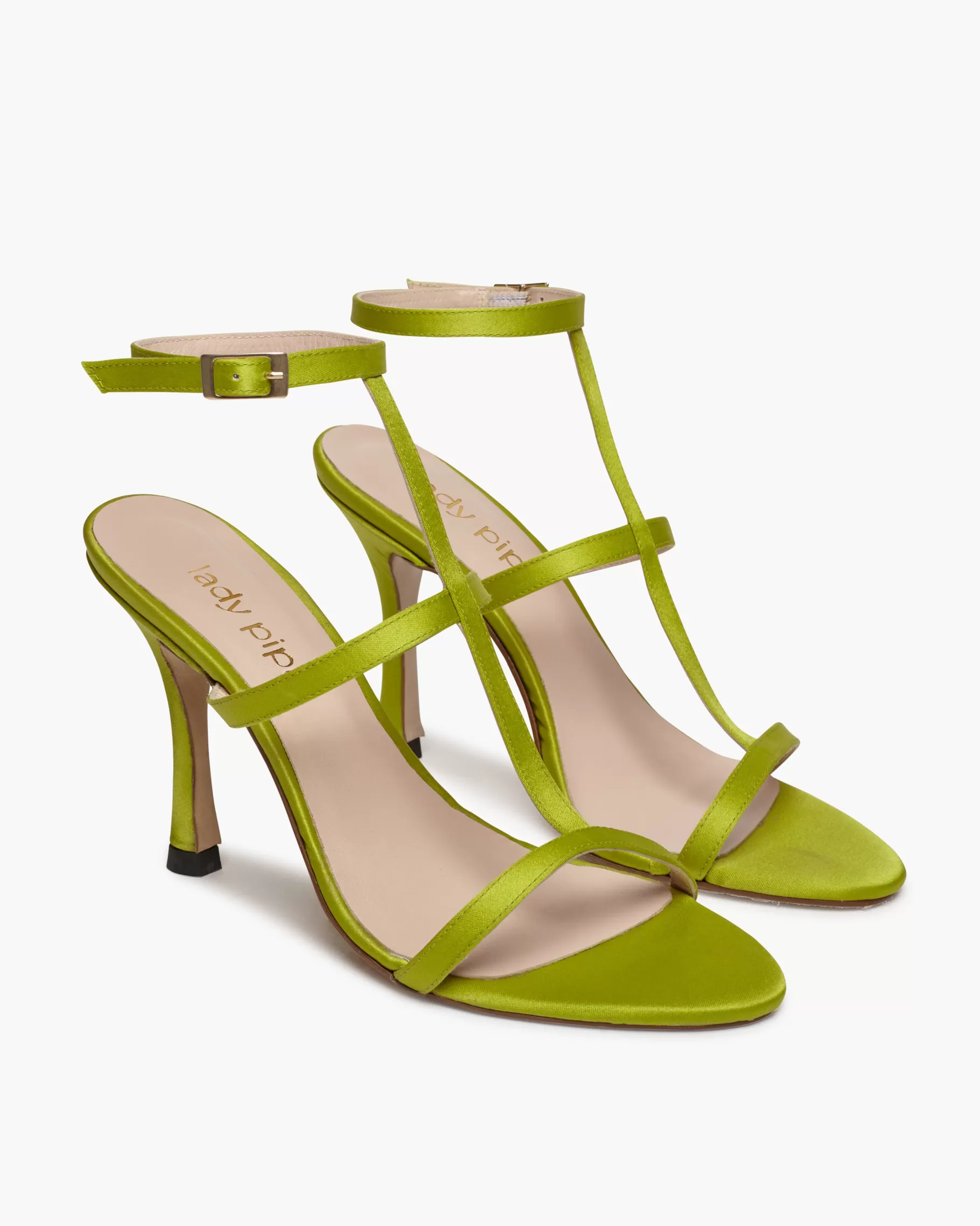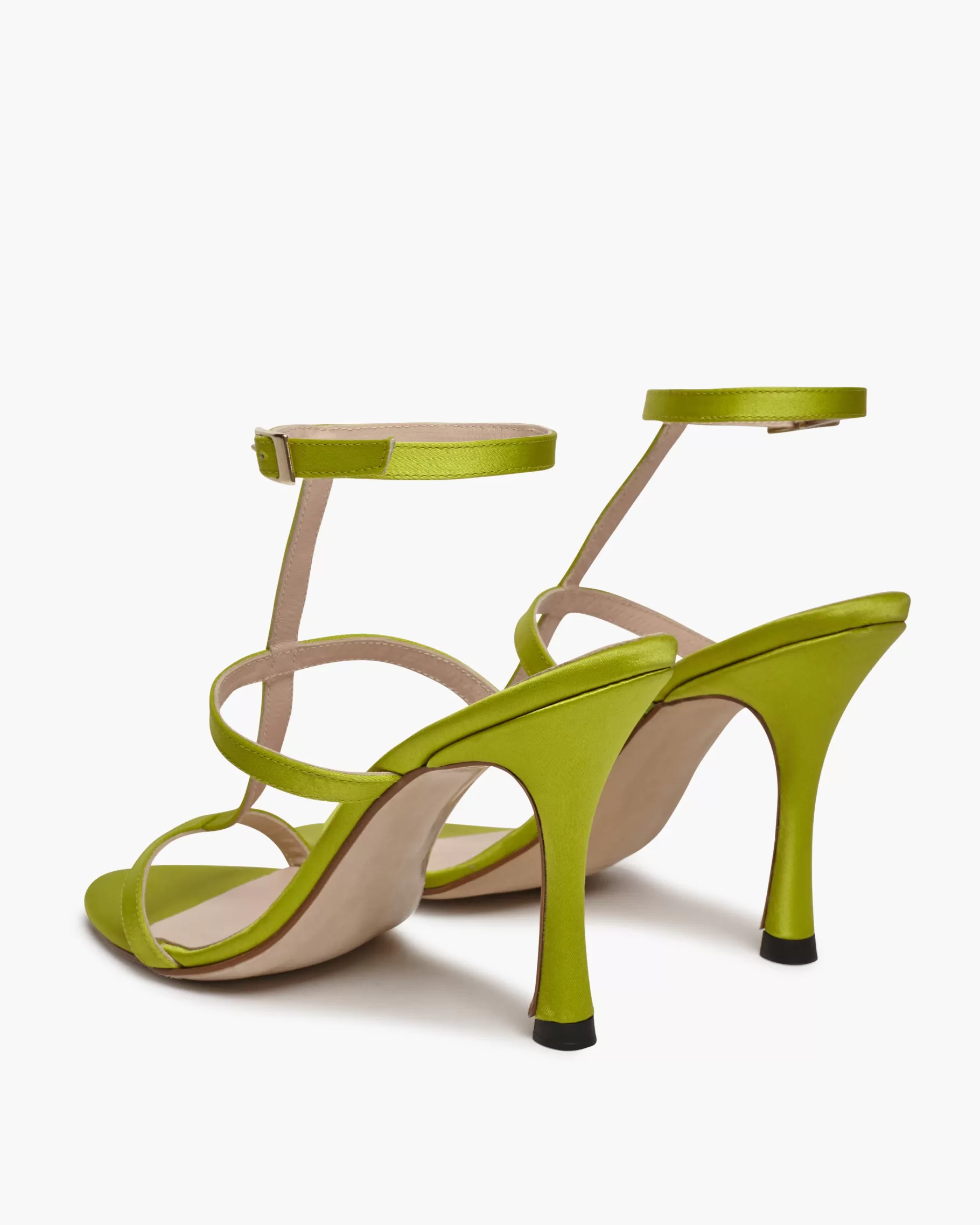 Sandalia de raso de tacón fino y tiras finas. Acabada en punta redonda. Cierre de pulsera con hebilla en el tobillo. Tiene la planta muy acolchada para mayor confort.