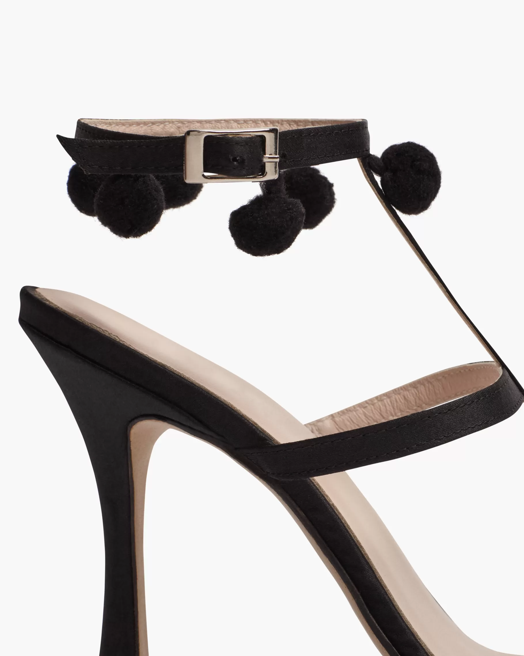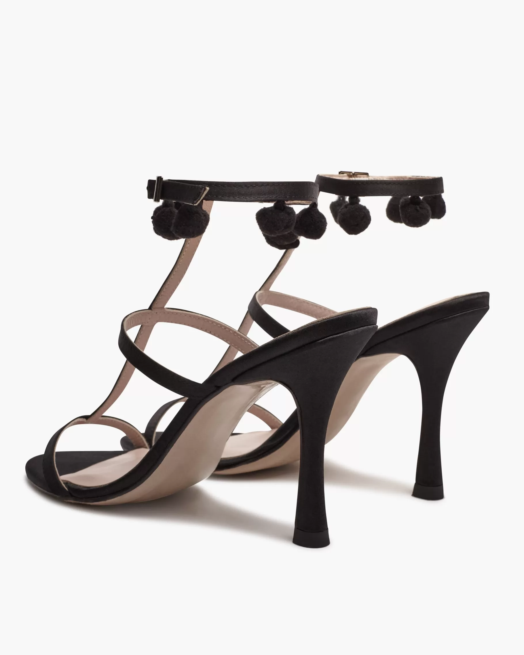Sandalia de raso de tacón fino y tiras finas con detalle de madroños al tono. Acabada en punta redonda. Cierre de pulsera con hebilla en el tobillo. Tiene la planta muy acolchada para mayor confort.