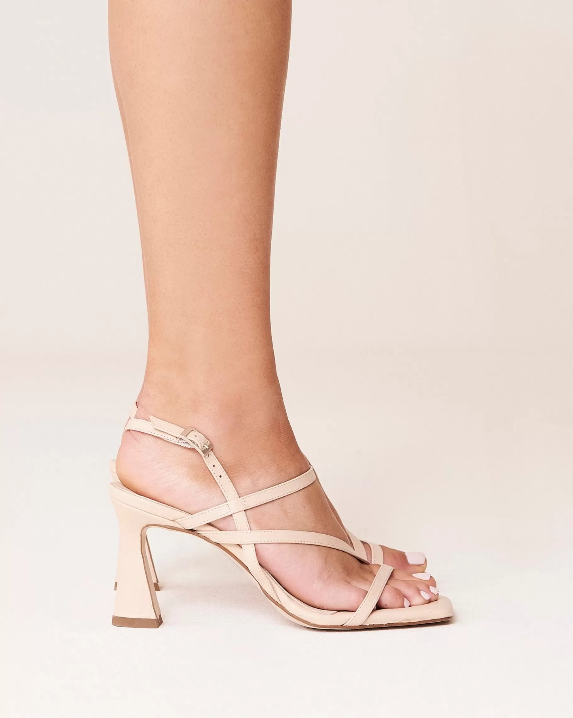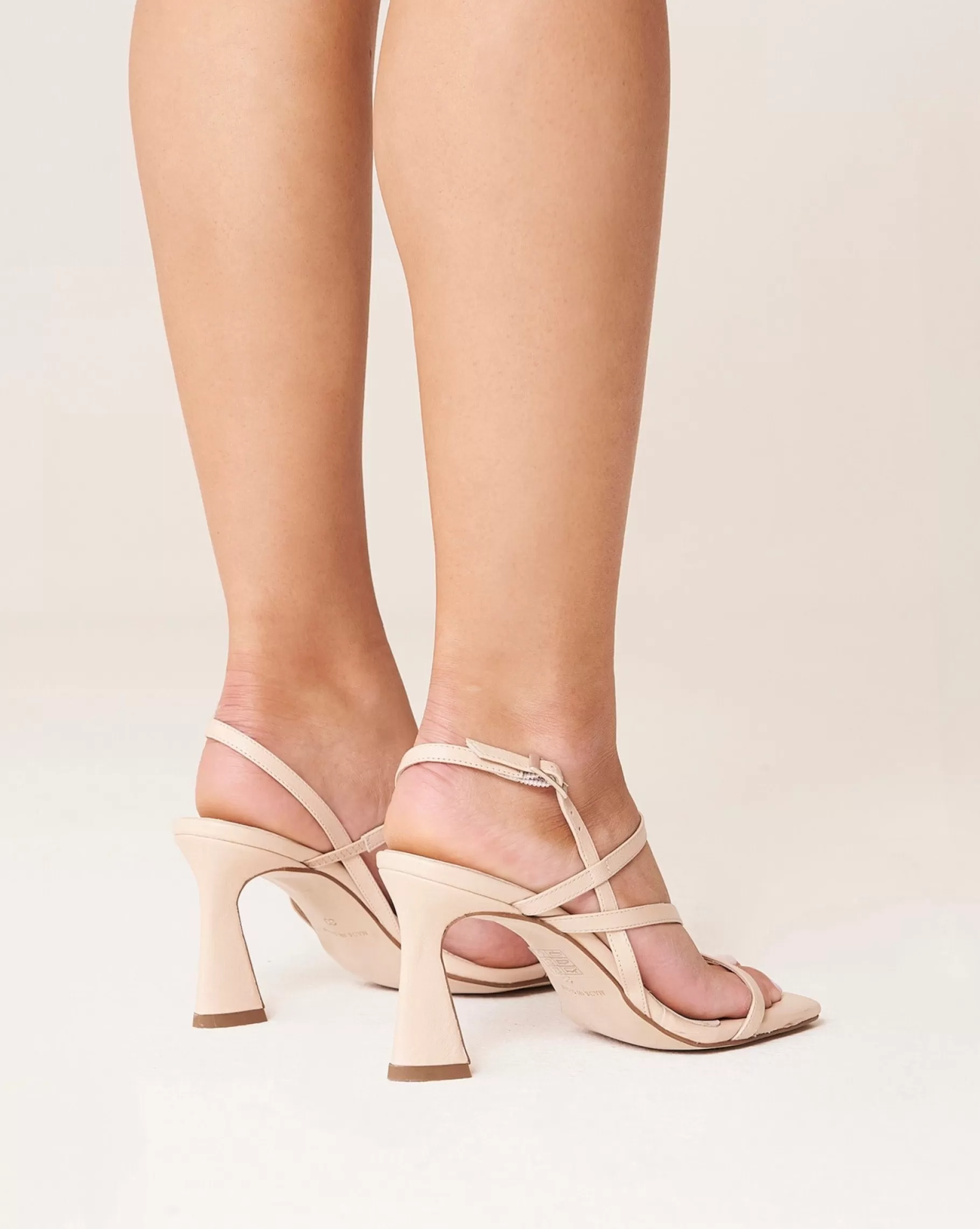 Sandalia de tacón asimétrico con tiras finas y puntera cuadrada. Cierre con hebilla. Tiene la planta muy acolchada para mayor confort.