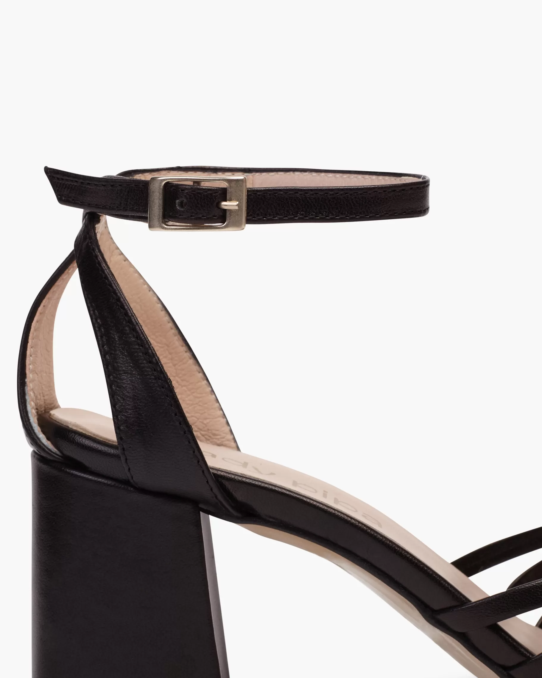 Sandalia de tacón ancho con detalle de tiras. Acabada en punta redonda. Cierre de pulsera con hebilla en el tobillo. Tiene la planta muy acolchada para mayor confort.