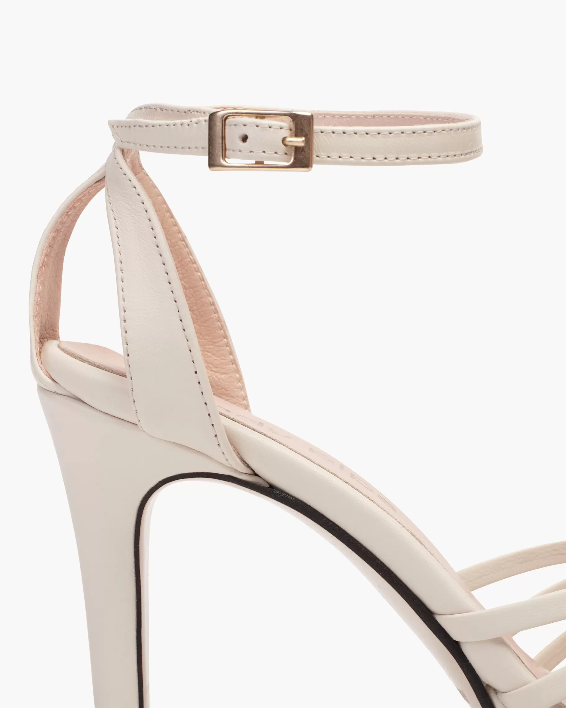 Sandalia de tacón fino con detalle de tiras. Acabada en punta redonda. Cierre de pulsera con hebilla en el tobillo. Tiene la planta muy acolchada para mayor confort.