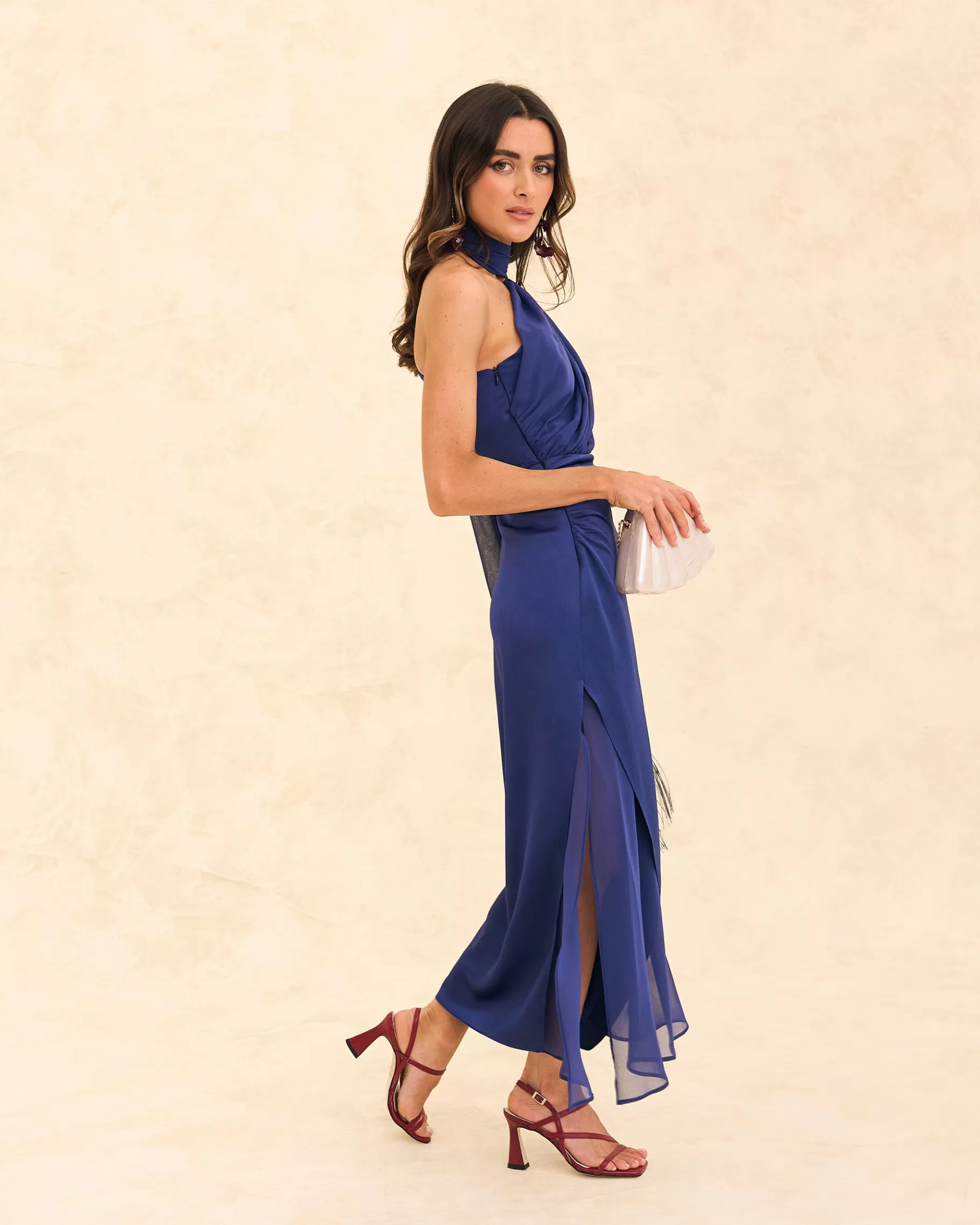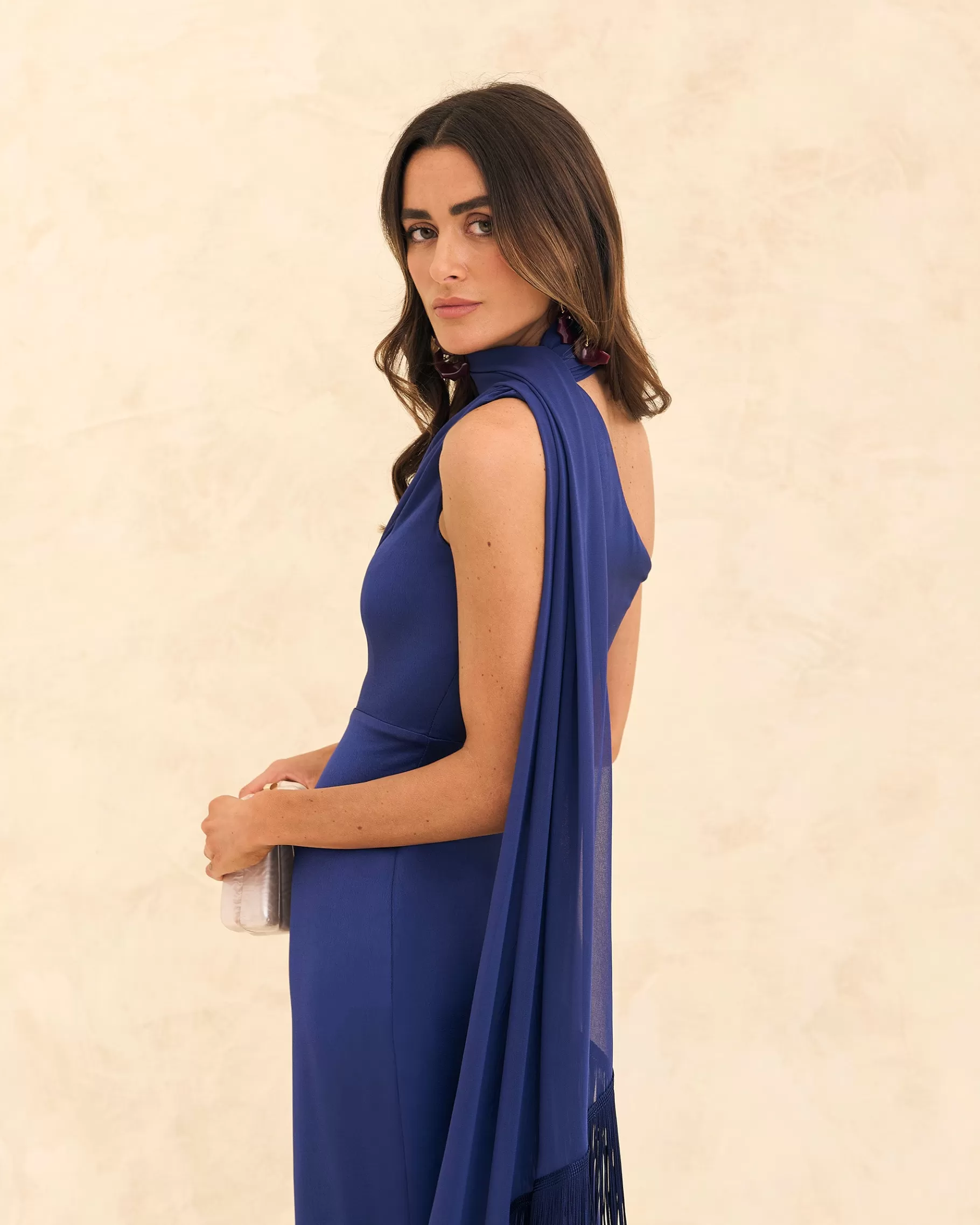 Vestido midi con chal al cuello con detalle de flecos a tono, frunces en la falda y abertura lateral con detalle de gasa.
