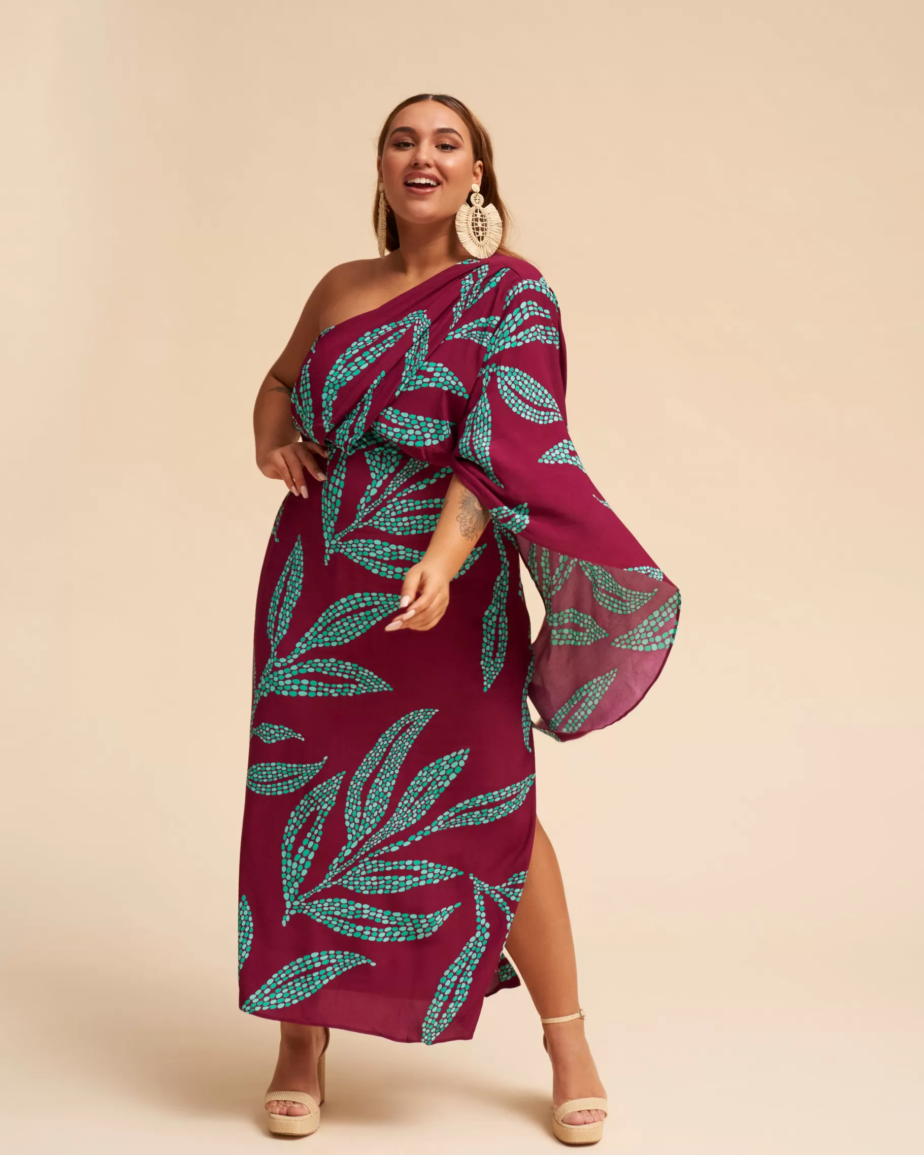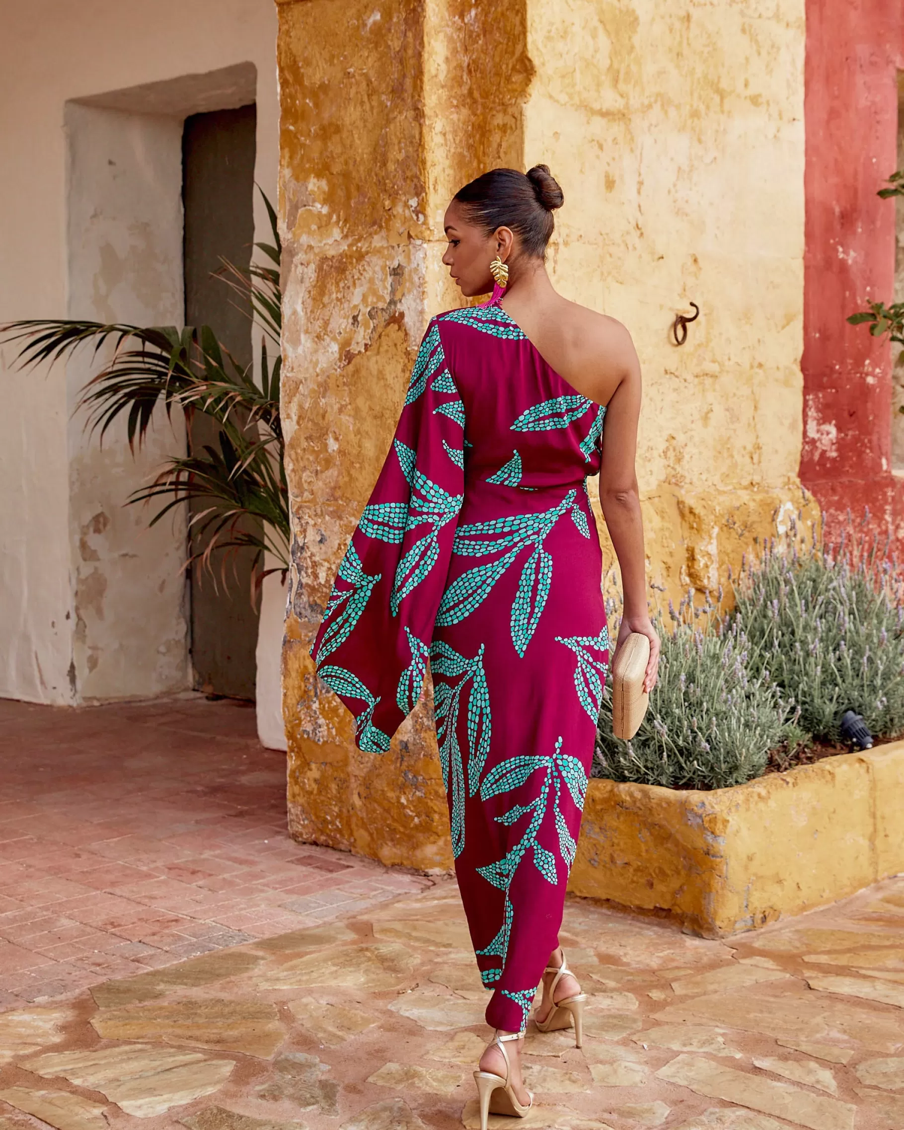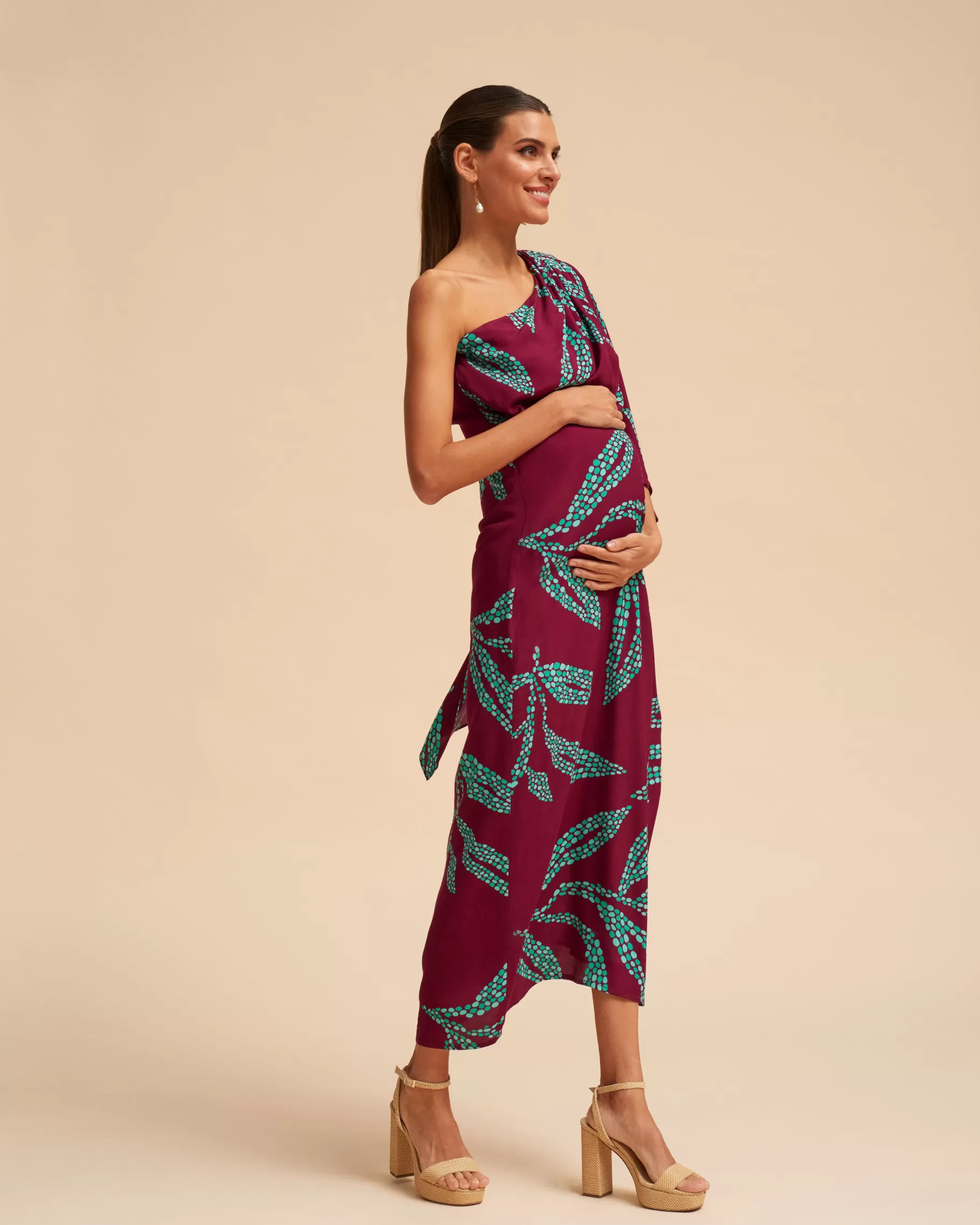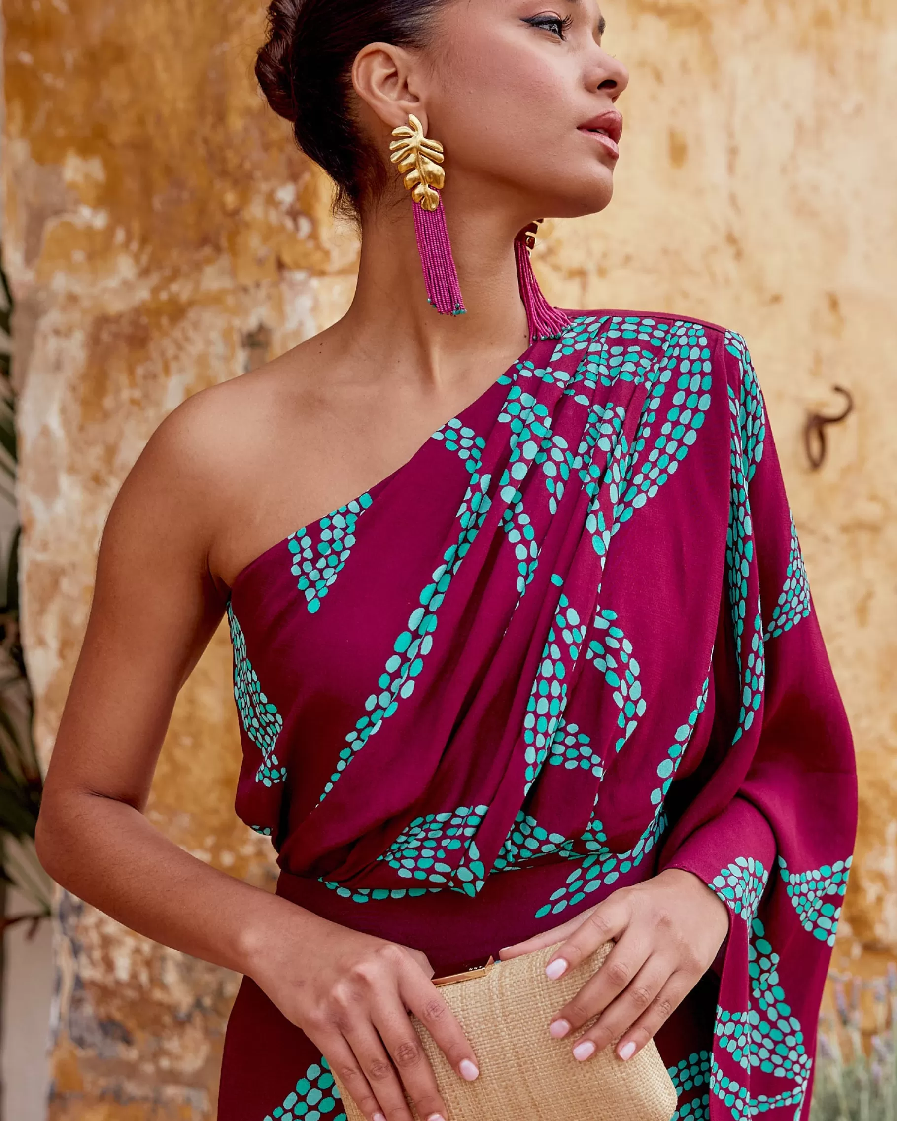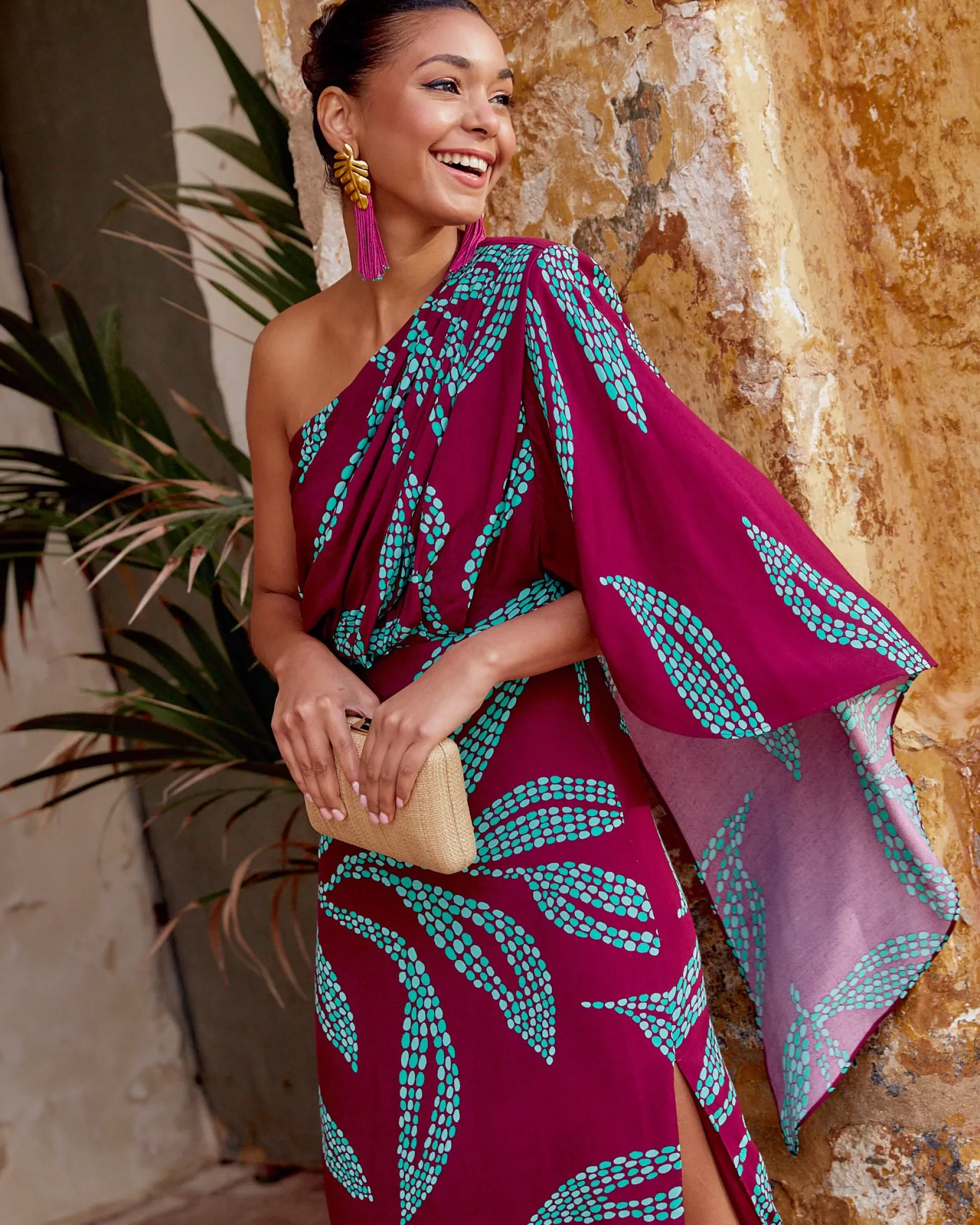 Vestido midi asimétrico con abertura lateral, drapeado en la parte delantera y manga estilo capa.