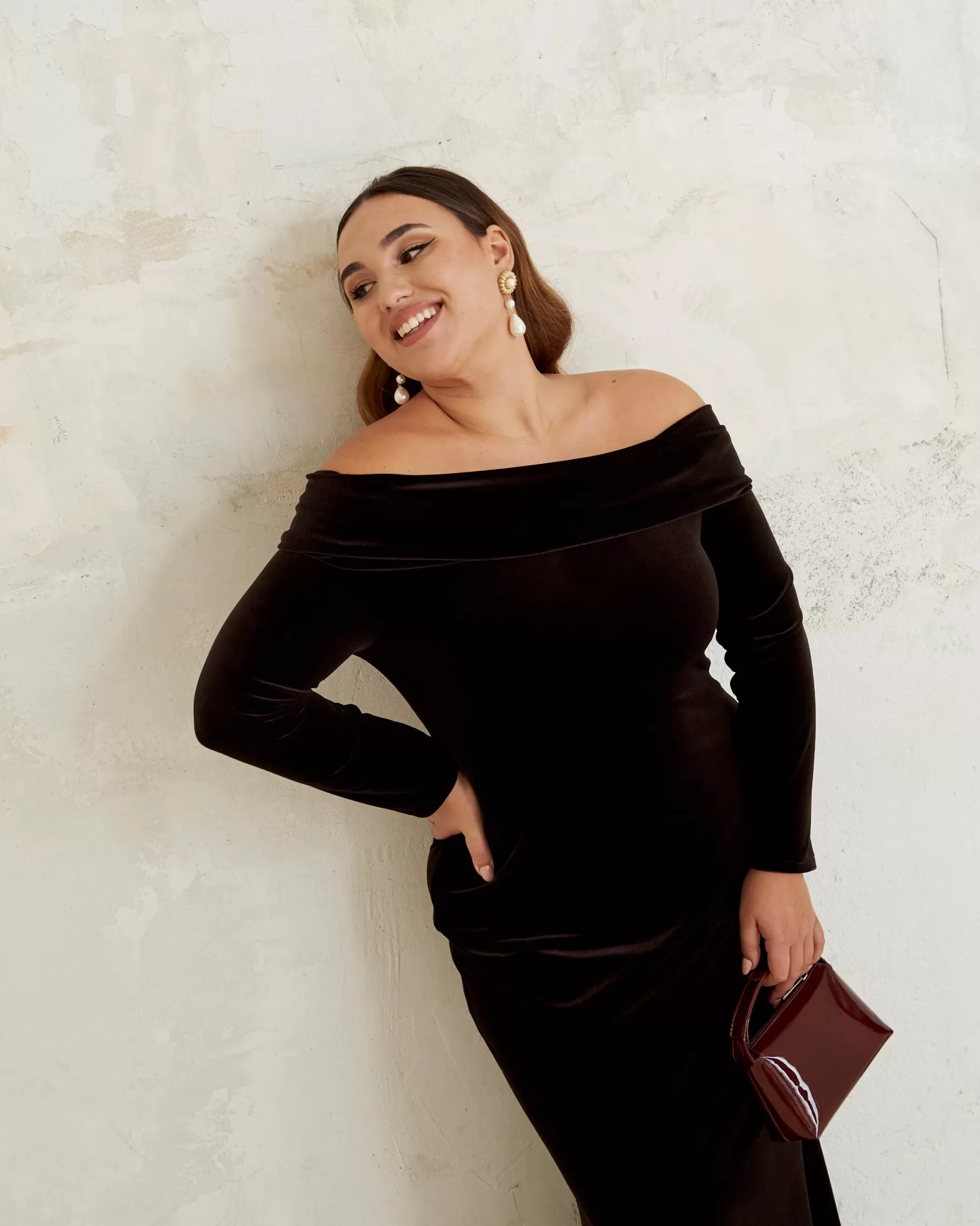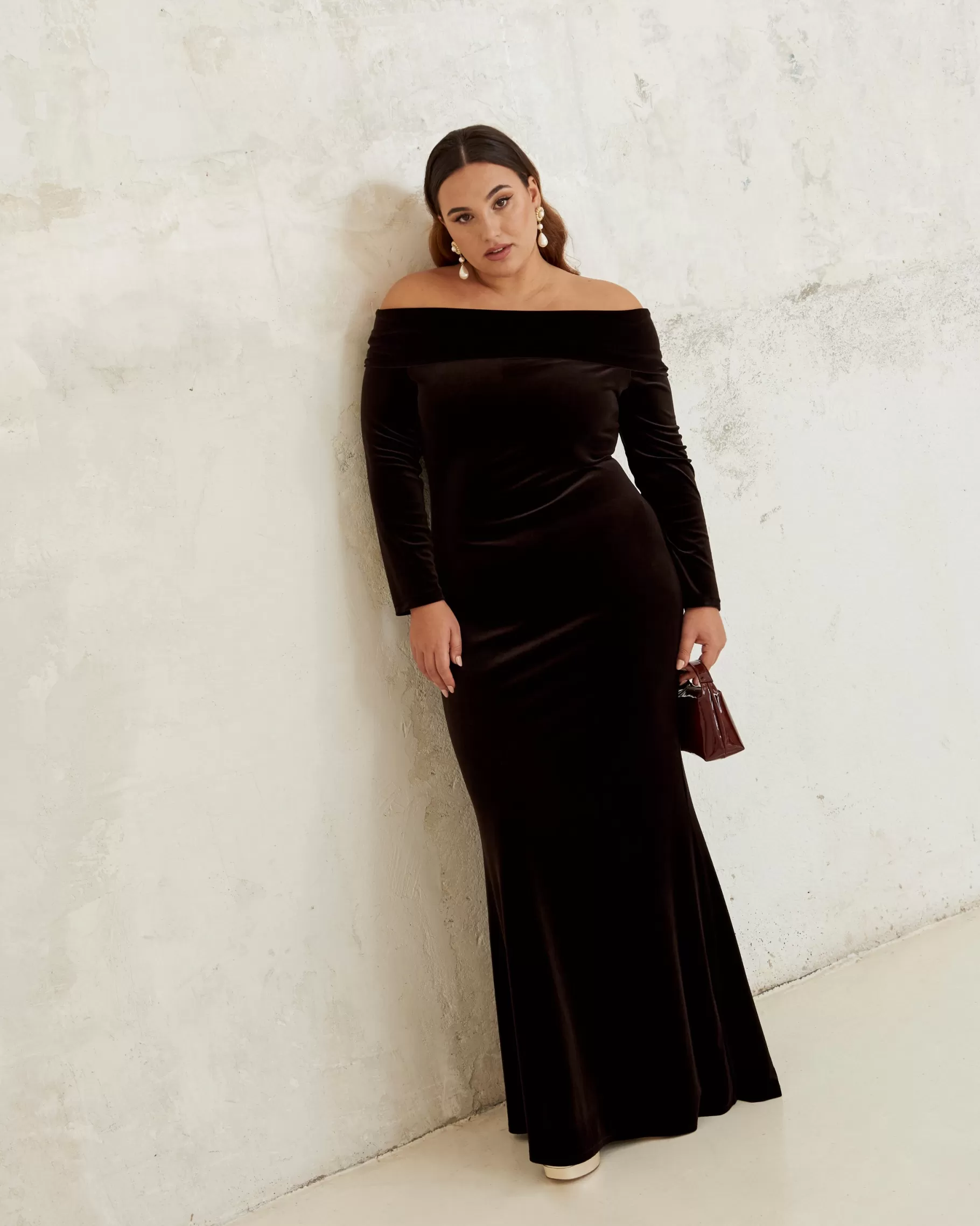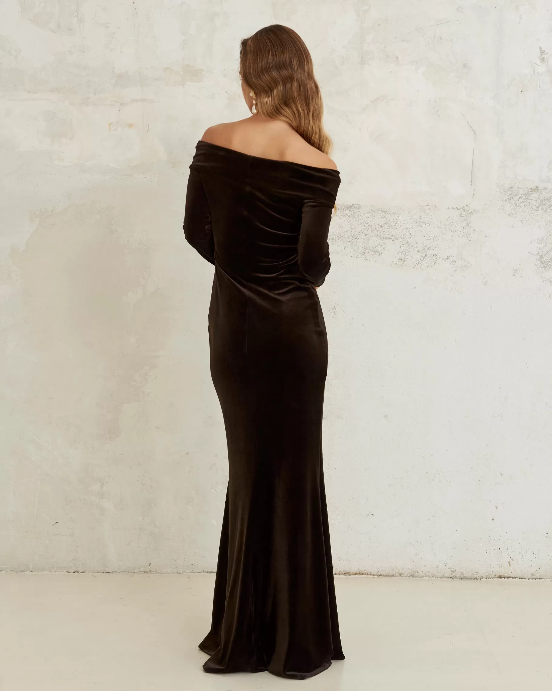Vestido largo ajustado con escote bardot y manga larga.