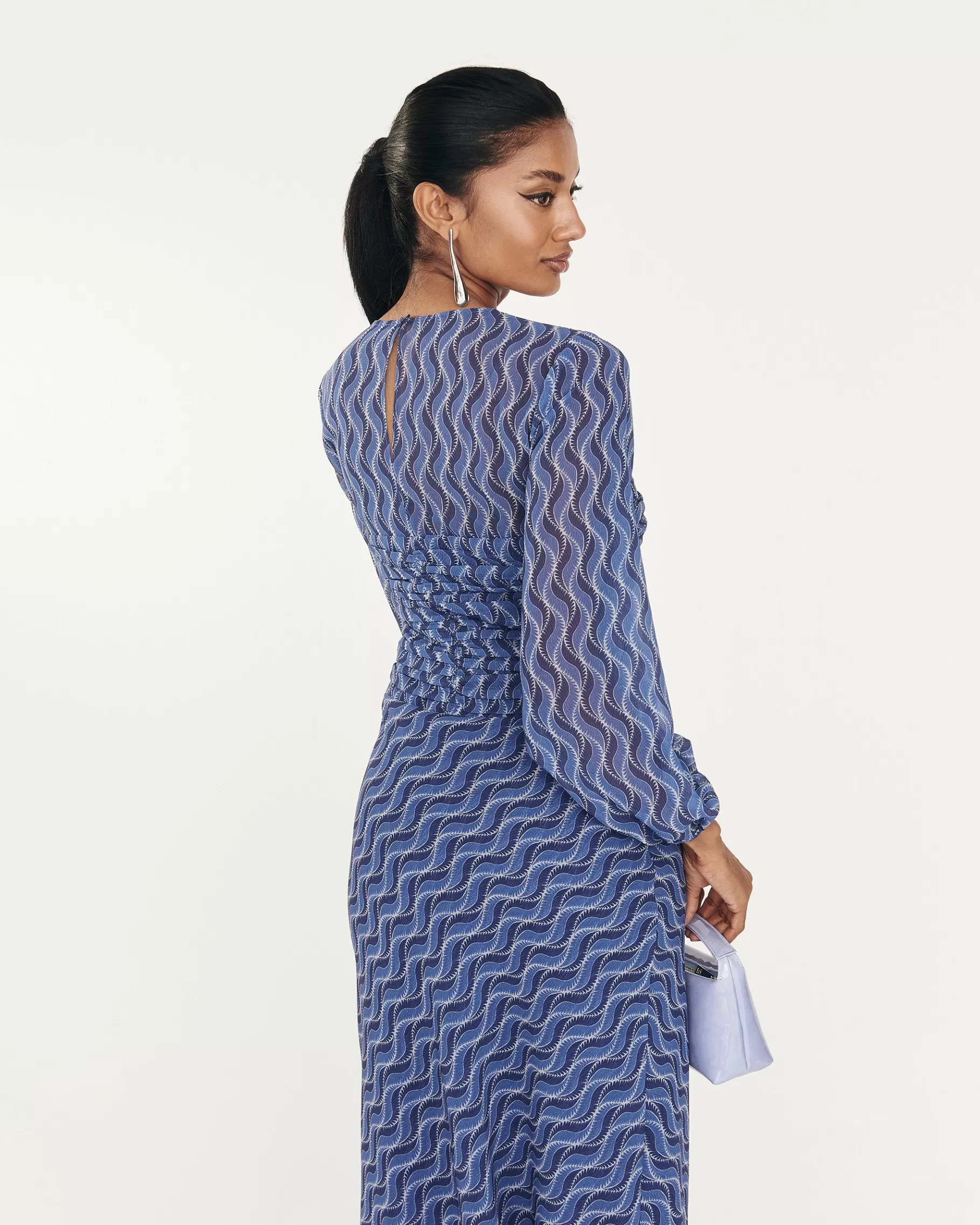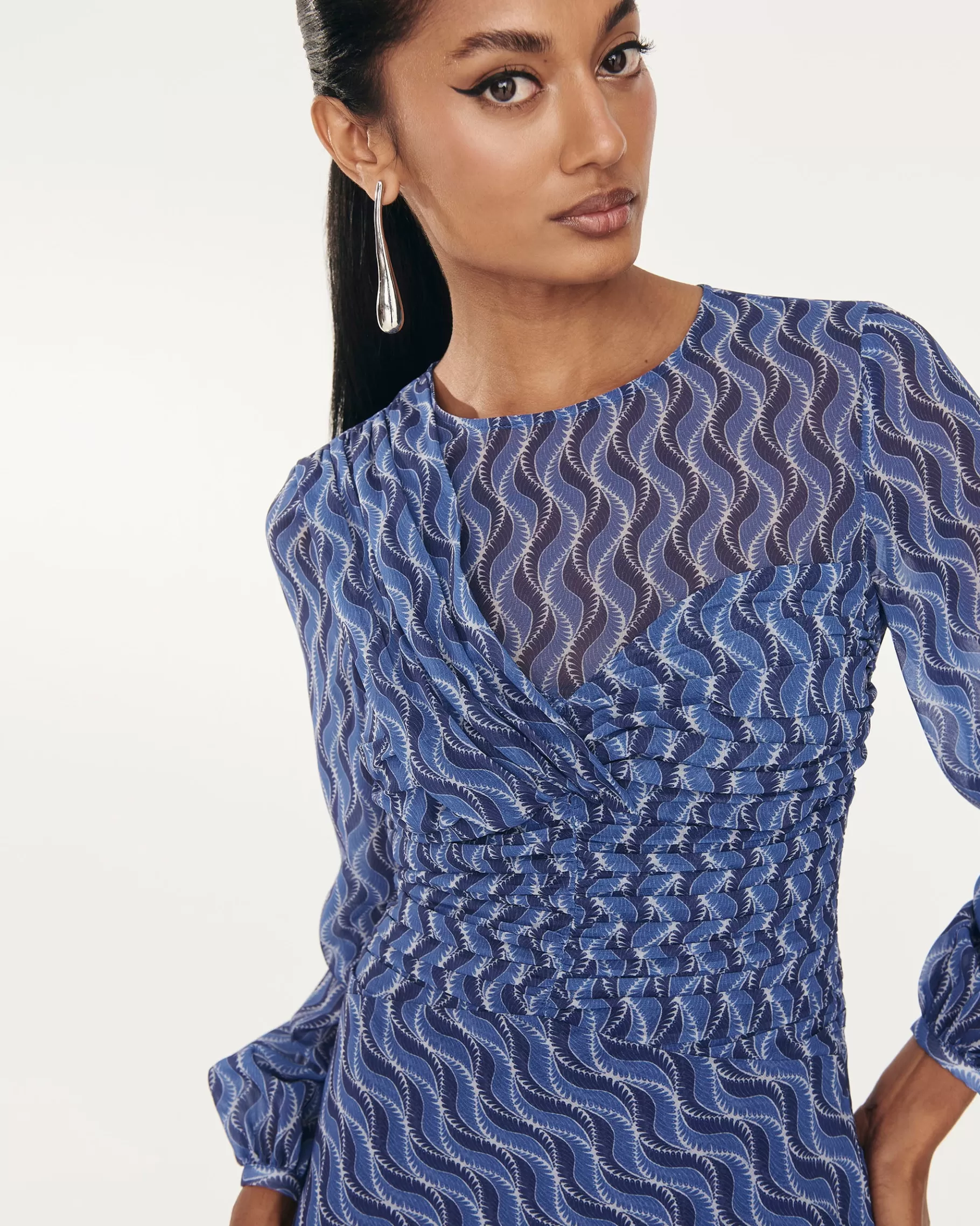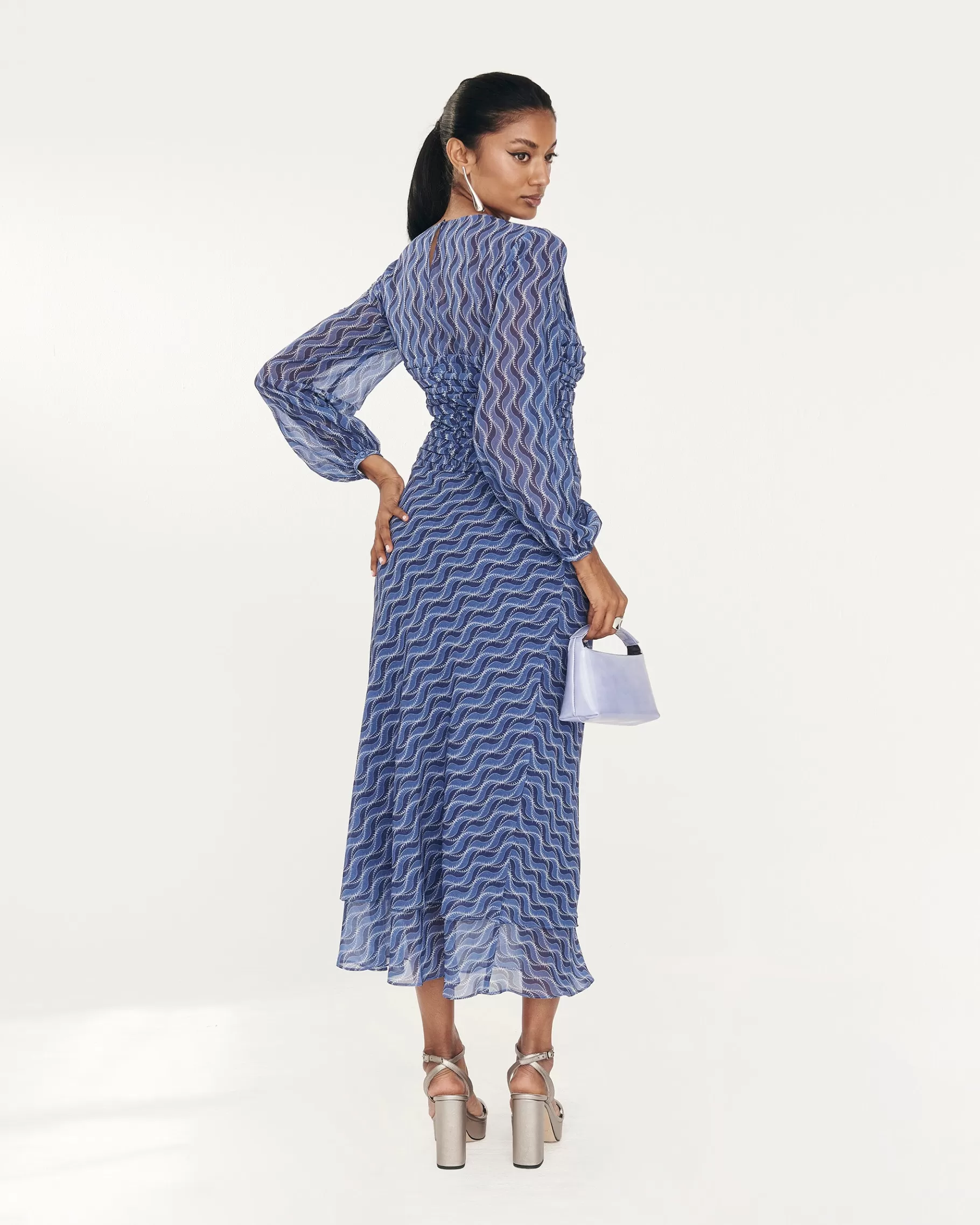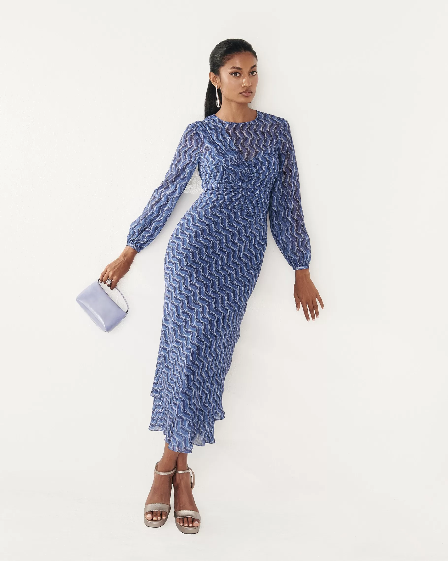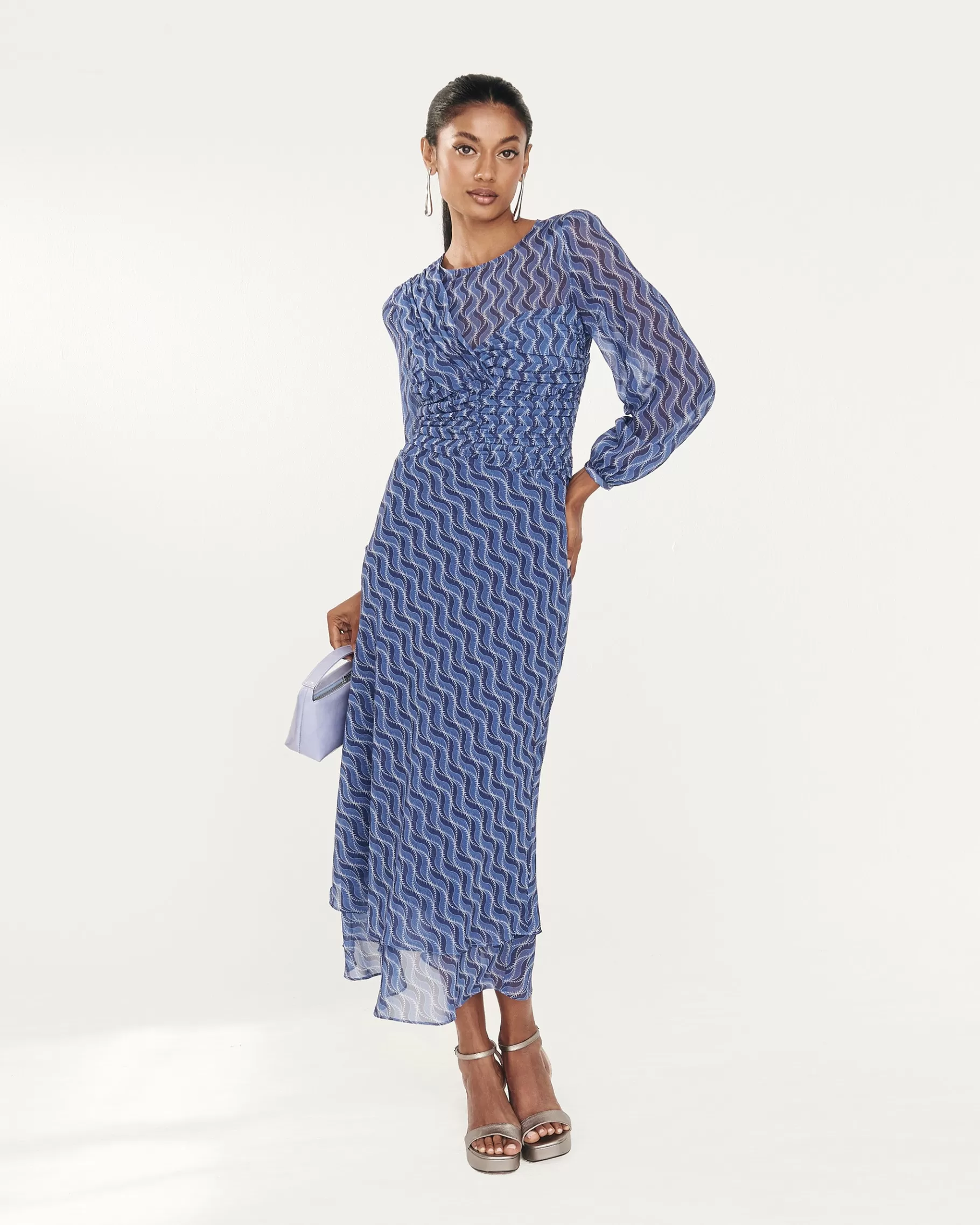 Vestido midi de manga larga con drapeado en la parte delantera y falda con doble volante. CONSEJO PARA ELEGIR TALLA: …