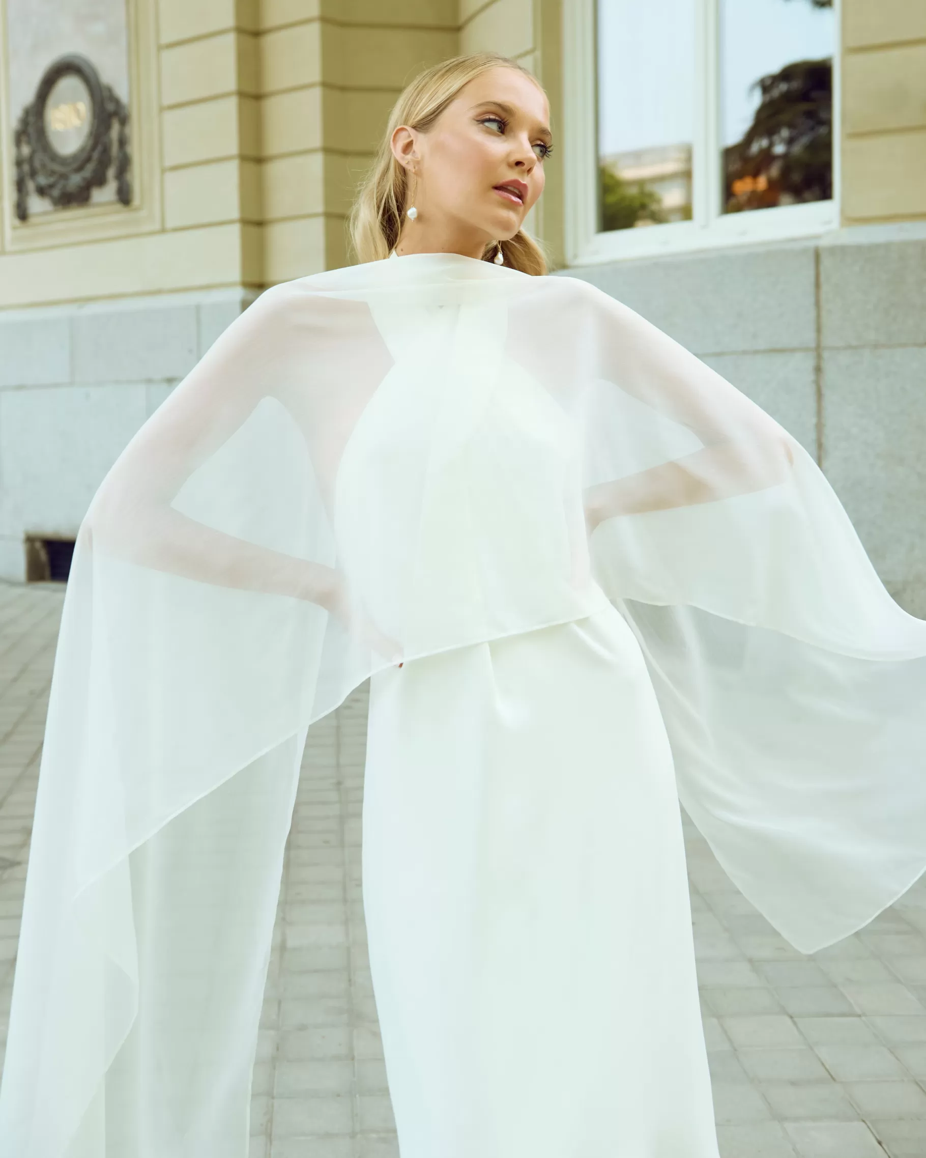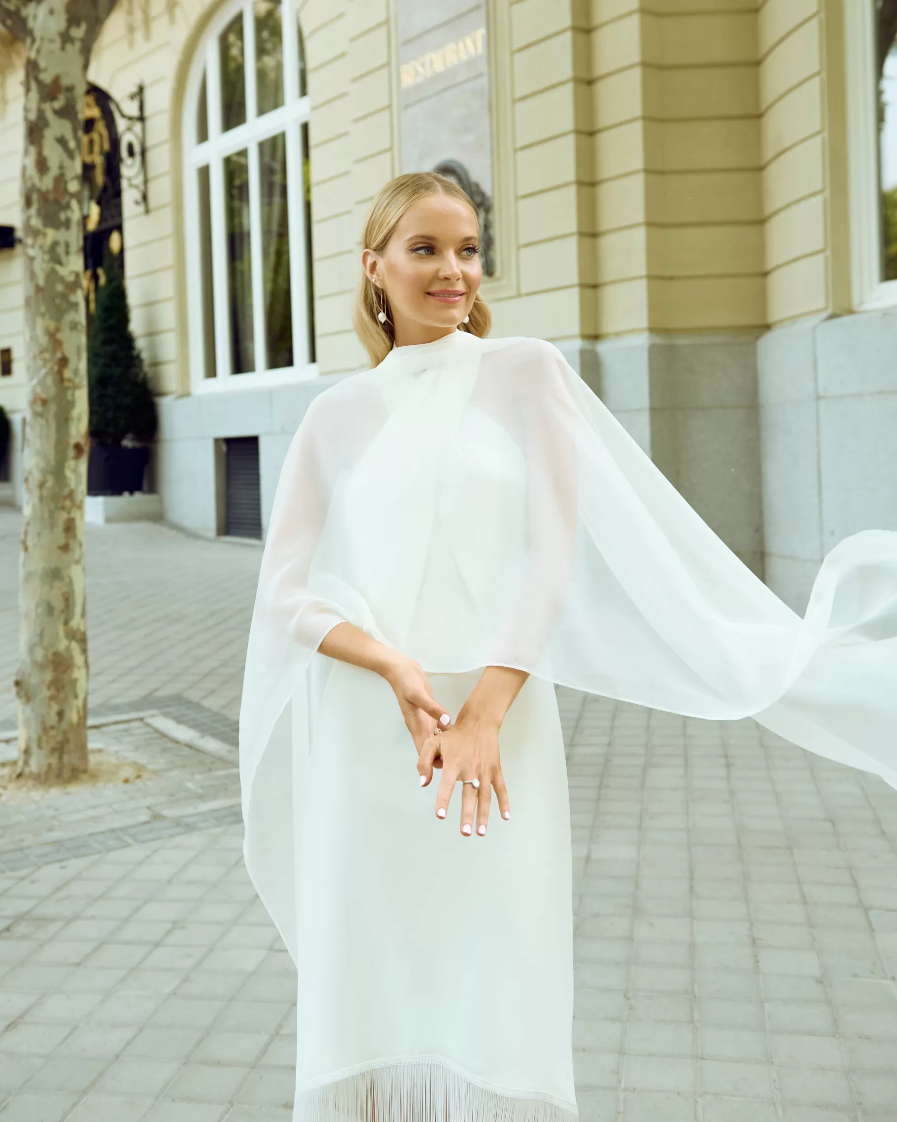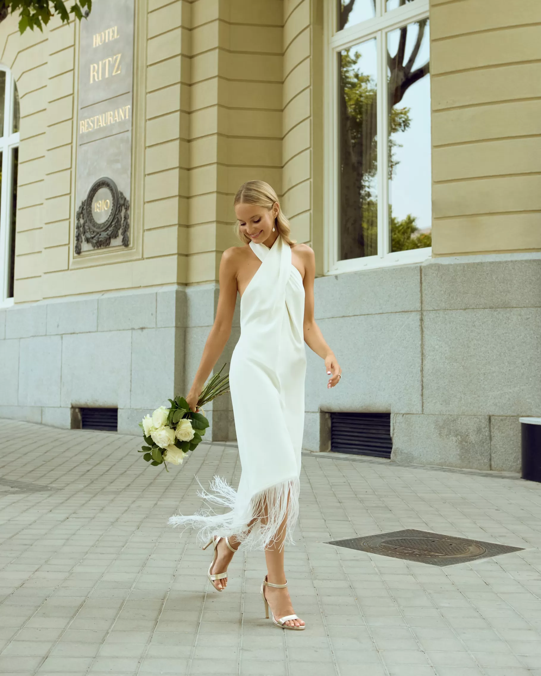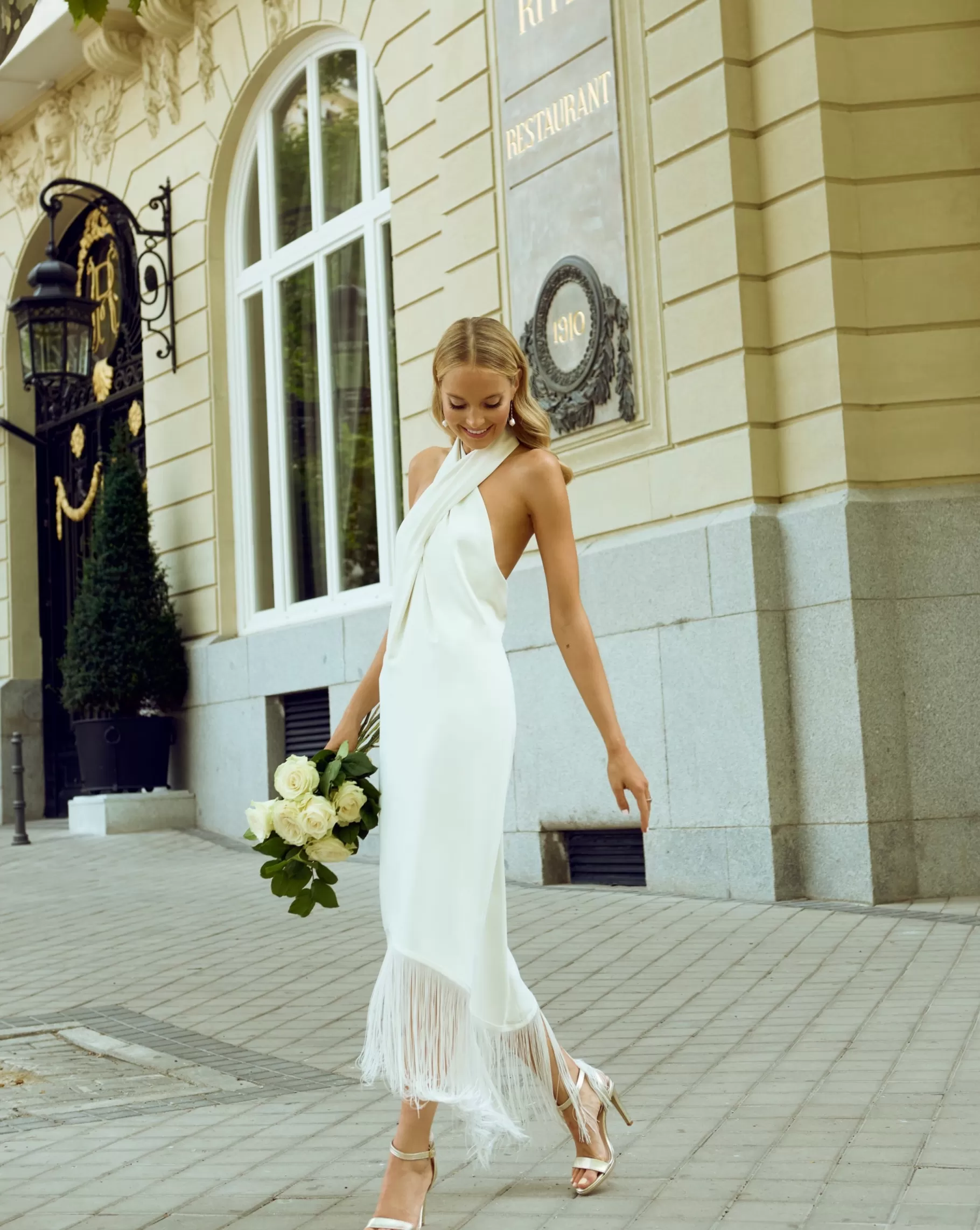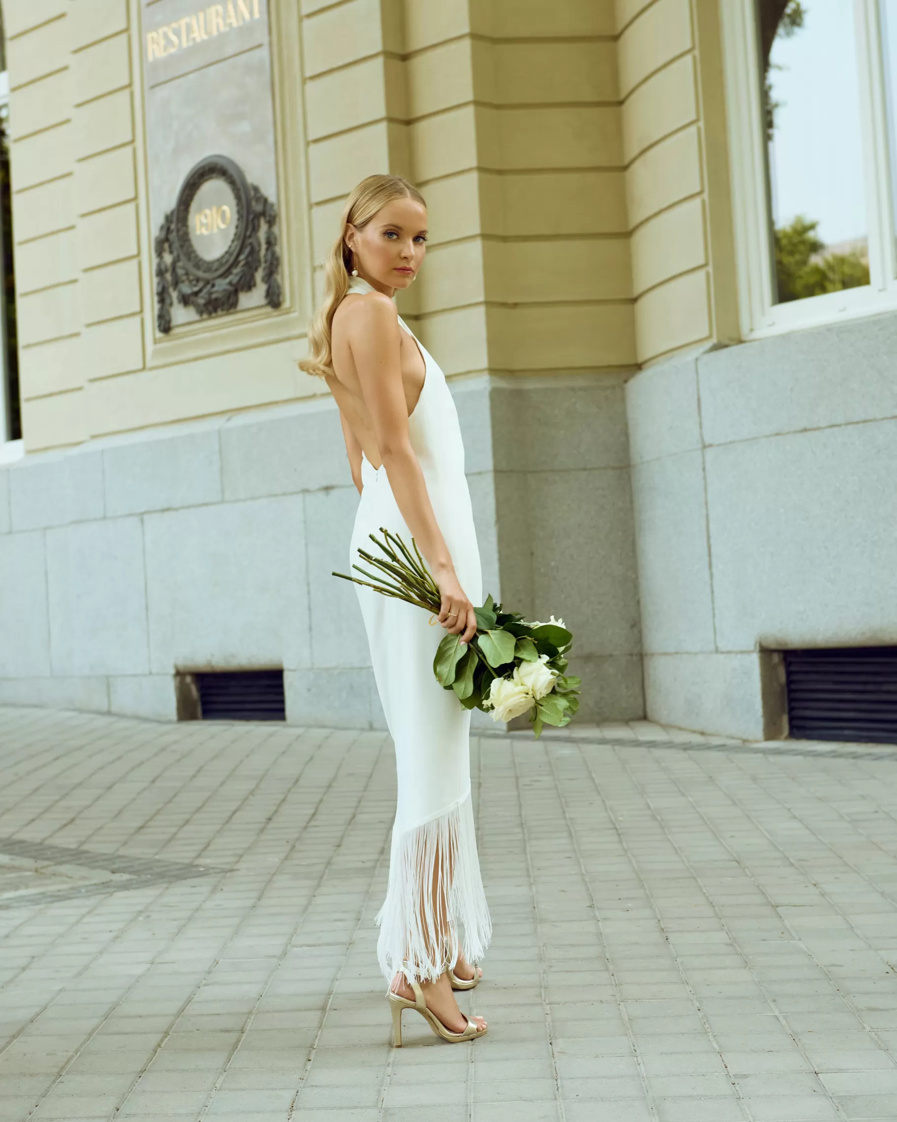 Vestido midi con escote halter cruzado, espalda descubierta en forma de V y bajo con flecos en el mismo tono que le dan movimiento al vestido. Cierre con cremallera en la parte trasera.