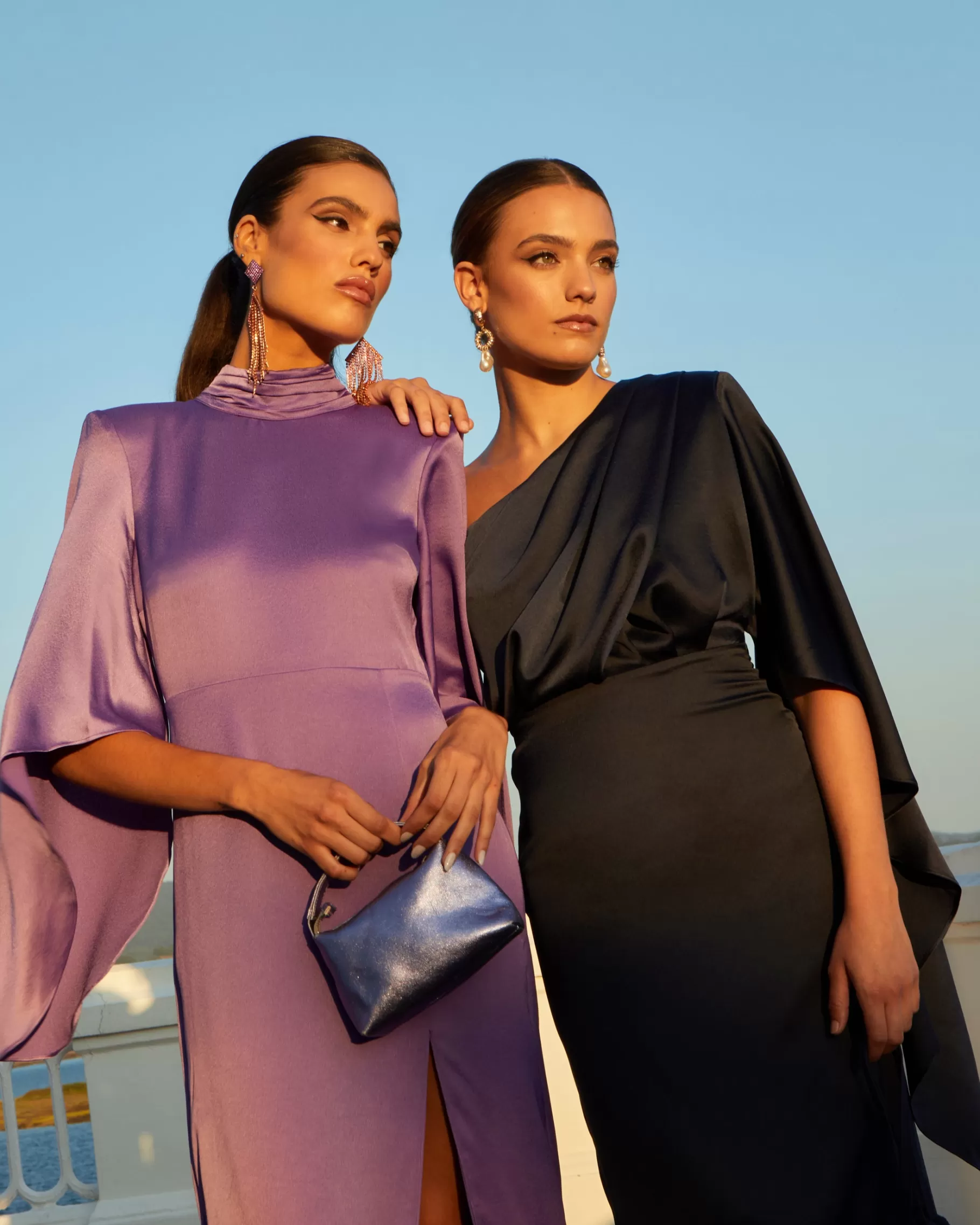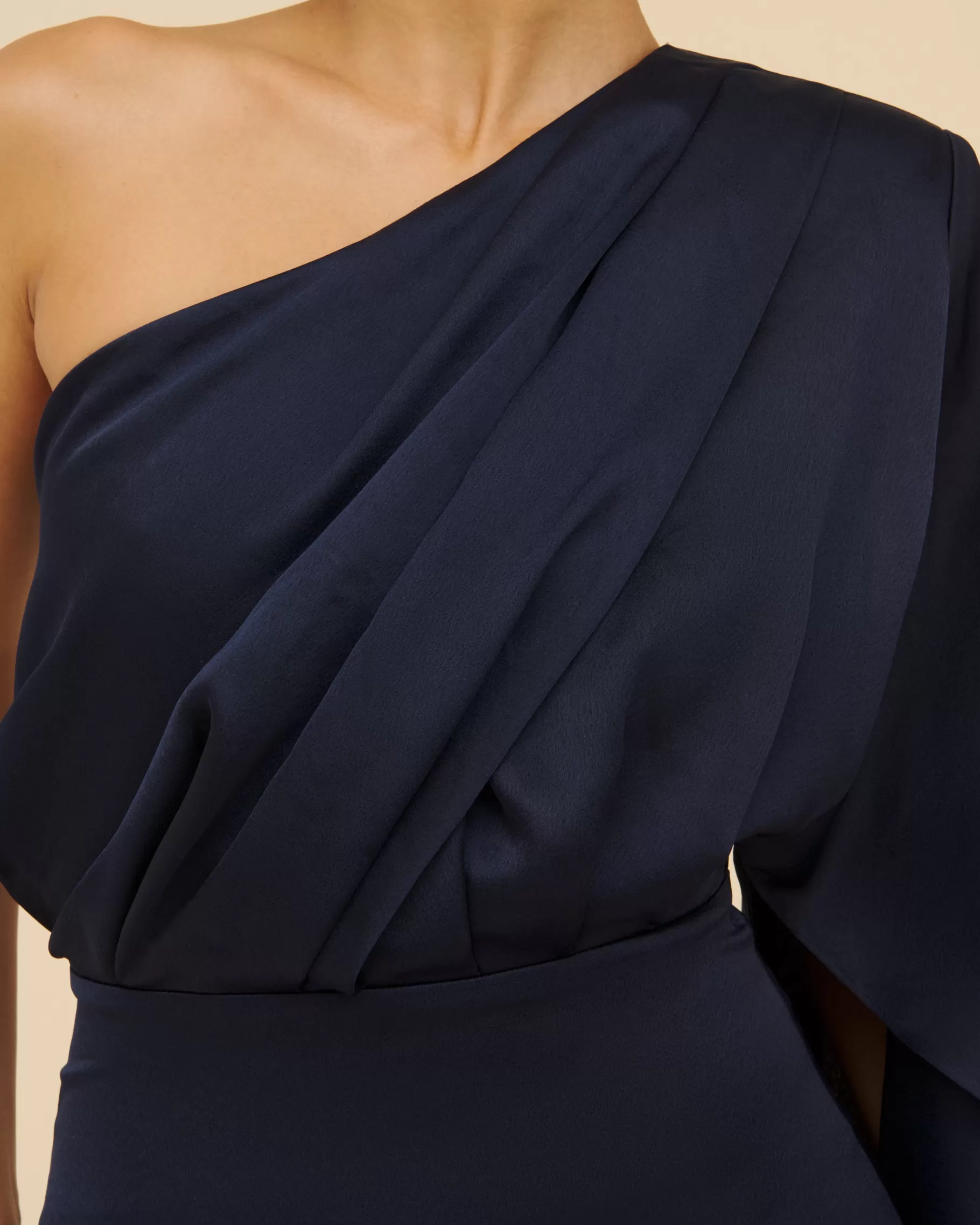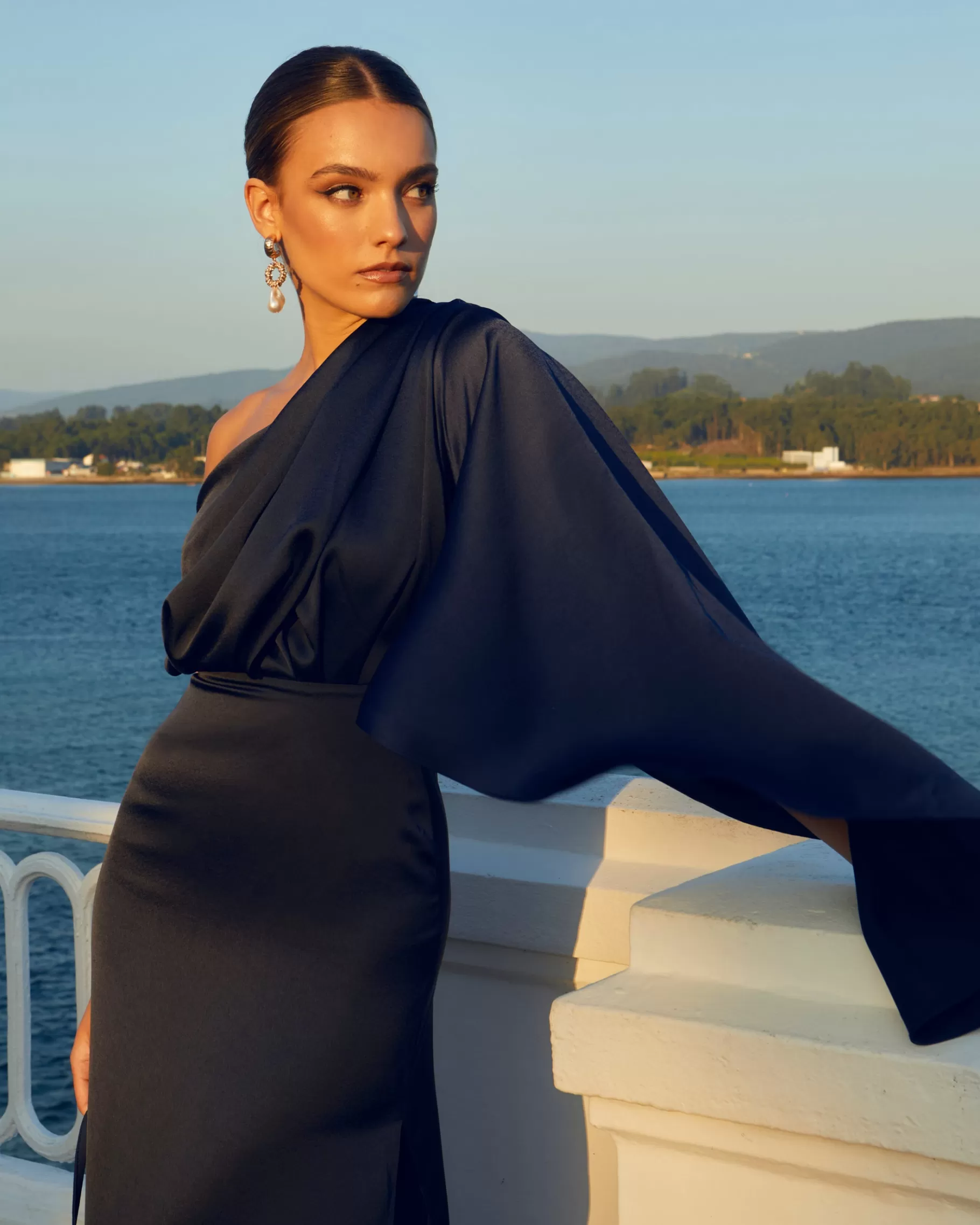 Vestido largo asimétrico con abertura lateral, drapeado en la parte delantera y manga estilo capa.