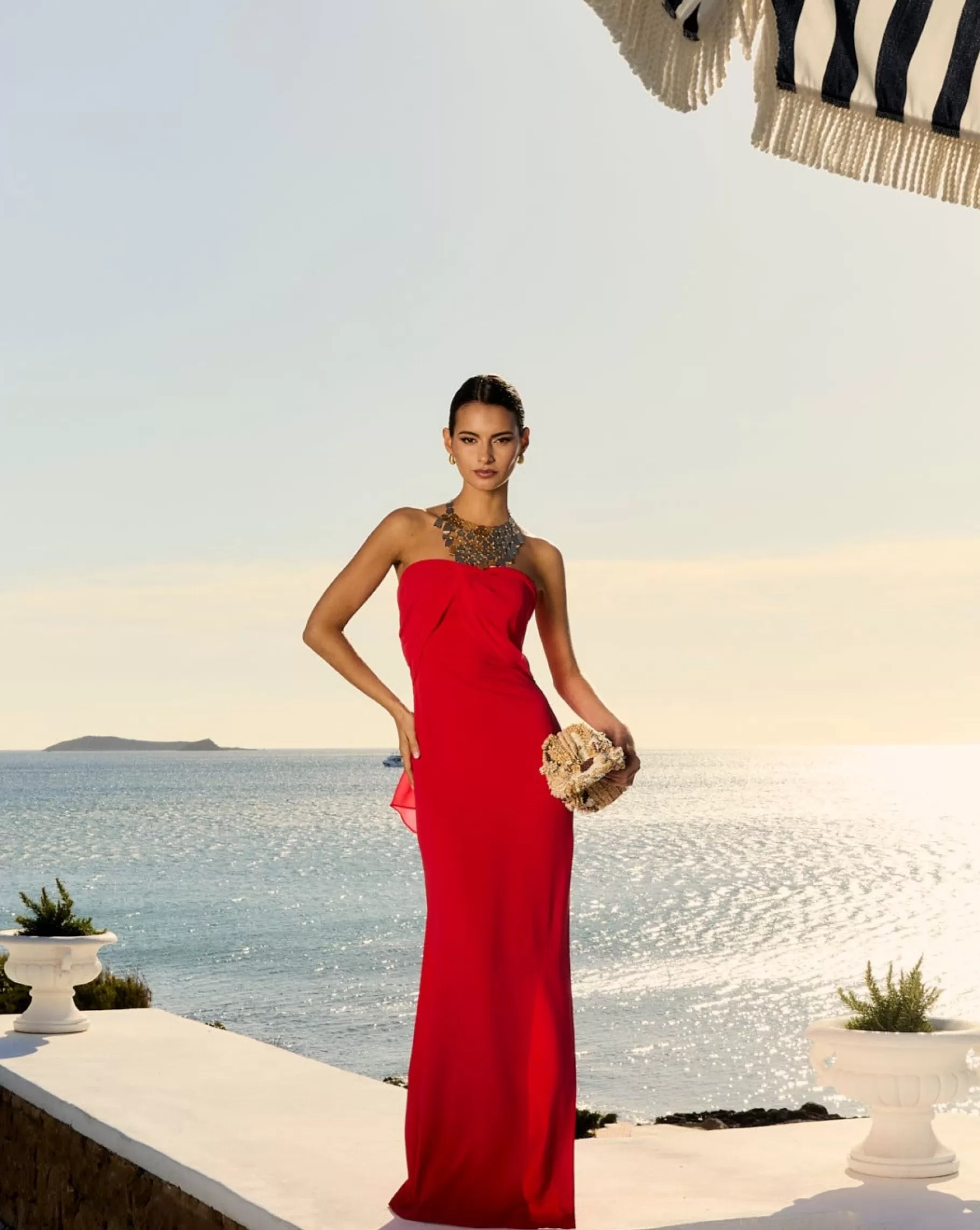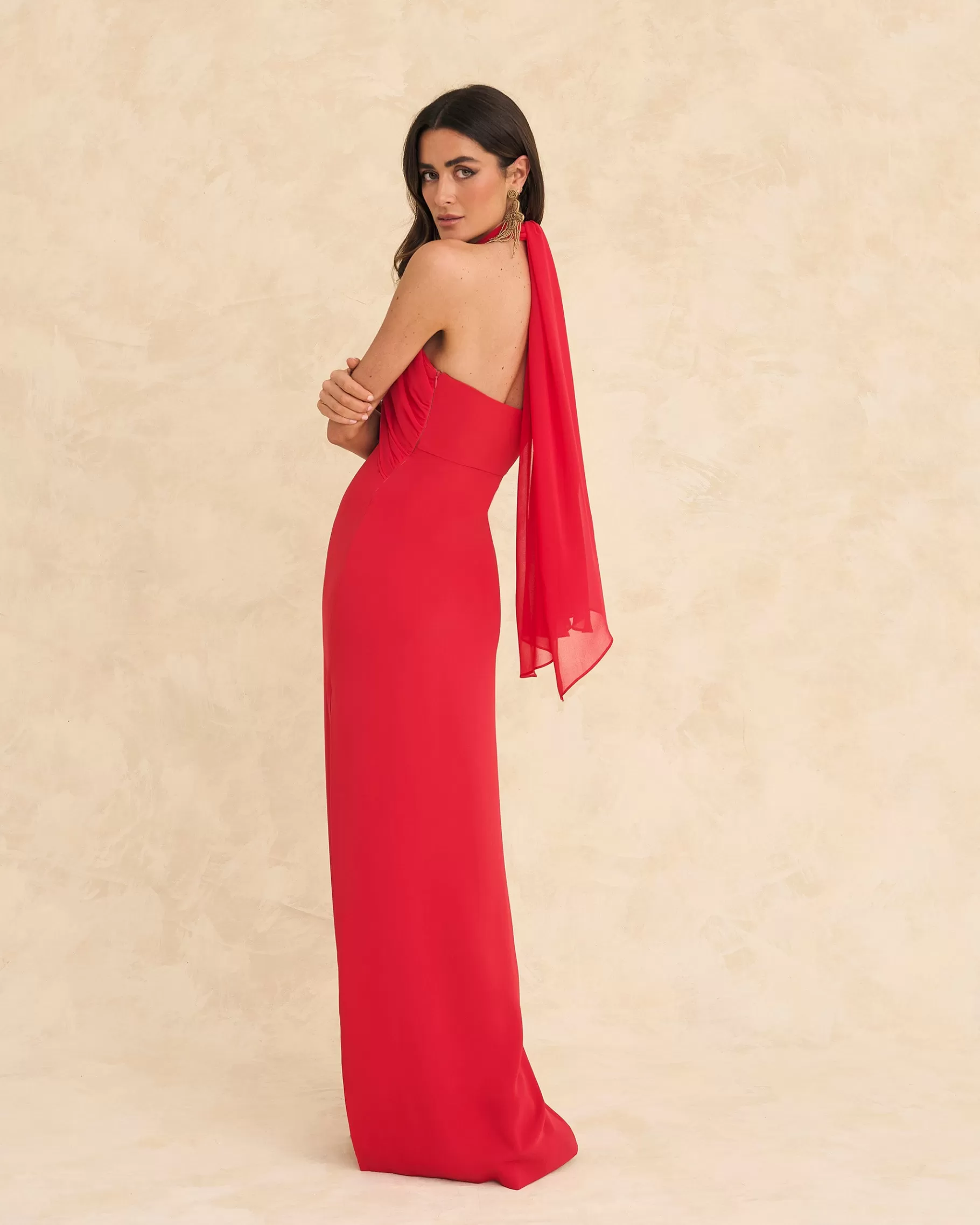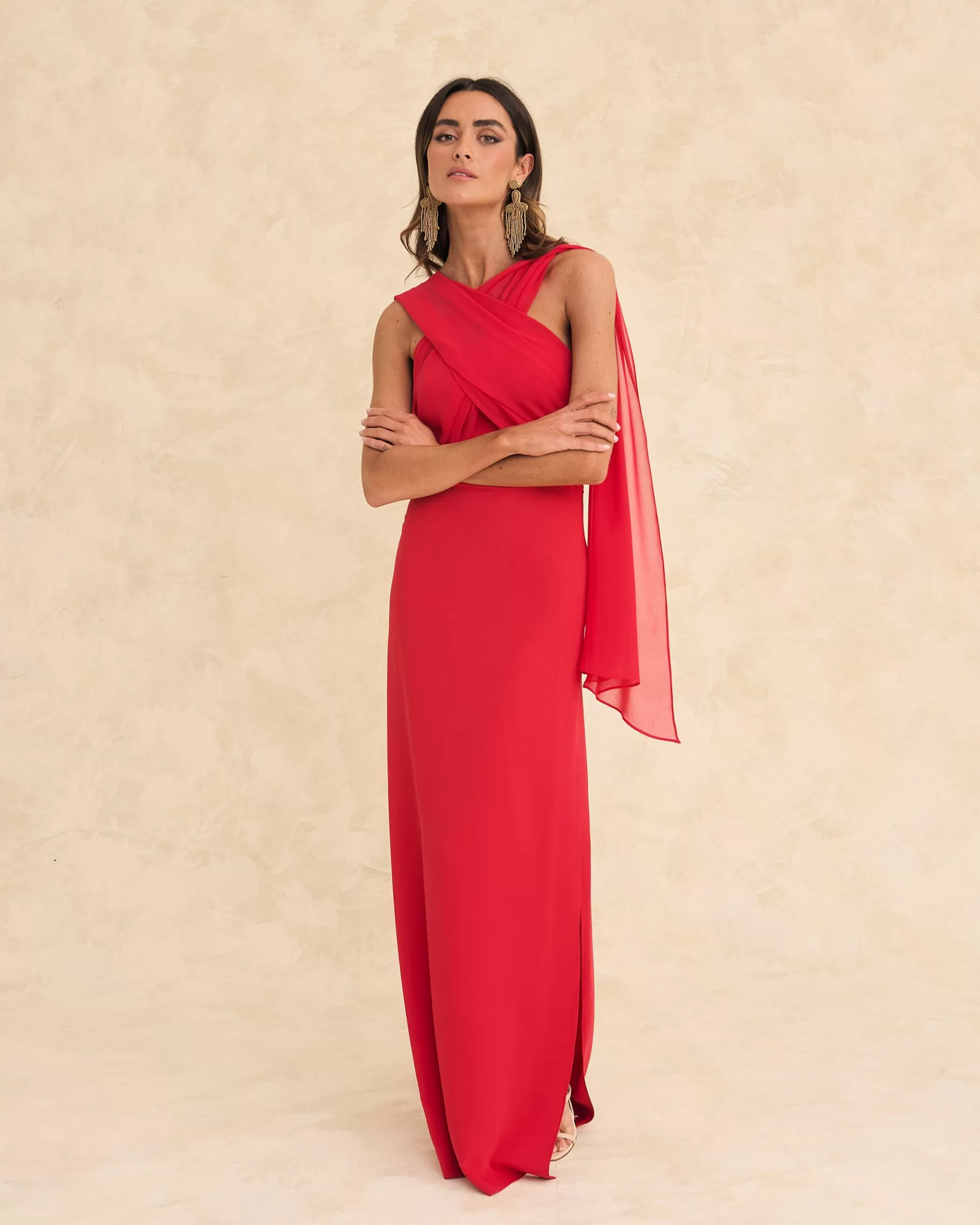 Vestido largo con escote palabra de honor, chal multiposición y abertura lateral.