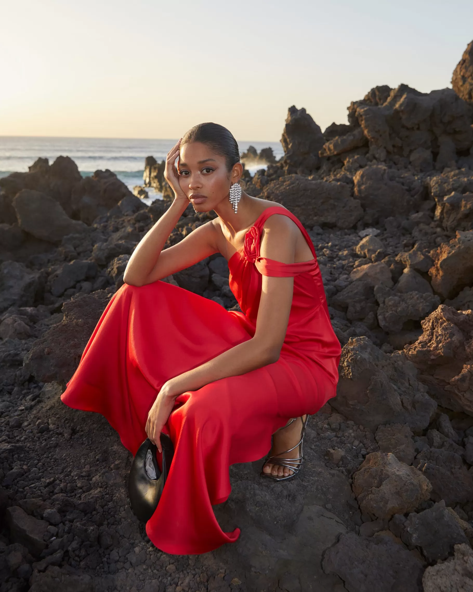 Vestido largo con escote asimétrico, abertura en el lateral y detalle de flor en el pecho.CONSEJO PARA ELEGIR TALLA: …