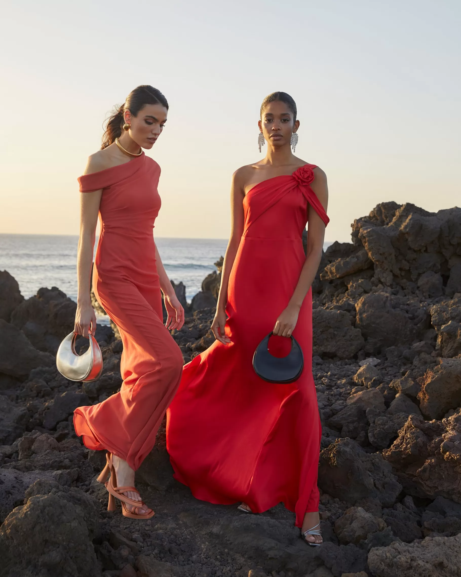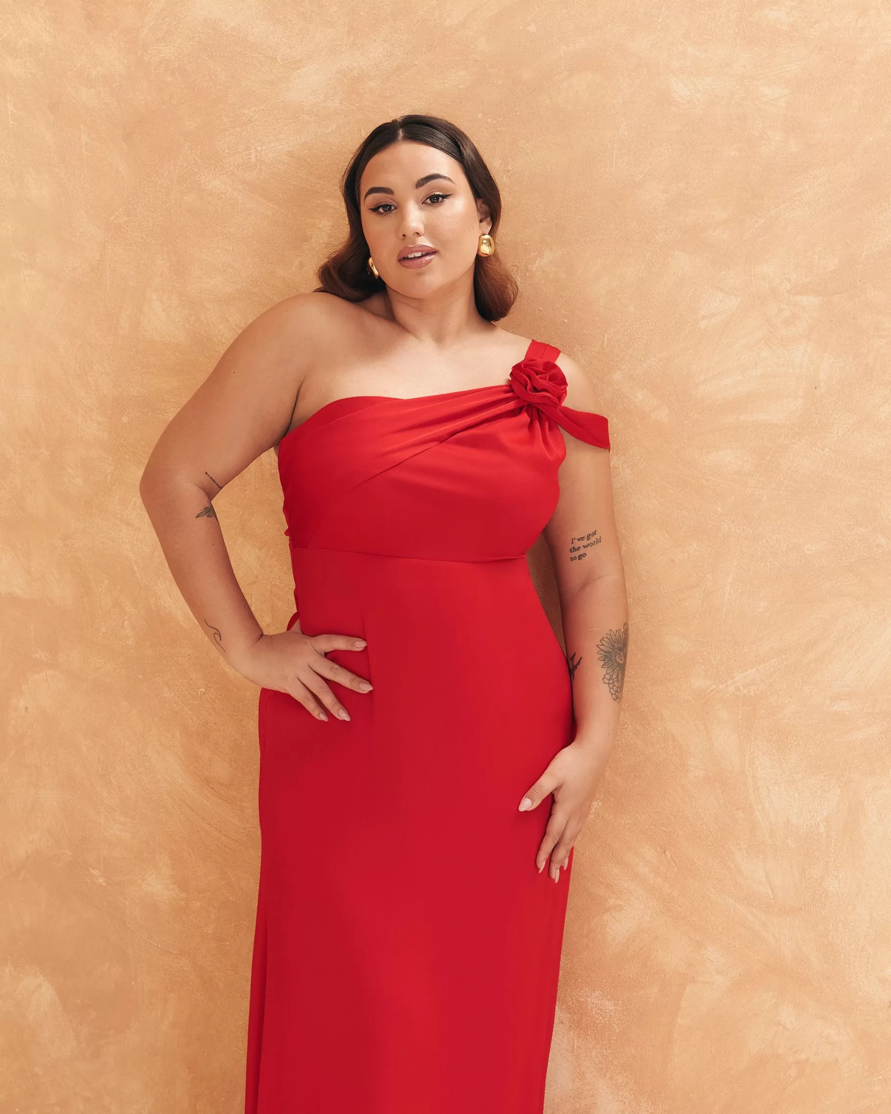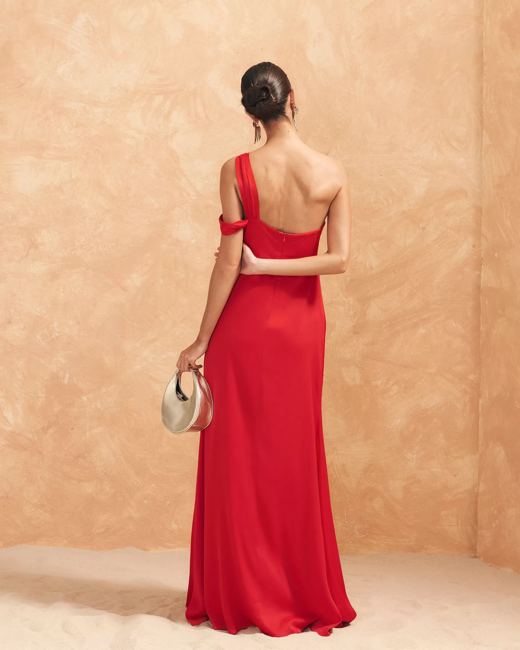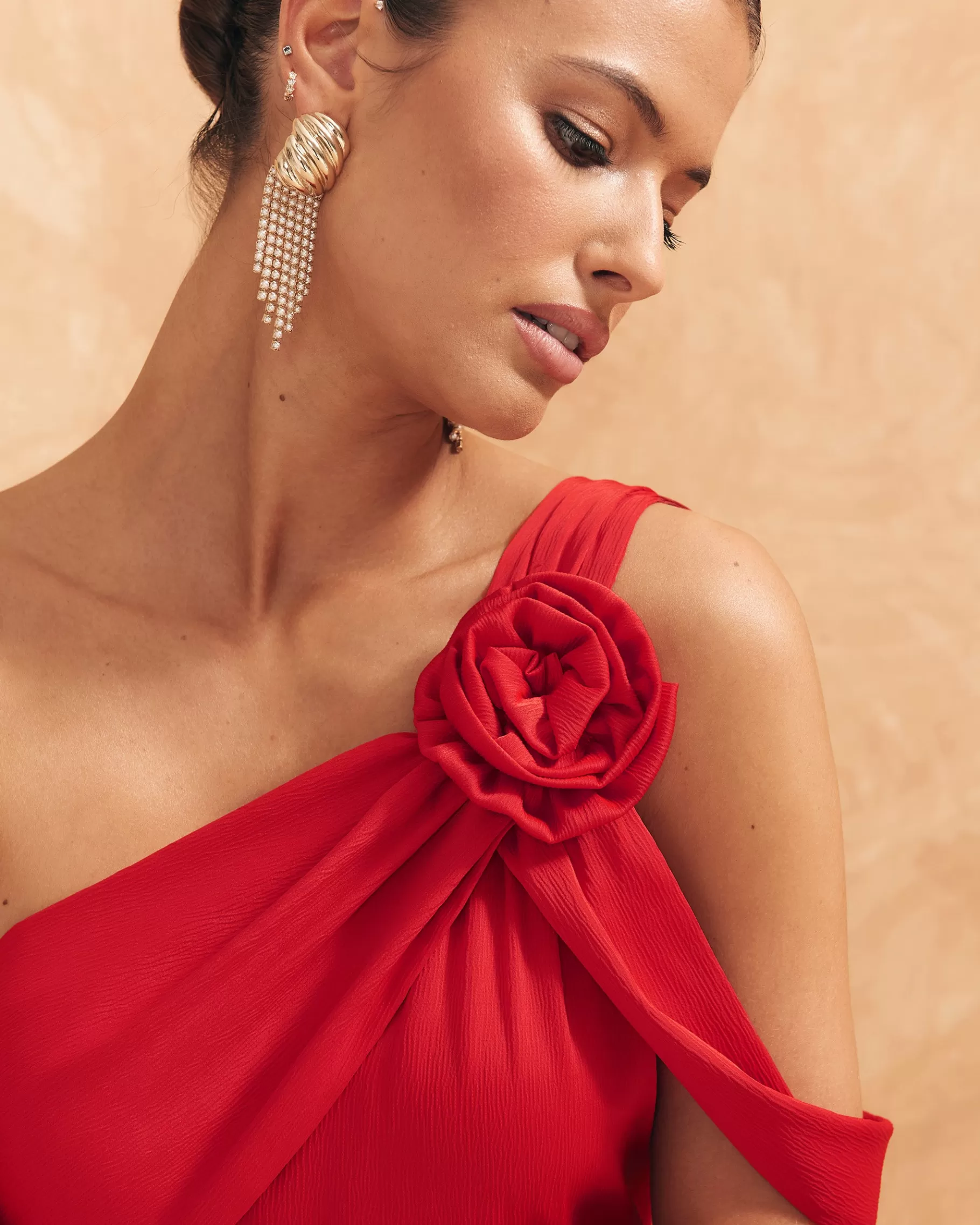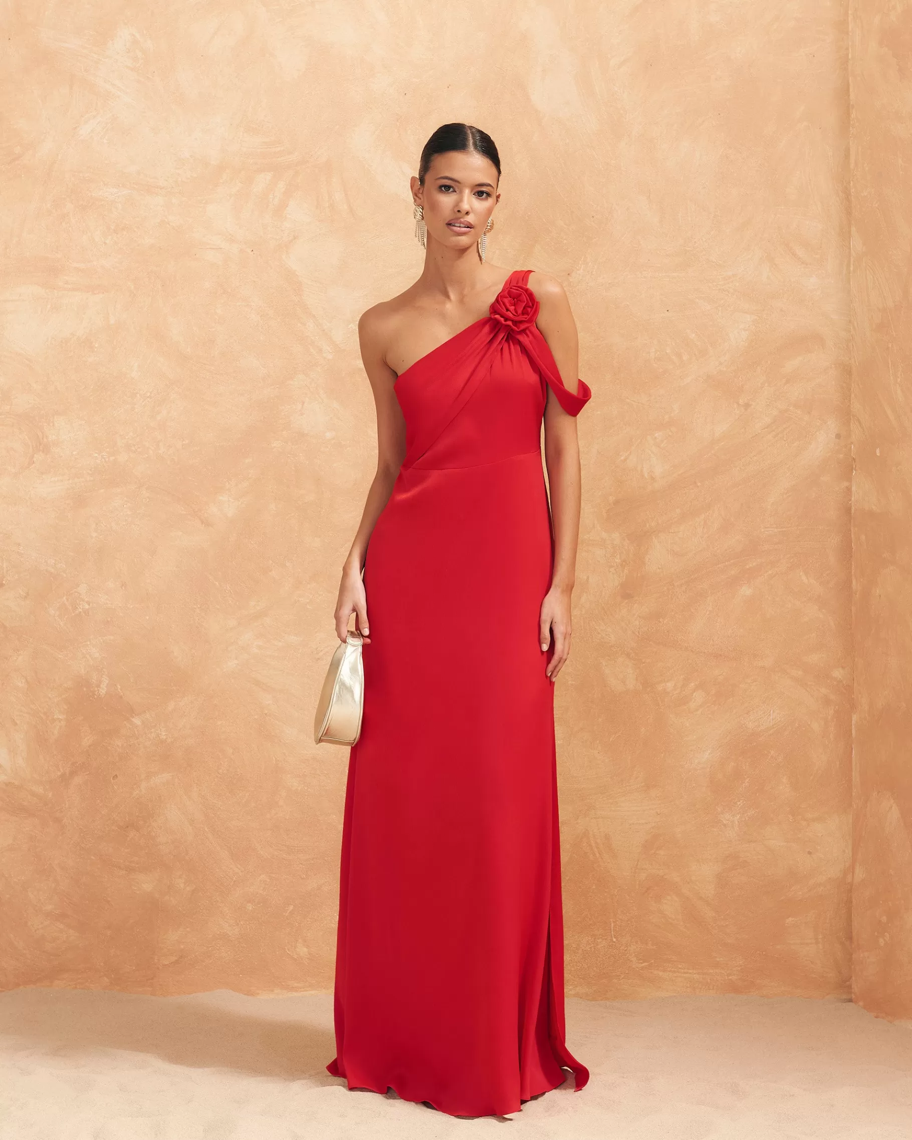 Vestido largo con escote asimétrico, abertura en el lateral y detalle de flor en el pecho.