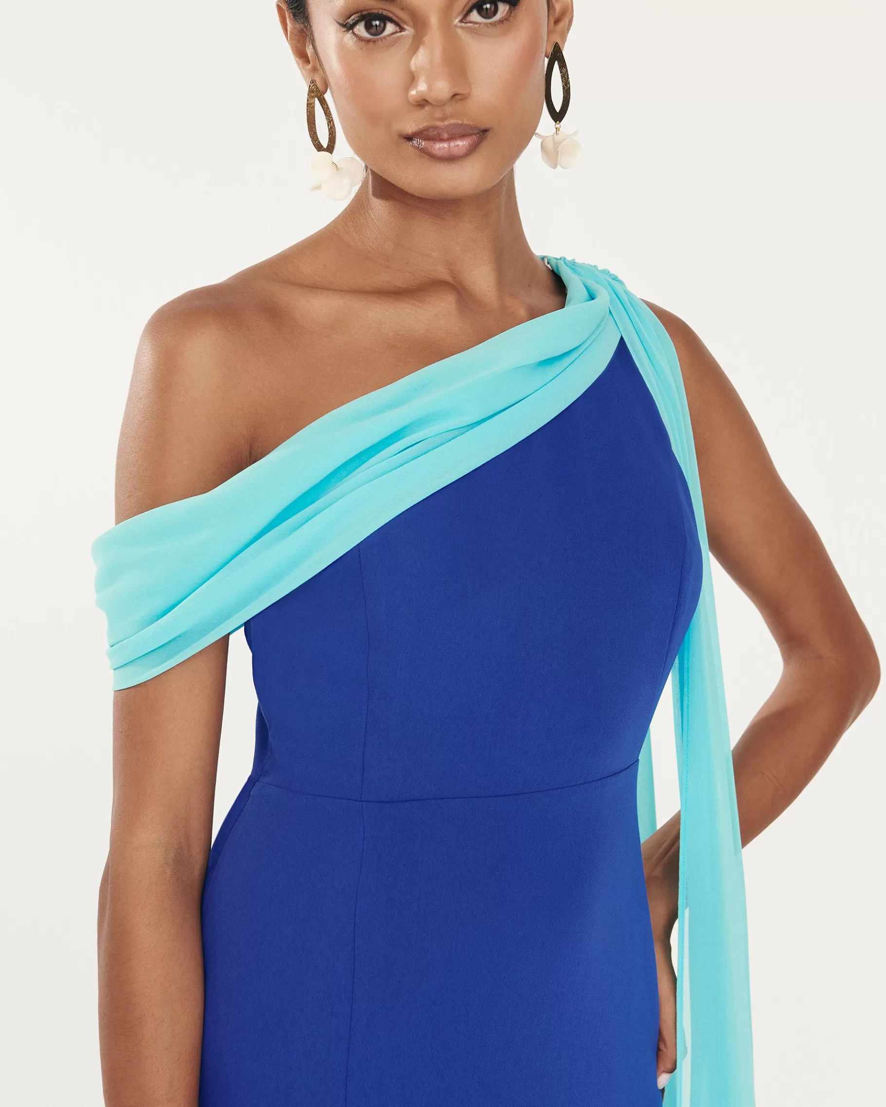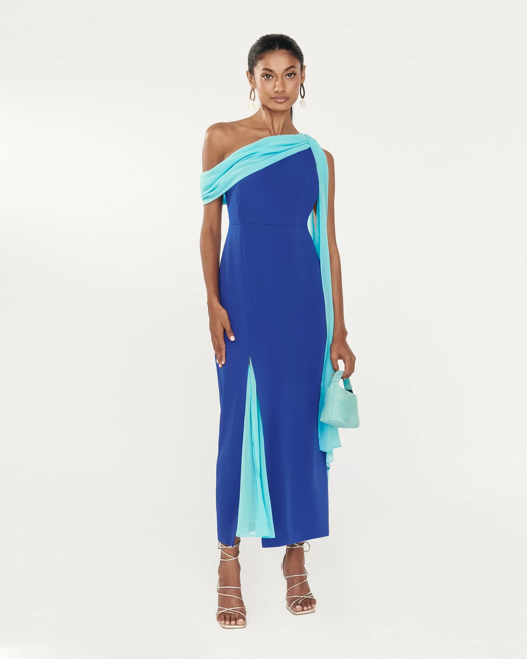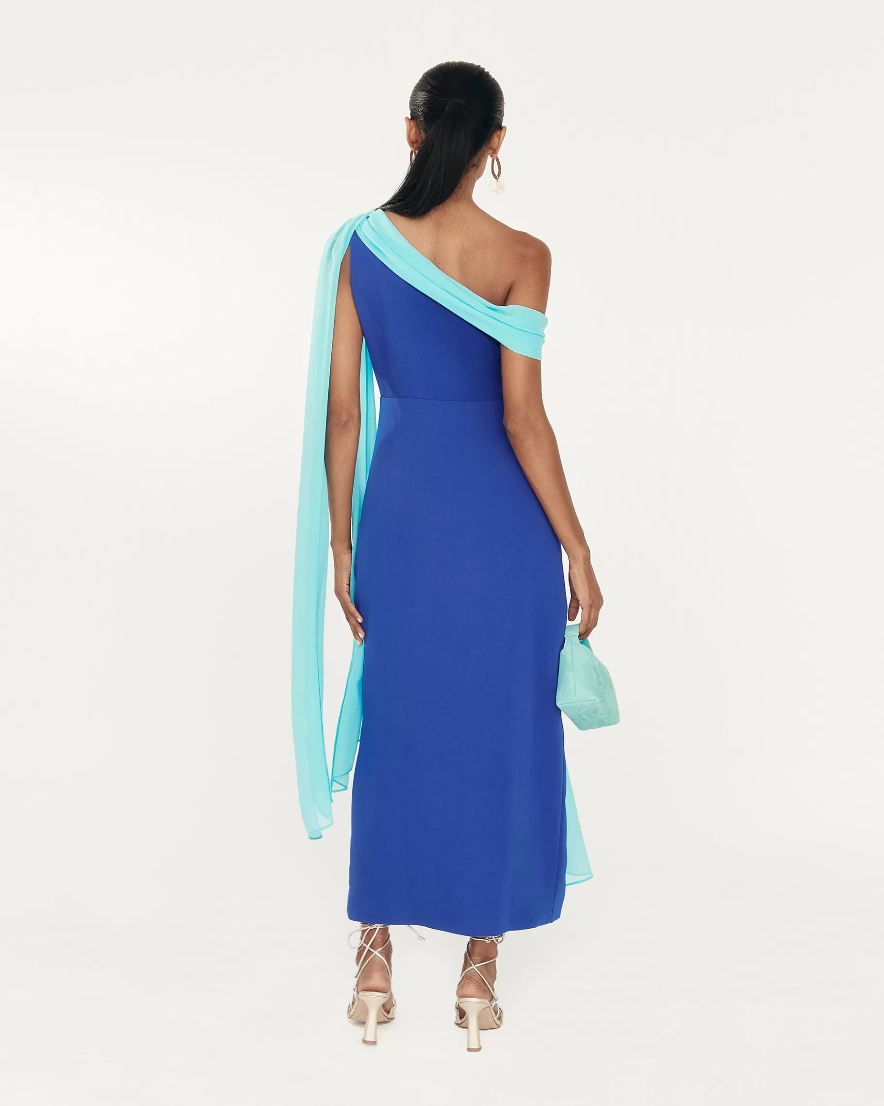 Vestido midi bicolor con escote bardot asimétrico, lazada en el hombro y abertura lateral con detalle de gasa.