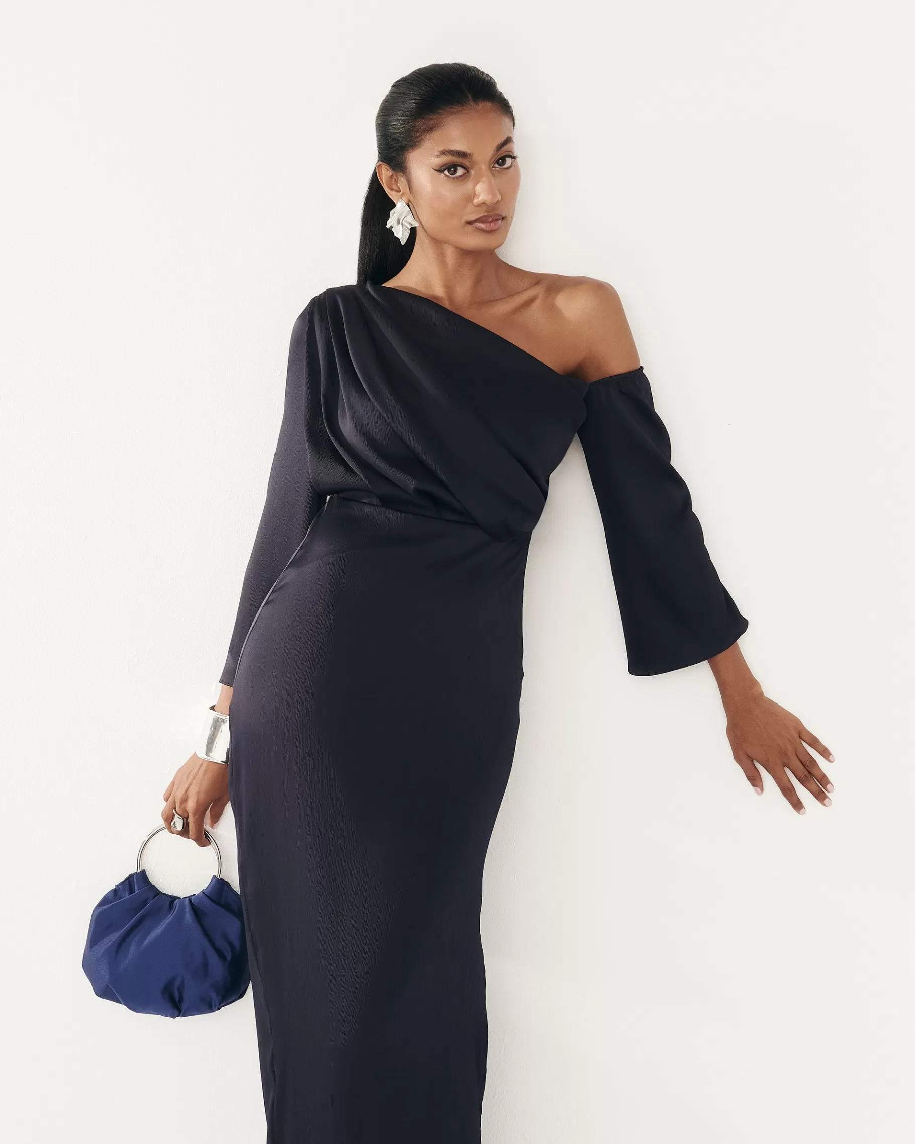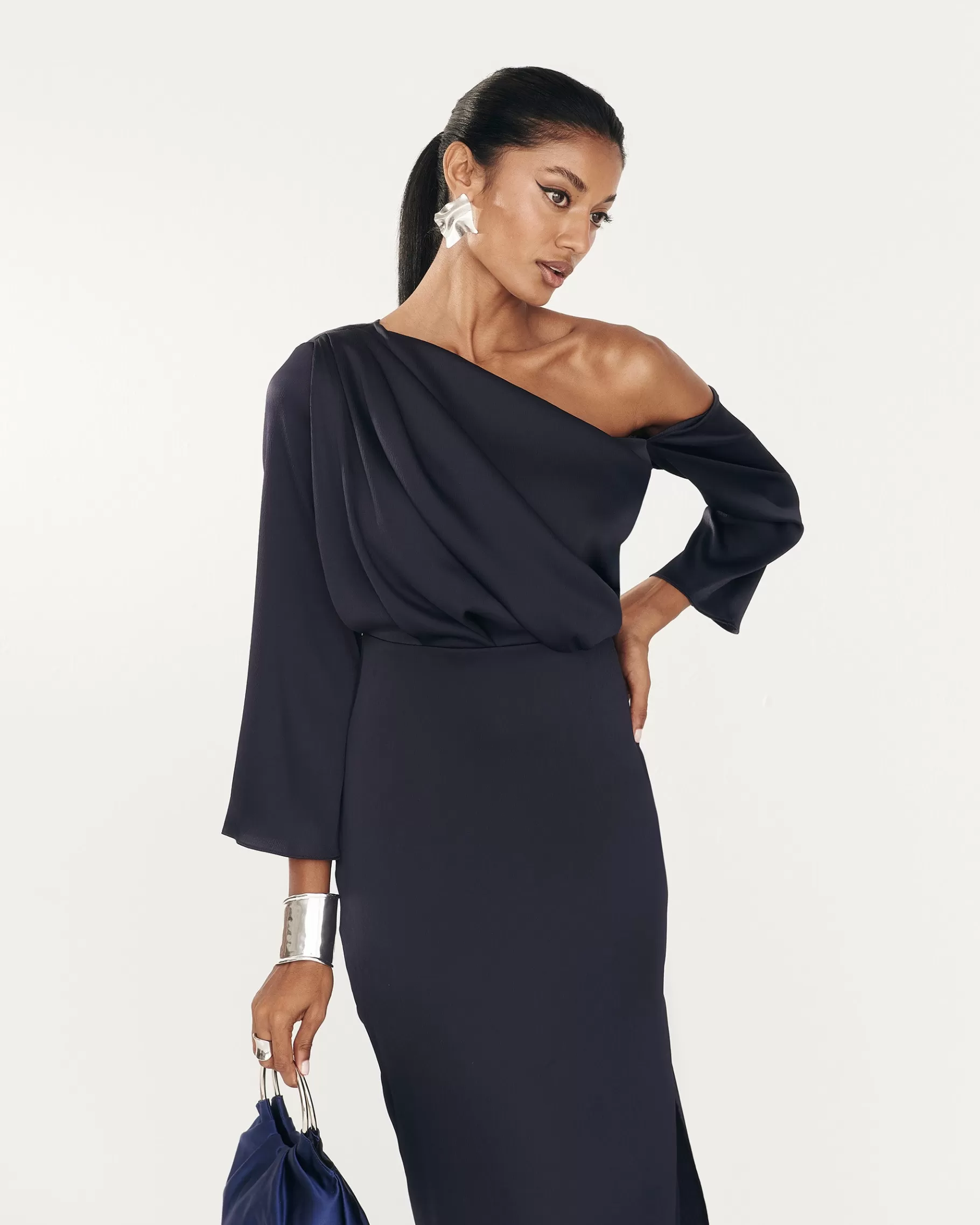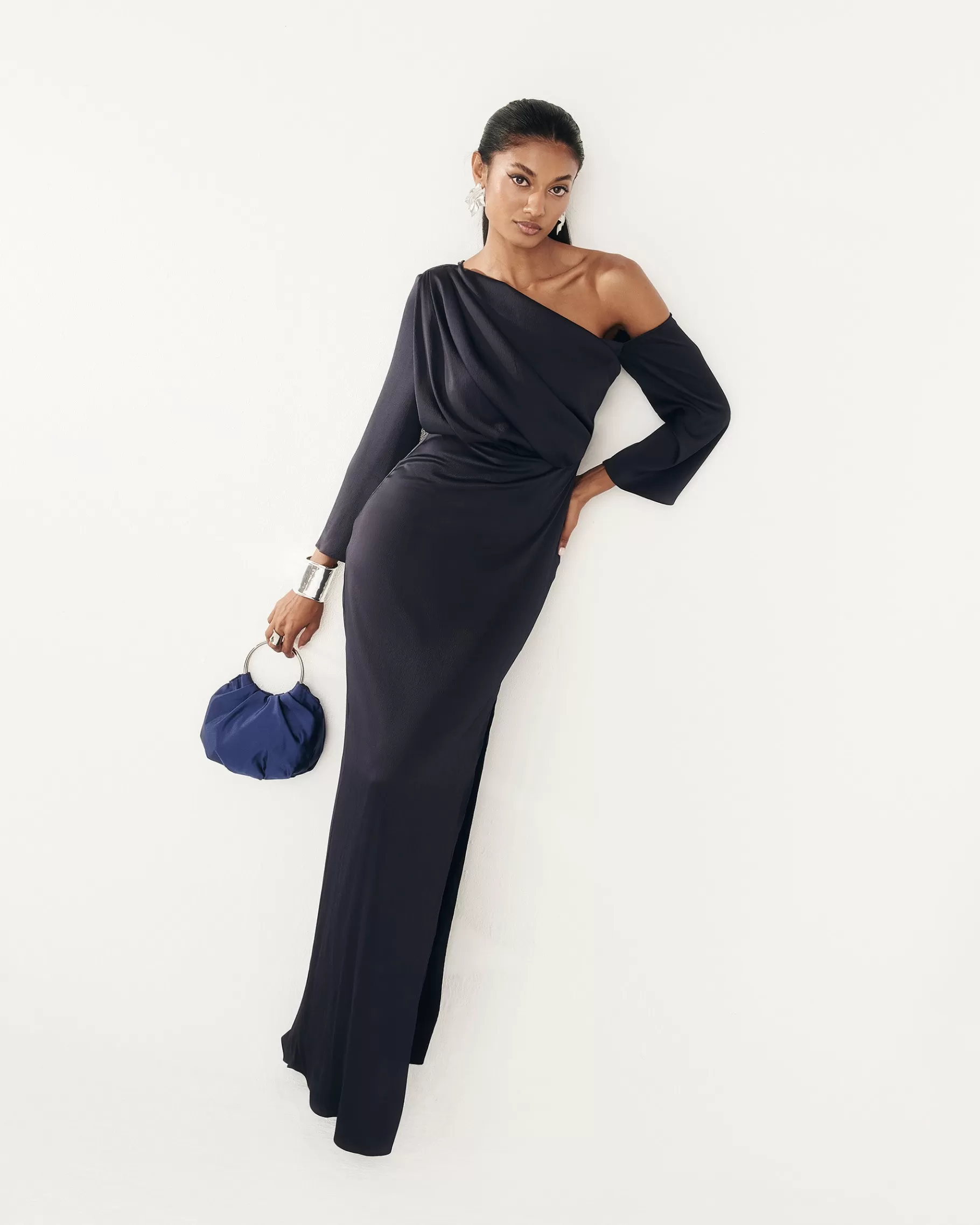 Vestido largo con escote asimétrico, drapeado en la parte delantera y abertura lateral.