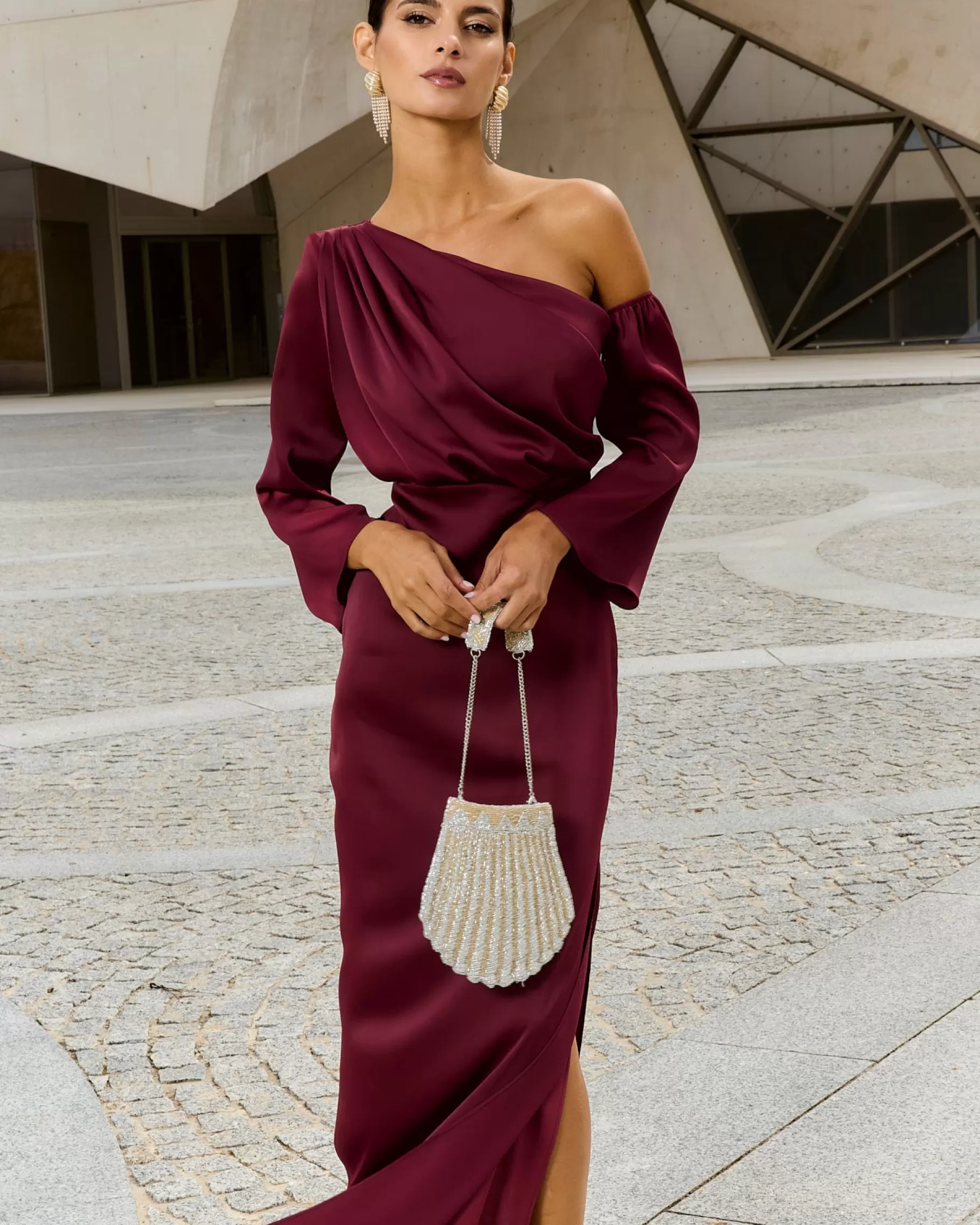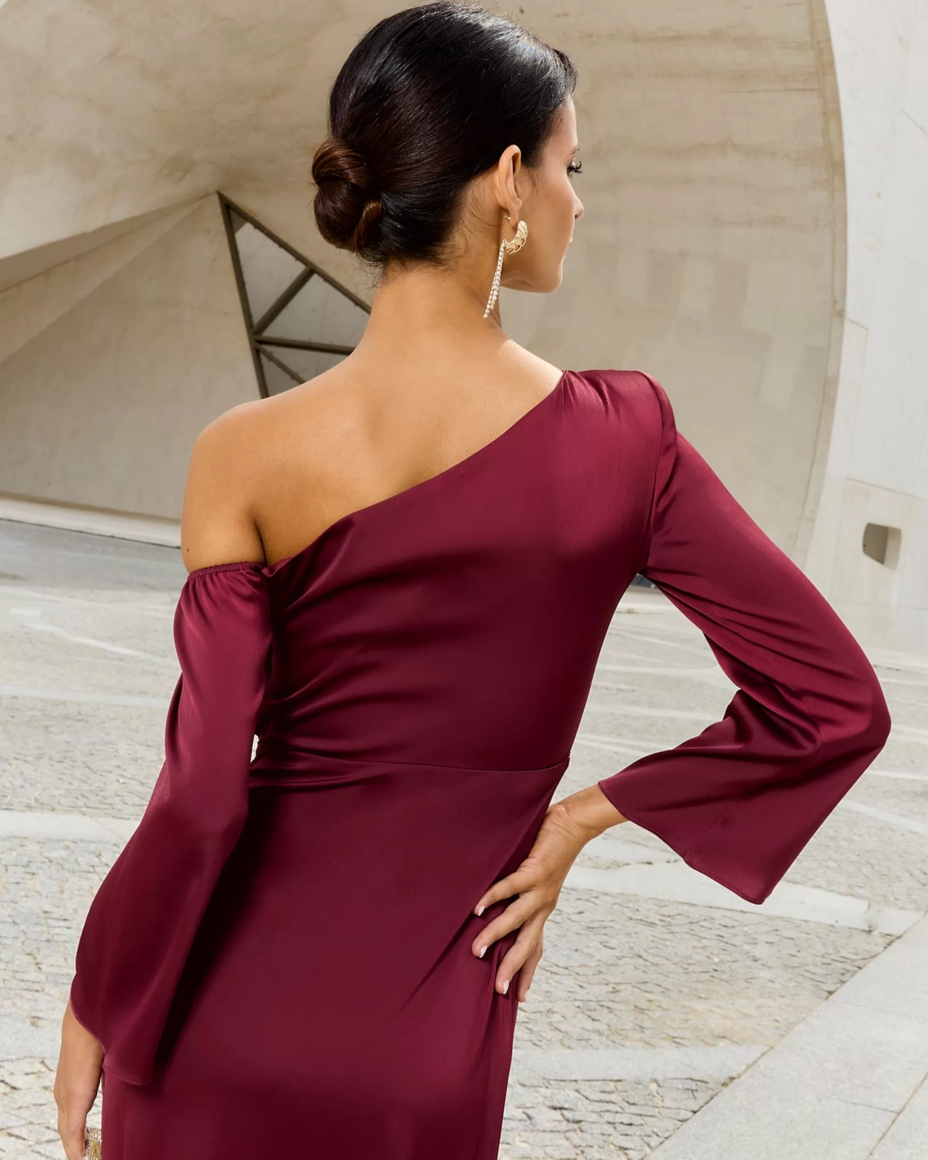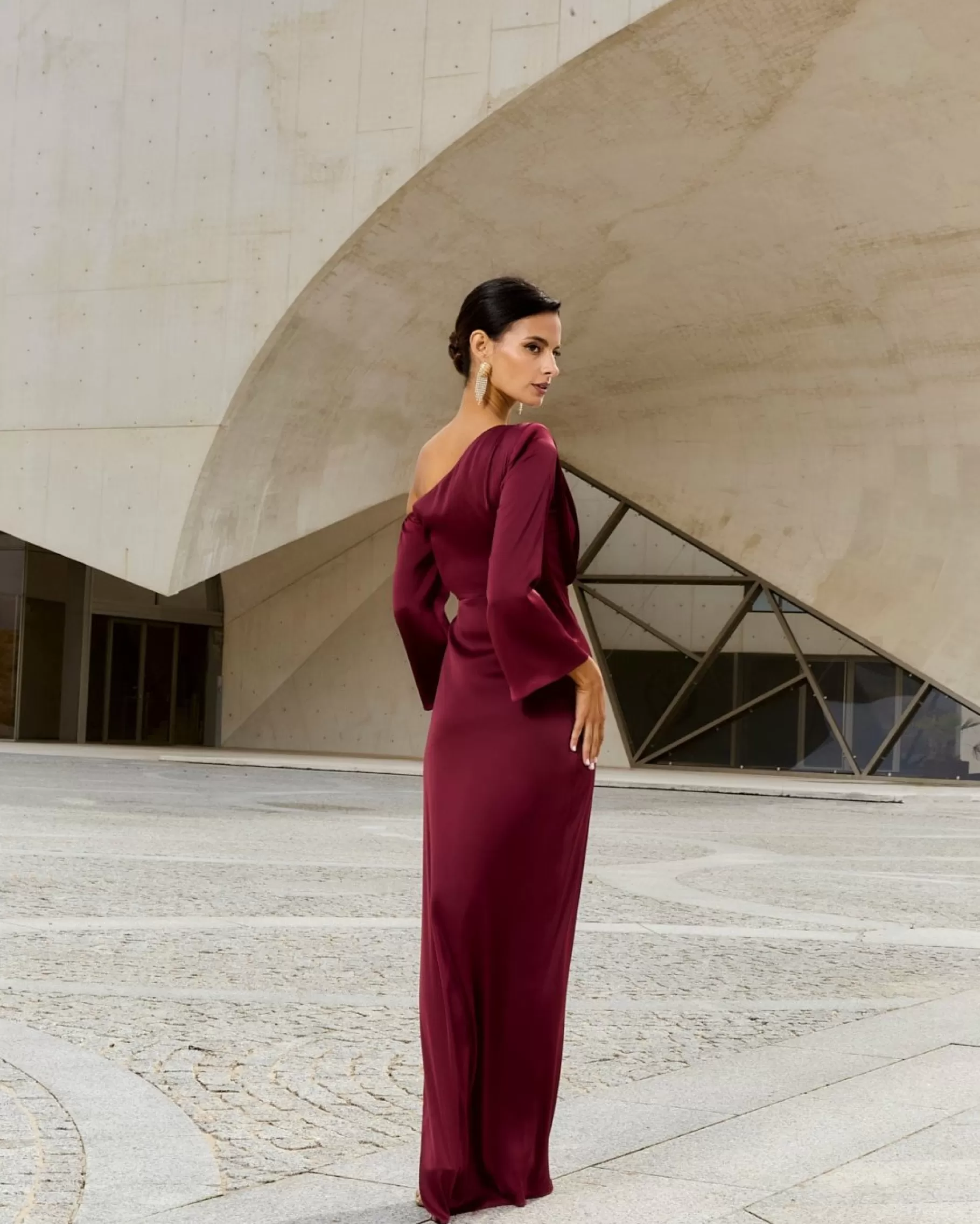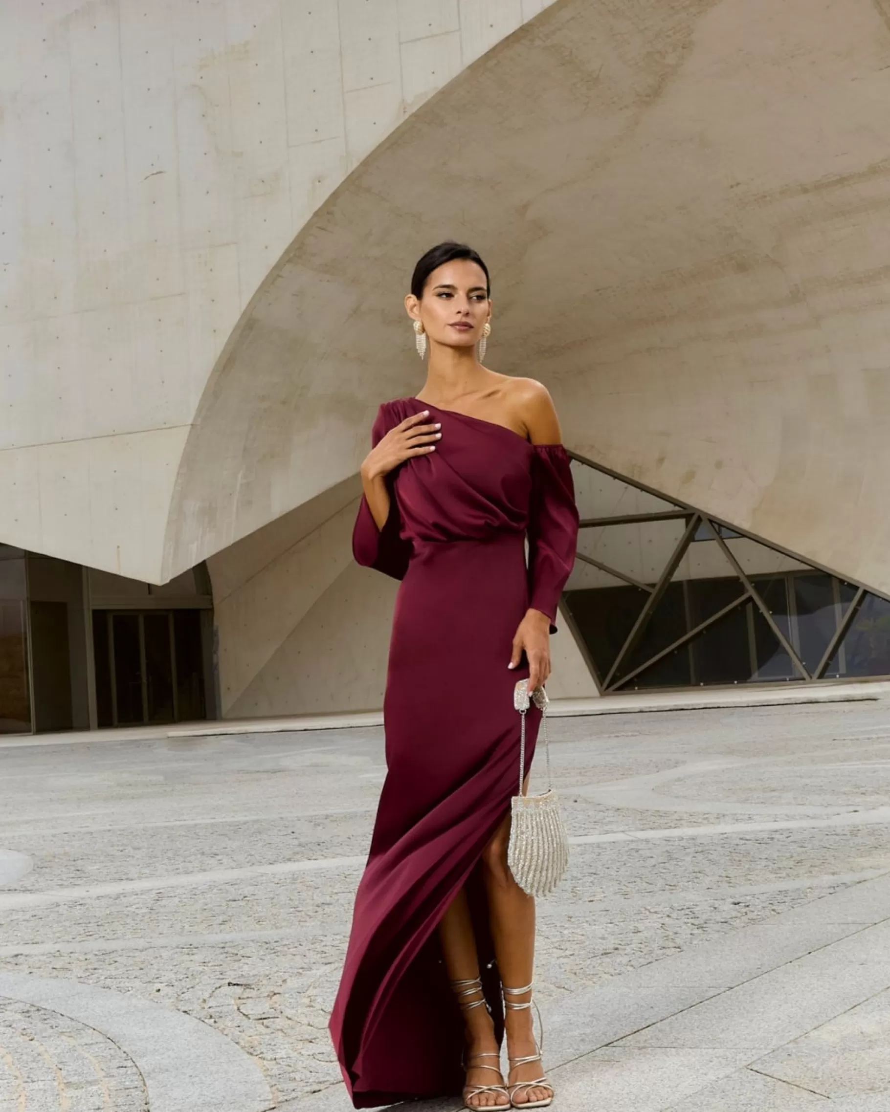 Vestido largo con escote asimétrico, drapeado en la parte delantera y abertura lateral.